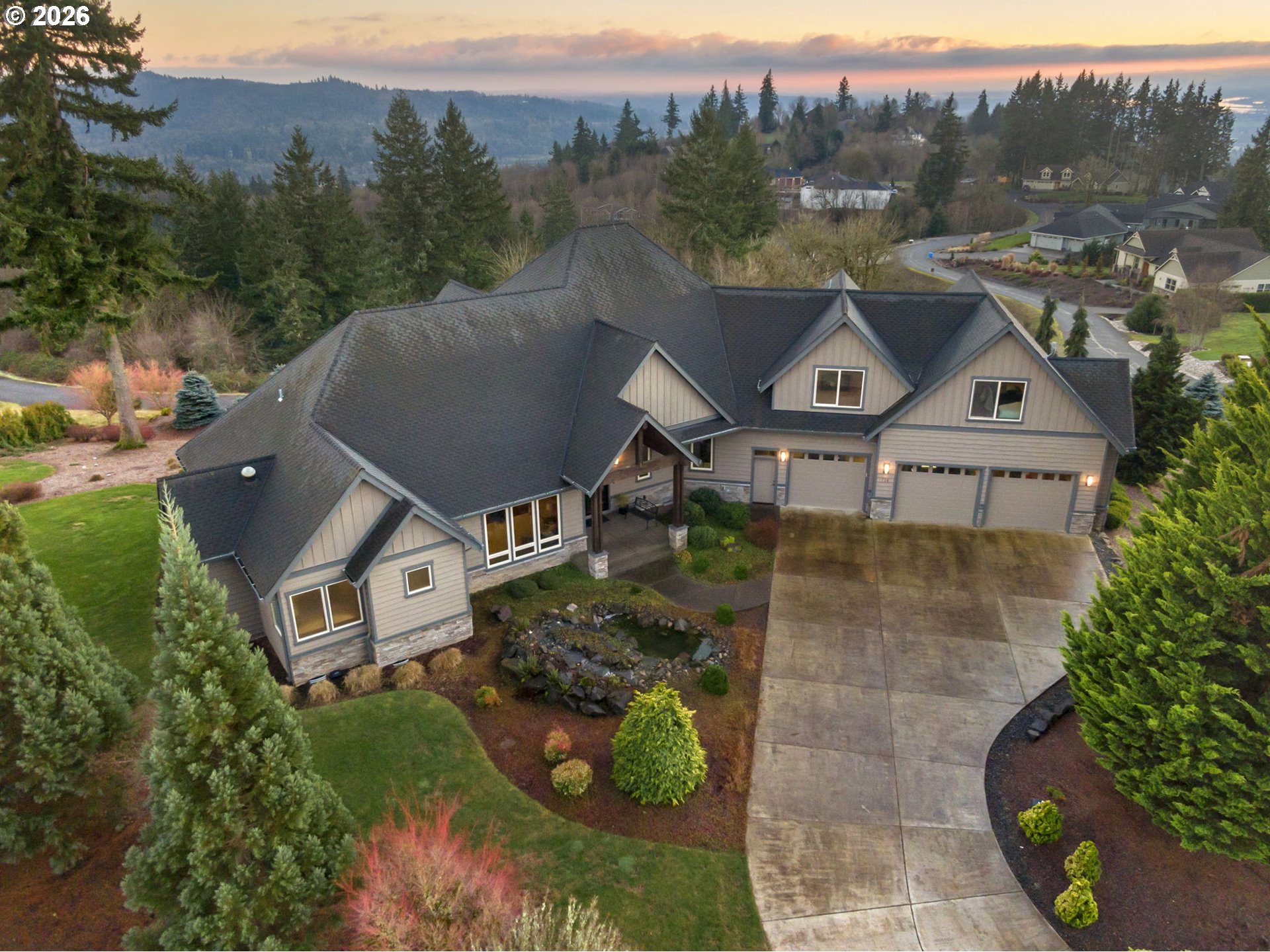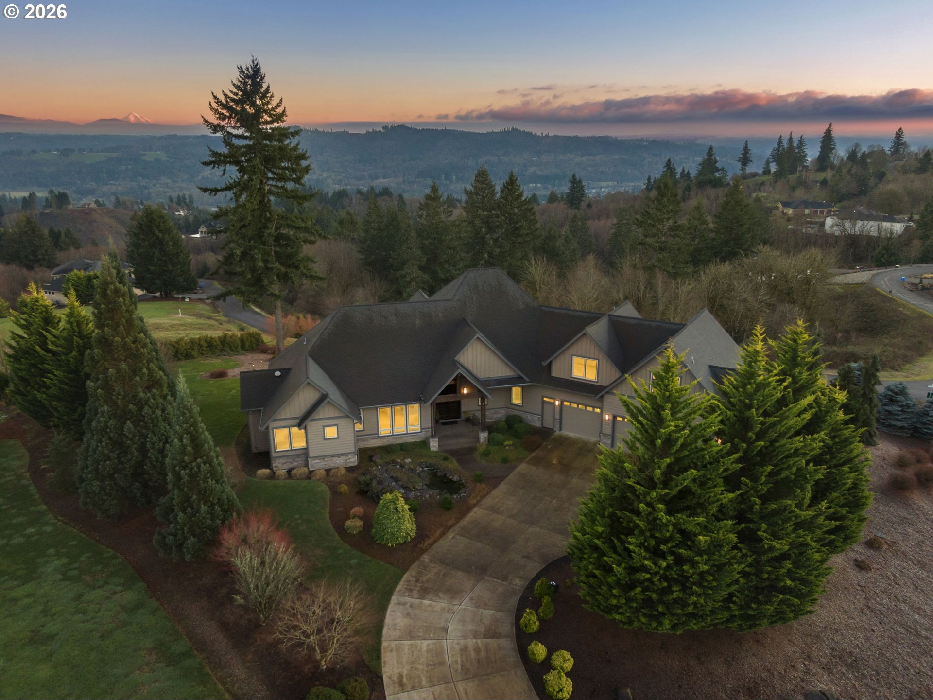Enjoy sweeping views of Mt. Hood and surrounding pine forests from this custom home on 9.06 acres in a private gated community. Architect-designed, the home features distinctive 7/8" wavy cedar siding, soaring 24' vaulted ceilings, and cathedral windows that bring in abundant natural light. The main-level primary suite offers dual walk-in closets, a fireside sitting area, heated floors, and a spa-like bath with a river rock walk-in shower. Fireplaces in the bedrooms provide added warmth and comfort. A main-floor office can also serve as a guest room or fourth bedroom. Brazilian cherry floors and custom millwork add warmth throughout. The chef’s kitchen includes dual ovens, a professional-grade range, and access to three decks, including one enclosed with glass sliders and a motorized screen for year-round use. Additional highlights include a private guest wing with its own living room, a 3-car garage with shop space, a whole-house generator, a private pool, and a peaceful outdoor water feature. The adjacent 5.02-acre lot is also available.