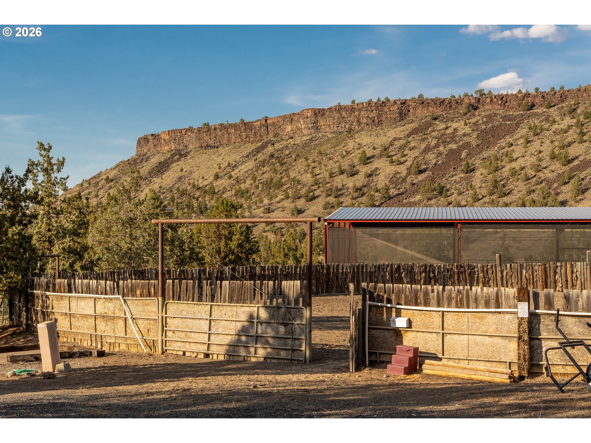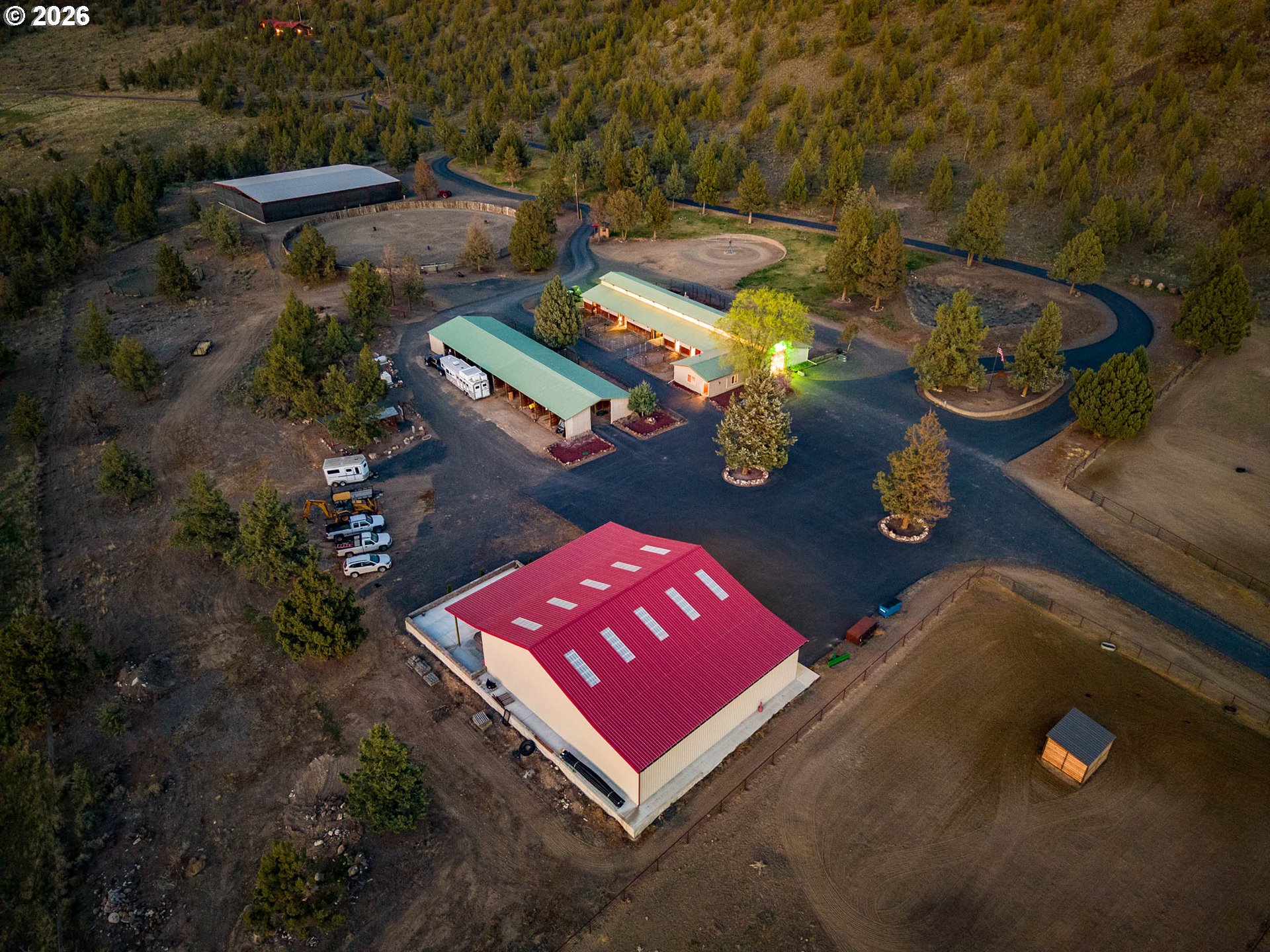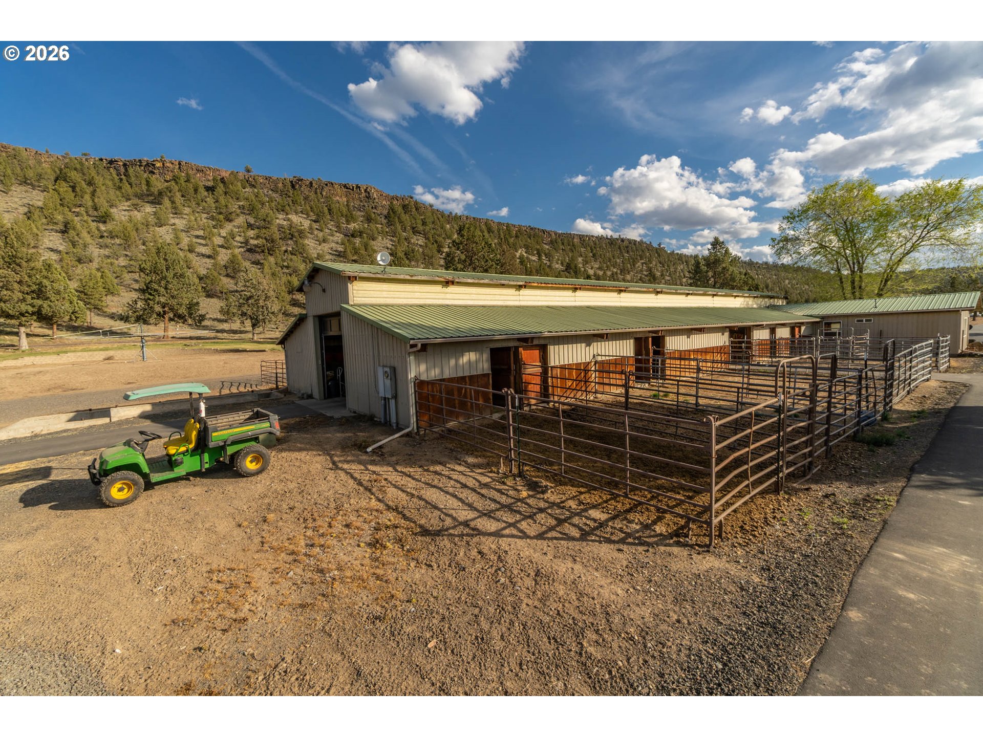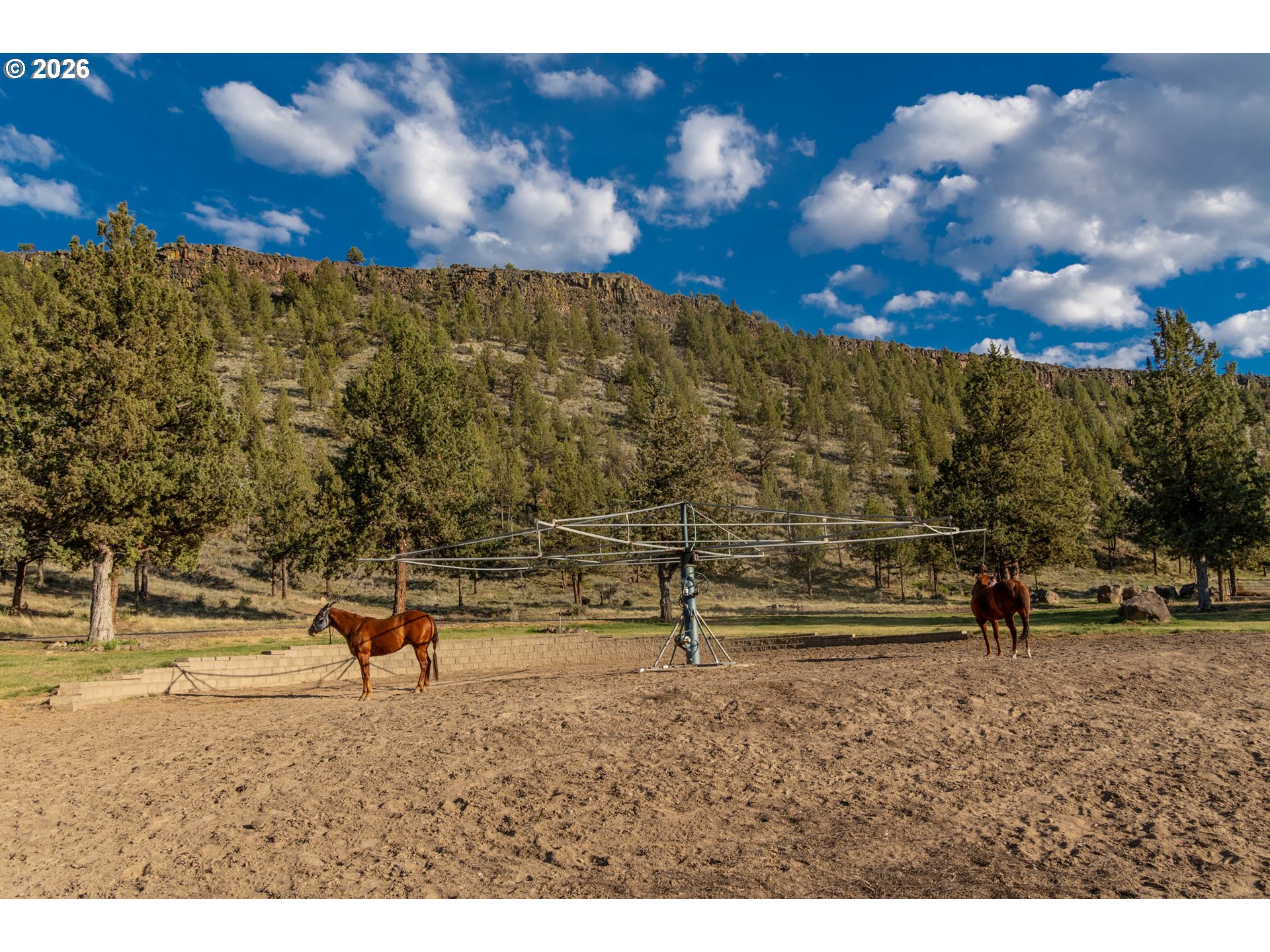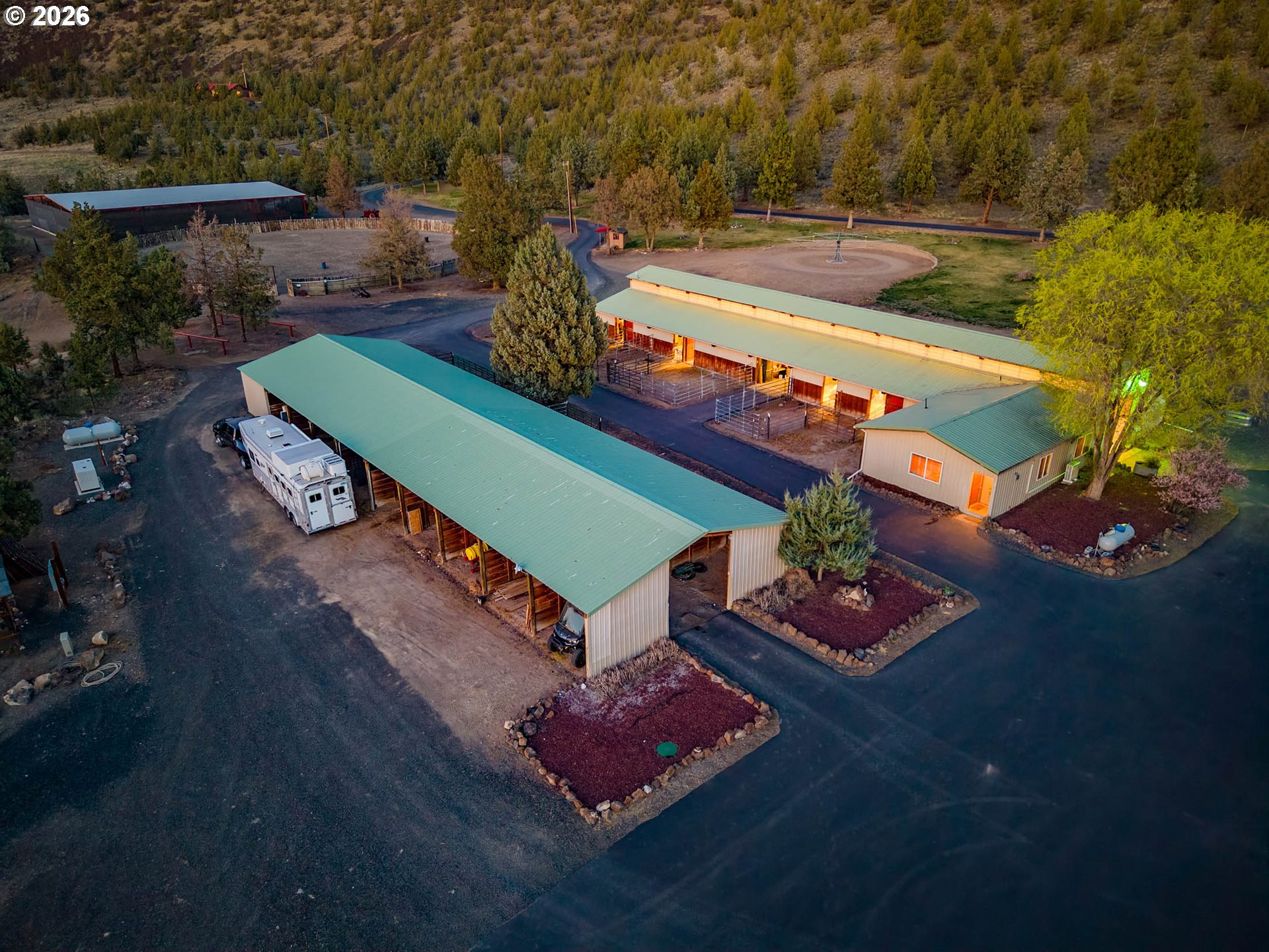 Crooked River Rim Horse Ranch offers 97.94± elevated acres overlooking the Crooked River Valley, positioned just 10 mins from Prineville. This horse property combines substantial infrastructure with convenient access. The 2,265± sq ft one-level home (2003) provides practical year-round living. An attached 832±sq ft garage includes a heated/cooled loft for workspace or guests. Horse infrastructure includes: main barn with 13 stalls, tack areas, feed room, and integrated living quarters. A 12,000± sq ft covered arena. A 175' round pen and an additional small round pen complete the setup. Welded pipe corrals and feedlot with 250± feet of bunk space support livestock handling. Water security is solid: 6.1± acres of irrigation rights through Ochoco Irrigation District, two domestic wells, and freeze-protected troughs ensure reliable year-round operation. A 4,320± sq ft hay storage and shop building includes an enclosed heated workspace. Built for a serious horse person to enjoy.
