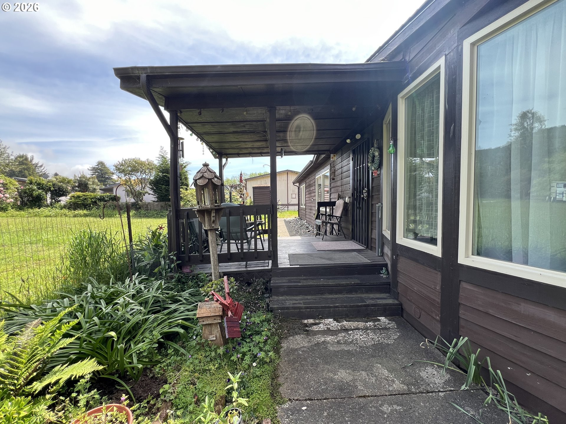 Most secluded for a mobile home park setting, a corner lot of a cul-de-sac. One of a kind porch-deck with private garden setting. Spacious kitchen, new roof (2years) Remodeled bathroom. New washer & dryer, New Paint. Large work/craft shop.