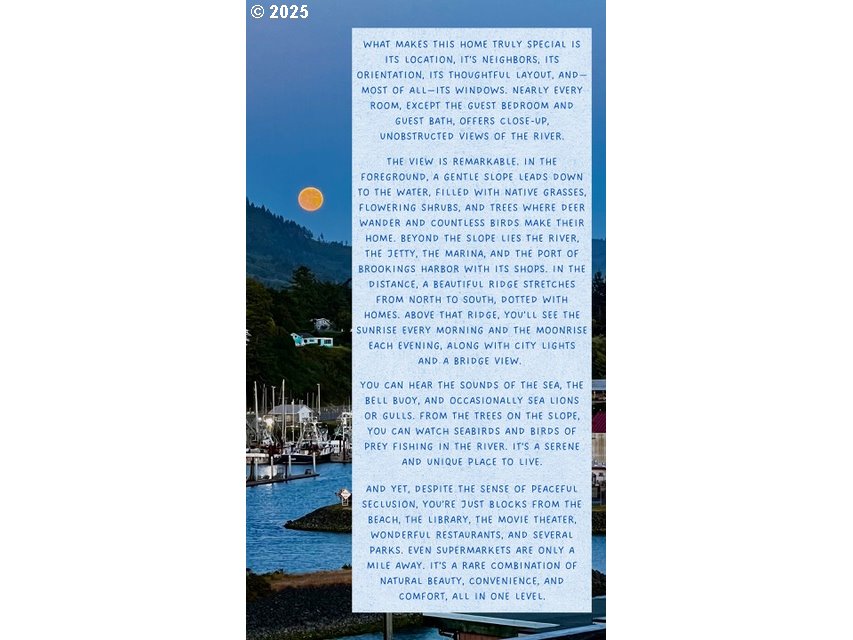 ONE-OF-A-KIND HOME LOCATED IN THE HEART OF BROOKINGS! Enjoy breathtaking, panoramic views of the Chetco River, Port of Brookings-Harbor, and the Pacific Ocean from every room in this charming home. Nestled in a friendly cul-de-sac, this 2 bedroom, 2 bath retreat offers both privacy and convenience, just minutes from beaches, shops, and dining. The vaulted-beam back room provides a serene escape along with a cozy living room to have a crackling fire for a rainy day. This well cared for home features new siding, CertainTeed Presidential Roofing, skylights, vinyl windows, a French door refrigerator, stove, and a 220V EV charger. The 516 sq ft open concept guesthouse features a glass door opening to a spacious deck, a custom kitchenette that includes a farmhouse sink with butcher block counters, and a luxurious bathroom. With modern upgrades, incredible views, and an unbeatable location, this beautiful home is a rare Brookings opportunity.