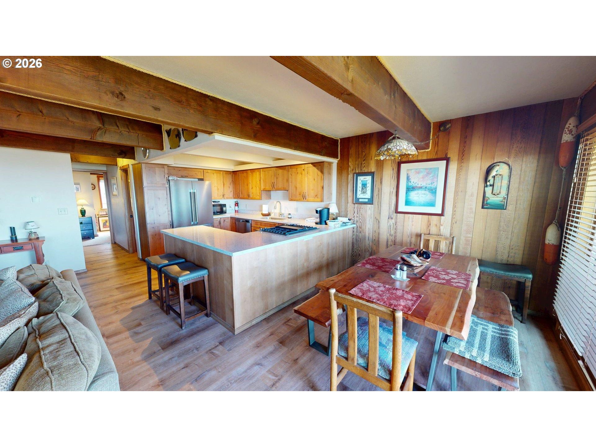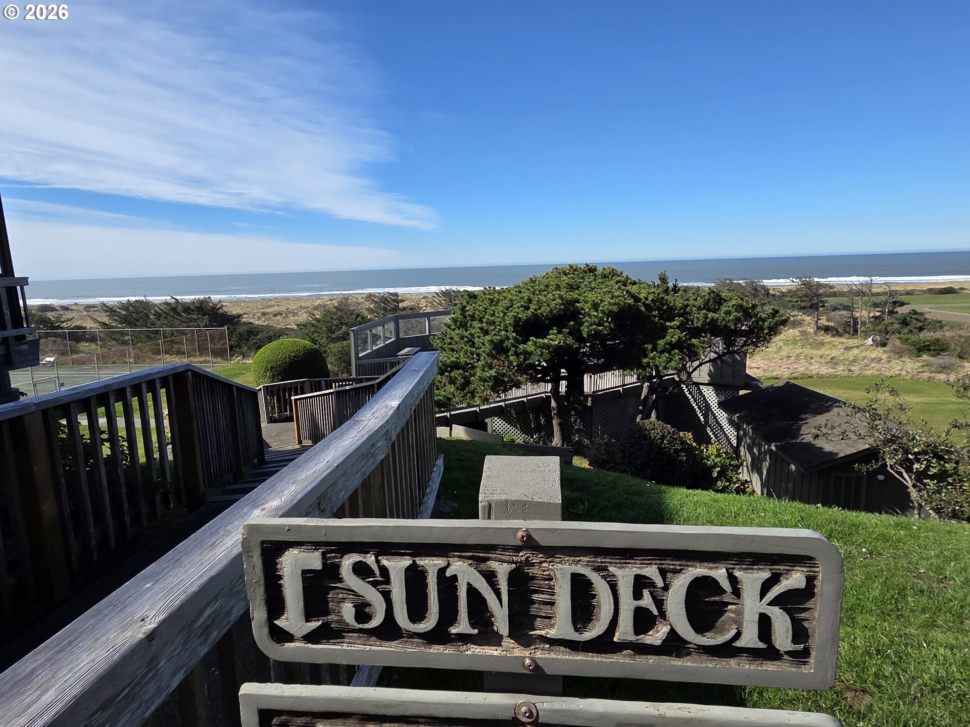 Beautifully Updated, Main-Level Oceanfront Condo! Enjoy effortless coastal living in this beautifully updated 2BR/1BA oceanfront unit. Perfectly positioned on the main level, this condo offers easy access and stunning ocean views from your private deck. Inside, you’ll find warm wood floors, a tiled entry, and charming ceiling beams that add character to the living space. The propane fireplace creates a cozy atmosphere for relaxing evenings by the sea. A sliding glass door from the living/dining area opens to a spacious ocean view deck—ideal for morning coffee, sunset watching, and listening to the waves roll in.The updated kitchen features wood cabinetry, granite countertops, and stainless appliances including a gas stove, dishwasher, and large refrigerator—perfect for everyday living or entertaining. The bathroom is equally impressive with a large two-person tiled shower featuring dual showerheads, gorgeous tile work, and a spacious granite-topped vanity. Both bedrooms are comfortably sized with carpeting and closets. A stackable washer/dryer is conveniently located in the unit. Designated parking, a storage unit and access to a large workshop and sun deck/tennis court are included. Offered furnished and move-in ready, this is your opportunity to own a beautifully appointed oceanfront getaway—whether for full-time living or your own coastal retreat.