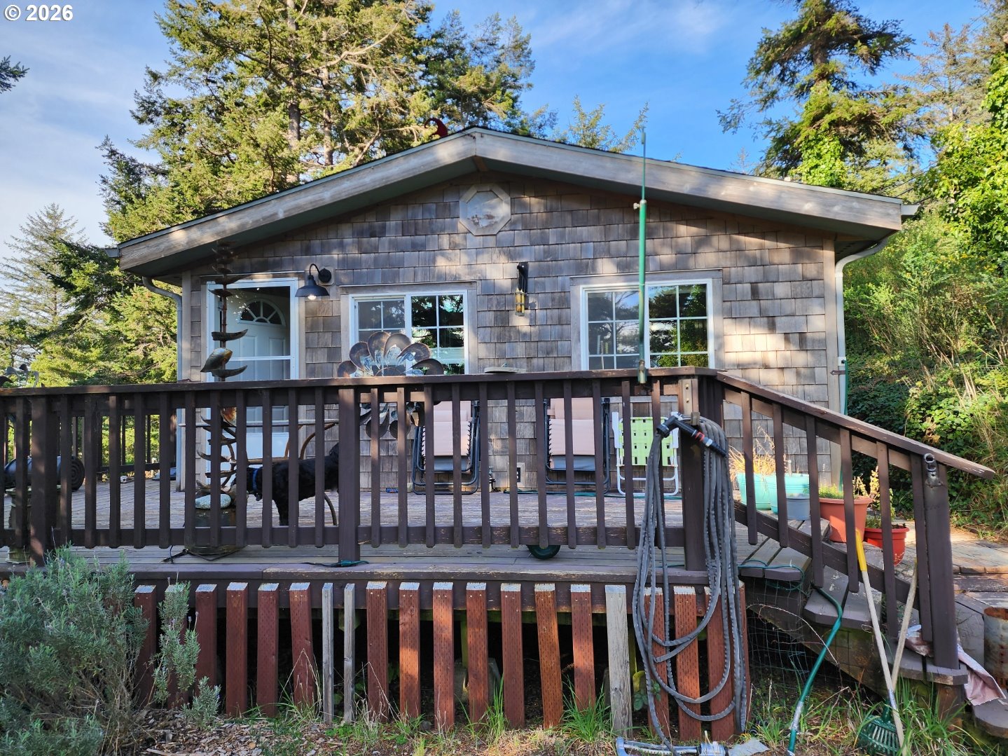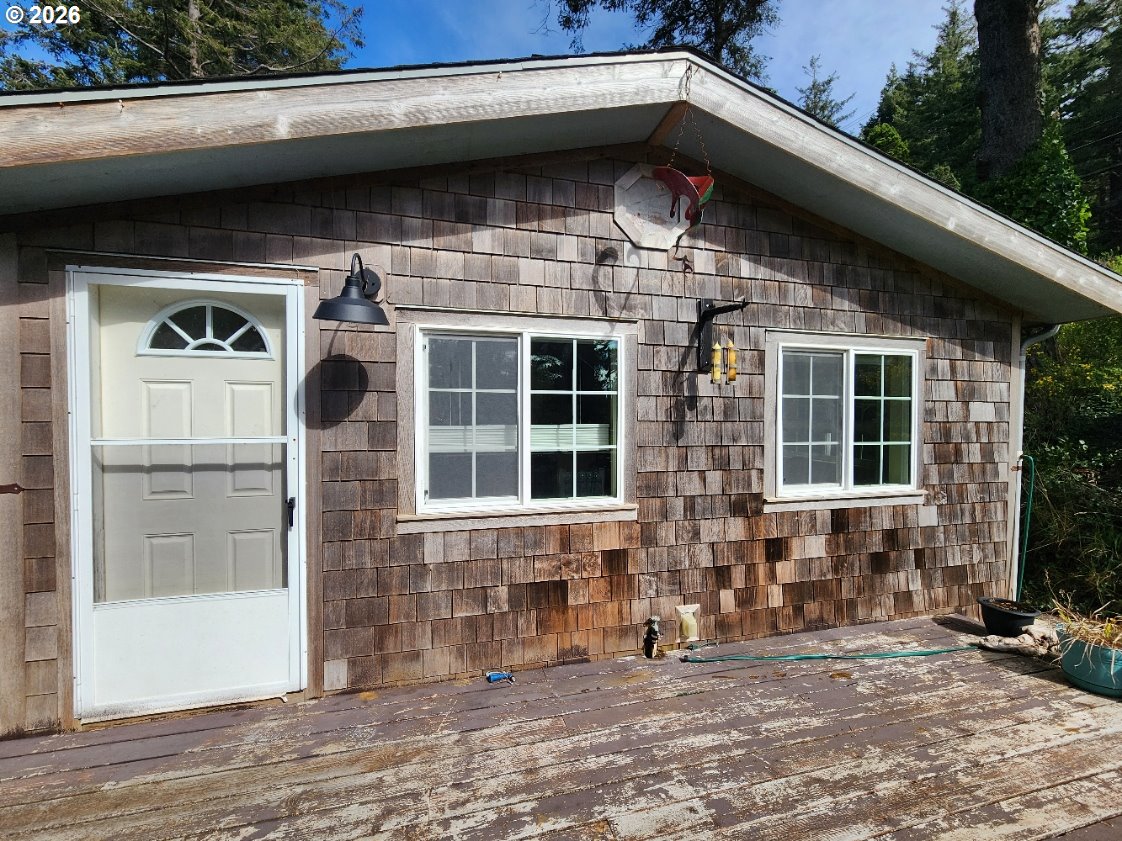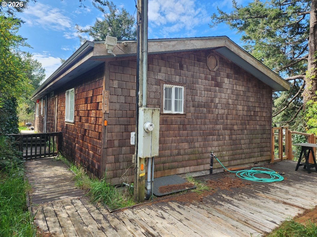 Enjoy coastal living in this charming 3 bedroom, 2 bathroom home conveniently located in town on the beautiful Oregon Coast—and safely out of the tsunami zone. The home offers flexible living space, including one bedroom featuring a Murphy bed, making it perfect for guests or easily converted into a home office. Step outside to enjoy the large deck, ideal for relaxing, entertaining, or catching the fresh coastal air. The property also includes a workshop with a half bath, a storage shed, and two separate property entrances, offering excellent access and versatility. Exterior features include classic cedar shake siding that complements the coastal setting. From the property, you’ll even catch a peek-a-boo ocean view, and you’re just minutes from local ocean beaches. Whether you're looking for a full-time residence, coastal getaway, or a home with workspace potential, this property offers comfort, flexibility, and location.