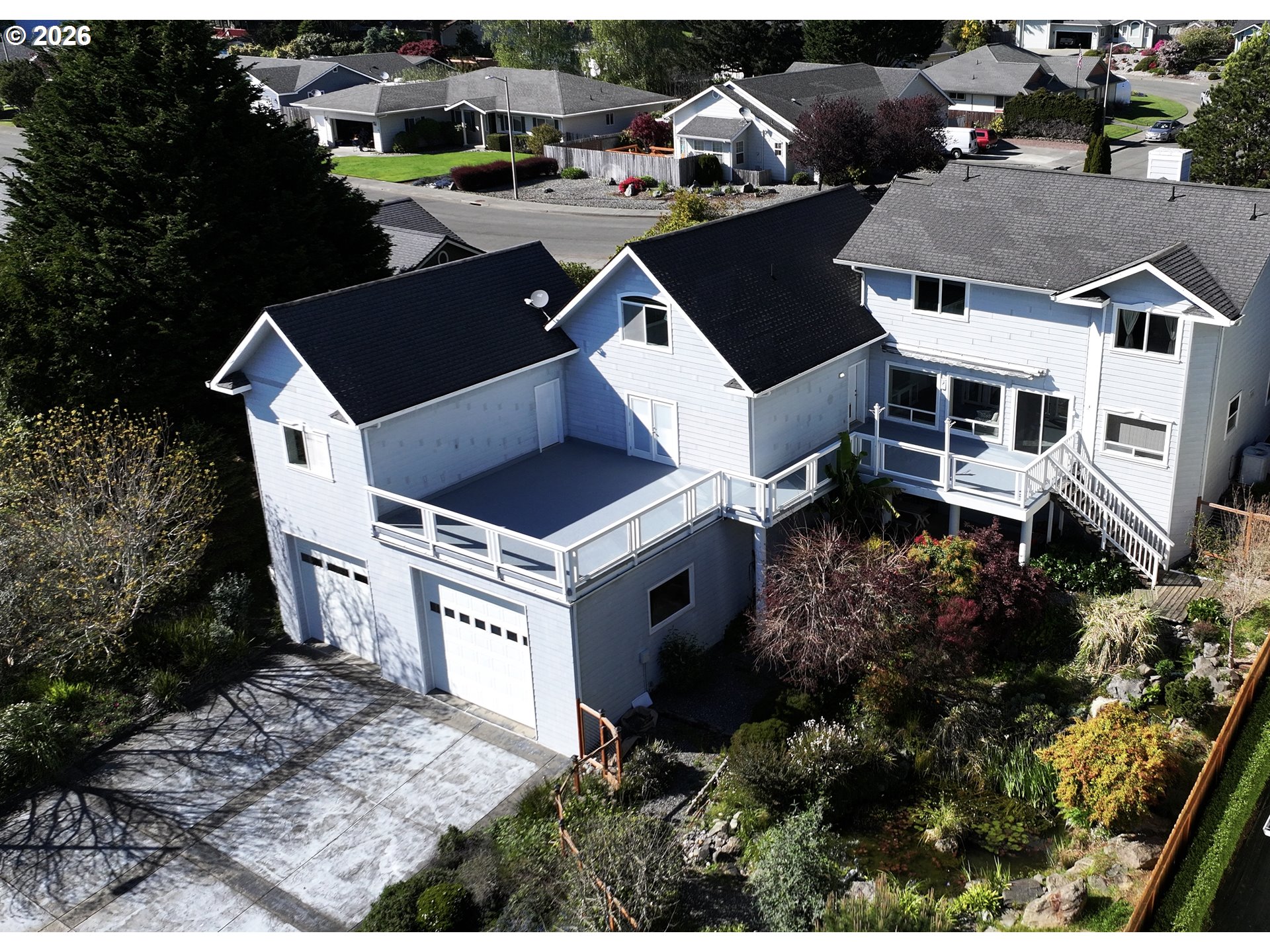 Oceanview Custom-Built Home with Rare Construction. Ocean views set the tone for this 4-bedroom, 3.5-bath custom-built home with outstanding curb appeal in a great location. Beautiful covered patio entrance. Vaulted ceilings upstairs add volume, and two guest bedrooms share a Jack and Jill bathroom. The primary suite is spacious, featuring vaulted ceilings, dual vanities, a walk-in shower, and a walk-in closet.A stamped concrete driveway leads to the main garage, with a deep, level approach offering generous parking for guests.The property includes a 3-car garage and a standout RV garage with its own HVAC. Two oversized bays include one approximately 24’ x 70’ with a 14’ high by 16’ wide door, and a second at 16’ x 30’ with a 12’ high by 14’ wide door. Both offer around 16-foot ceilings, creating exceptional space for storage, hobbies, or even a possible pickleball setup.Built for long-term durability, this home features rare 1-foot-thick cement-constructed walls, Hardi Plank exterior, and a fiberglass roof. Inside, the granite kitchen and hardwood floors bring warmth and function, complemented by a dedicated office or den.On the main level, additional space in the garage is ideal for another primary suite, with a full bath already in place.The backyard is fenced and private, complete with a beautiful nature-inspired koi pond. The property borders two streets, including access from Hassett, with interior stairs connecting to the garage and shop areas for added convenience.Located just minutes from downtown, schools, local beaches, and shopping.A well-built home with presence. Located on the beautiful Oregon Coast. Ask to see the 3D tour. #SouthernOregonCoast #BrookingsOregon #OregonCoast #WildRiversCoast
