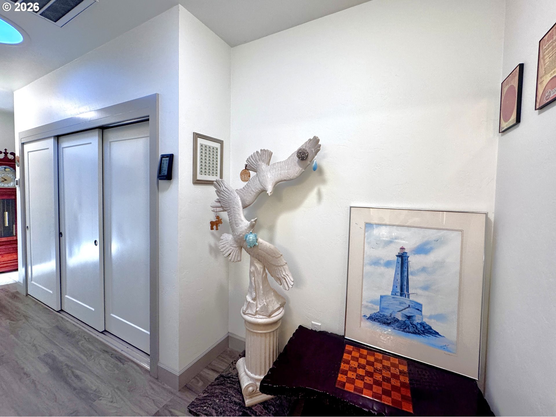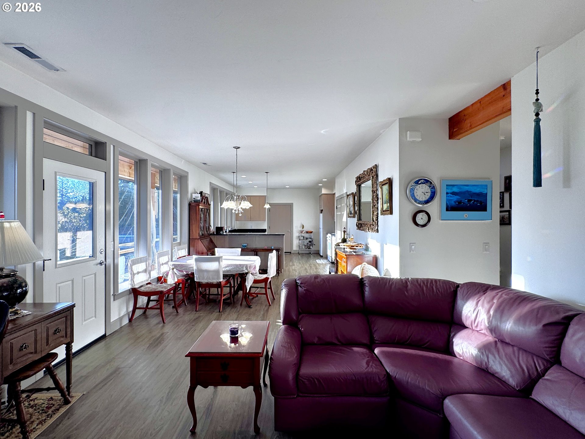 Light, Space, and a Hint of Ocean - Welcome Home. Coastal living at it's finest. Enjoy this newer, well-built home crafted by Zac Snow, showcasing quality construction and thoughtful details throughout. Eye-catching wood soffits and a substantial front porch finished with beefy 2" x 11.5" cedar planks create a welcoming first impression—designed to last a lifetime.Step inside to a light and airy open floor plan featuring luxury vinyl plank flooring throughout, high ceilings, and wide, wheelchair and walker-friendly doorways. The cozy living room is anchored by a propane fireplace with a tasteful granite surround, offering warmth and ambiance on coastal evenings.The dining area is filled with natural light from three large windows and flows seamlessly into the spacious kitchen. The kitchen is a standout with granite countertops, abundant wood cabinetry, a lazy Susan corner cabinet, a large pantry, and four oversized windows above the sink that bring the outdoors in. Appliances include a Samsung propane range with oven and microwave, plus a brand-new refrigerator.The wide 48-inch hallway leads to the bedrooms and baths and is enhanced by two solar tubes, keeping the home bright throughout the day. The primary bedroom is generously sized with a large closet and an en-suite bath featuring double sinks, granite countertops, ample cabinetry, and a walk-in shower. The guest bath offers a granite countertop, extra-tall cabinetry, and a shower/tub combination.Additional features include an extra-deep garage with a light commercial 10’ x 10’ door, a durable 50-year roof installed by Edwards Roofing, and a home elevation of approximately 290 feet. The front yard provides ample space for parking multiple vehicles, a trailer, or a small boat. A shared driveway serves an adjacent undeveloped lot.This well-designed home with ocean peaks blends comfort, durability, and coastal charm—an excellent opportunity for full-time living or a refined coastal retr