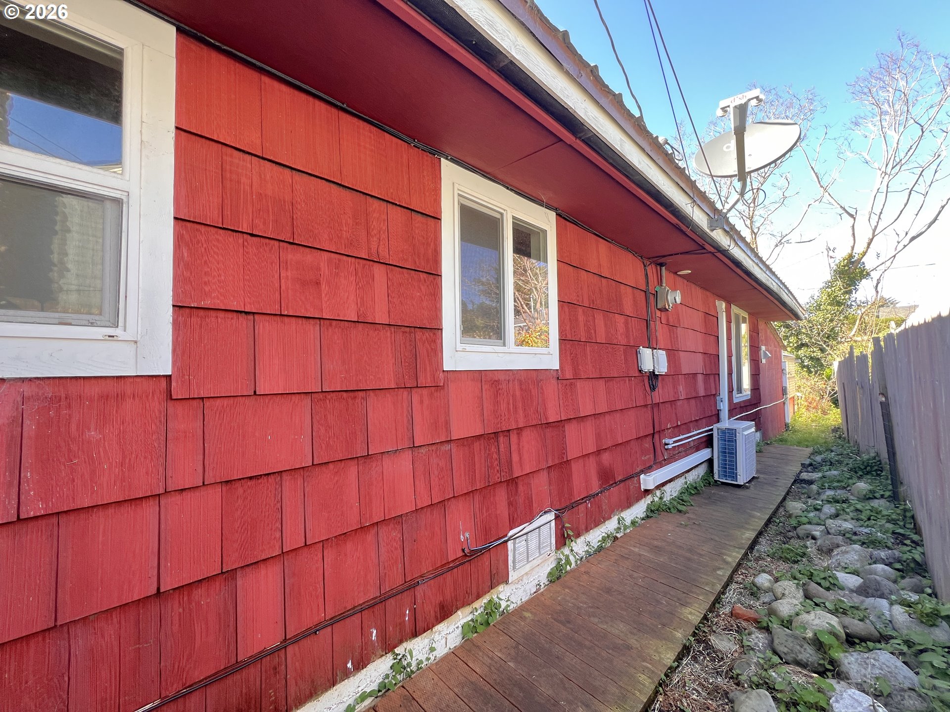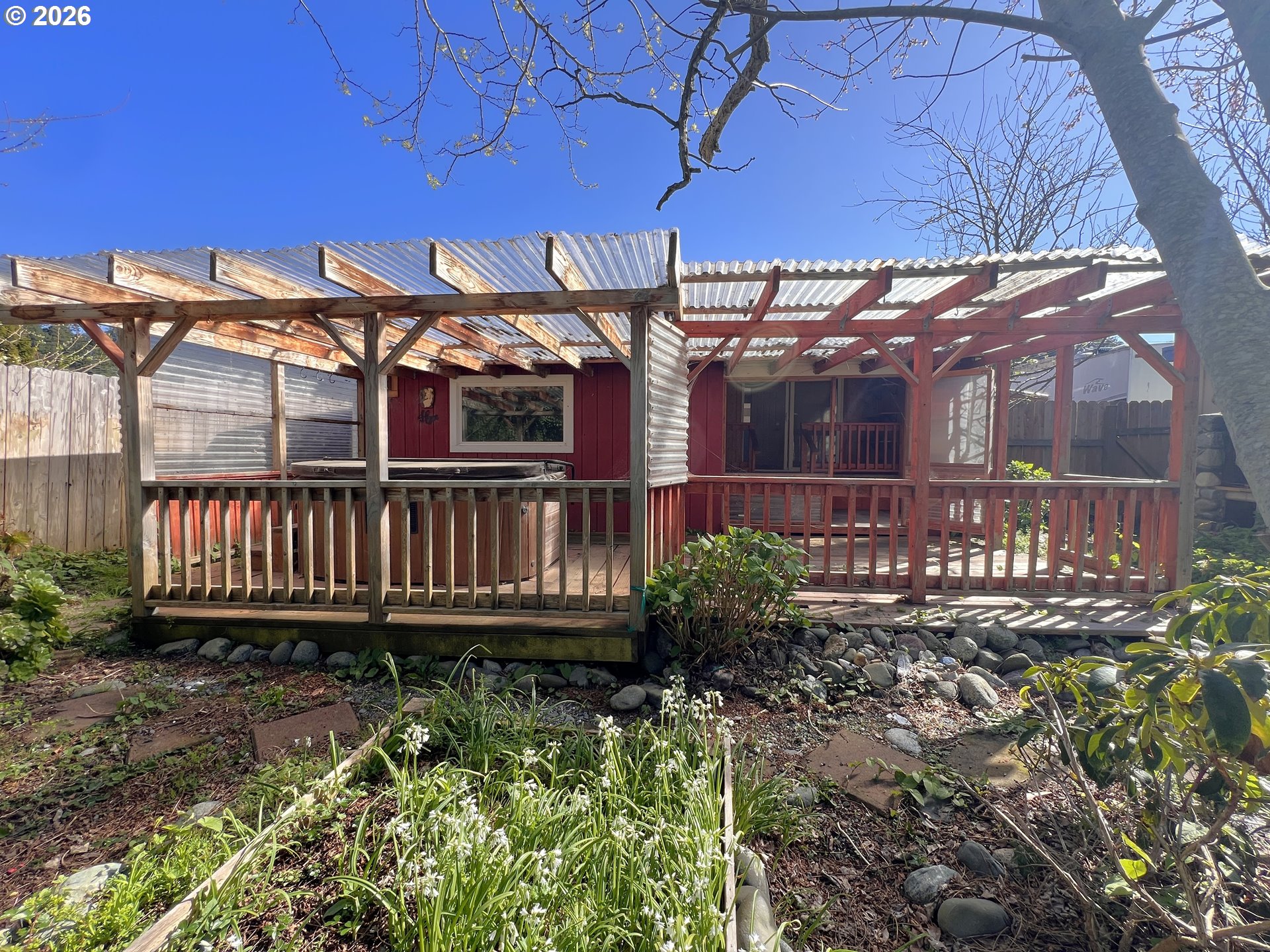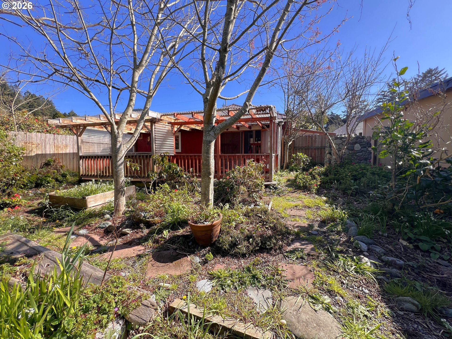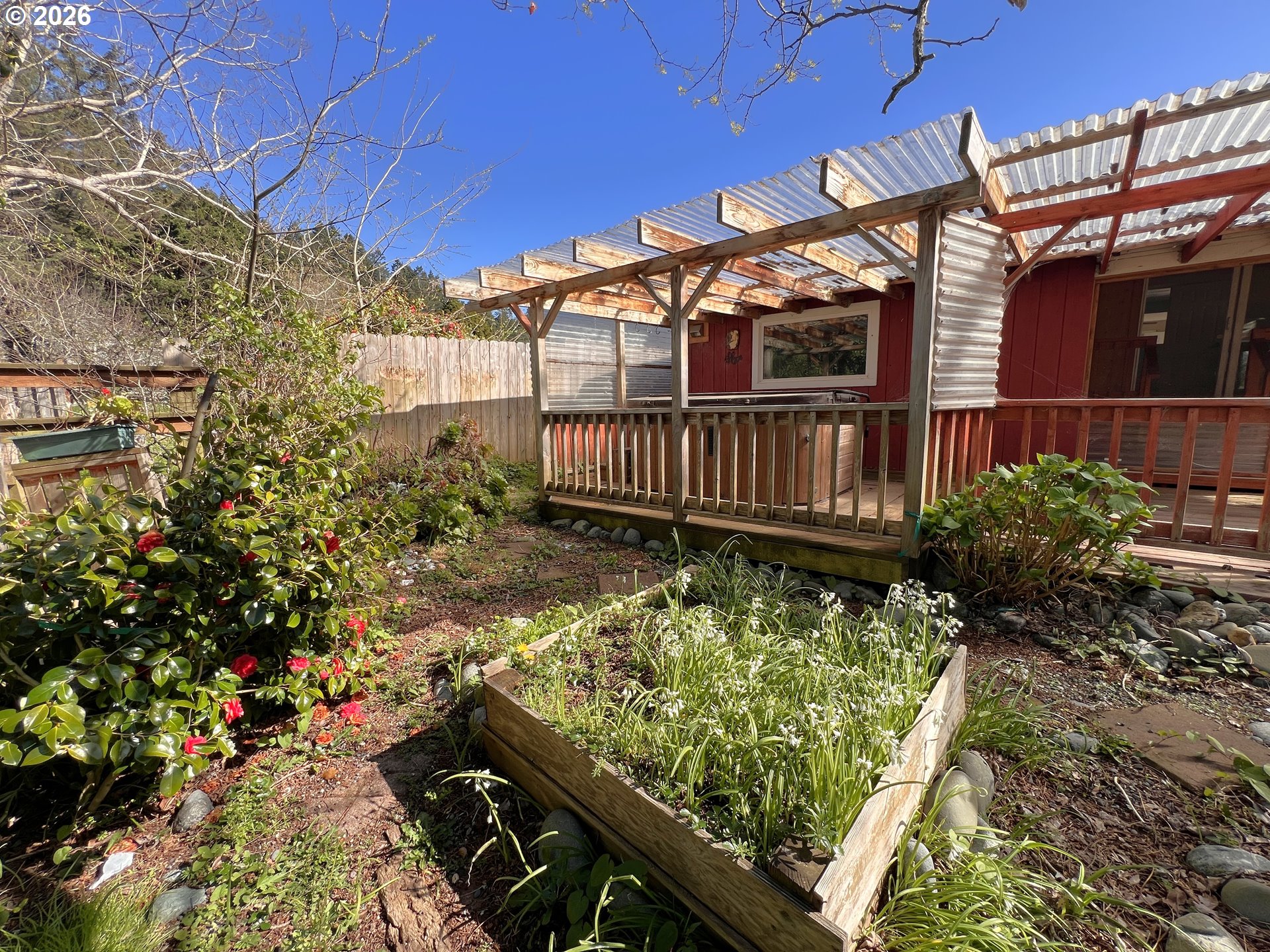 Just minutes from the beach, this charming coastal bungalow is a dream for anyone who loves gardening and outdoor living // Step into a bright and welcoming living room with many windows, a cozy fireplace with electric insert, and a built-in bookcase // The spacious kitchen features warm butcher block countertops, plentiful storage, and a dining area perfect for everyday meals // The generous primary suite showcases warm knotty pine tongue-and-groove accents, ensuite bathroom with jetted tub and French doors leading to an additional sitting room—perfect for a home office, reading space, or hobby room // Outside, the backyard creates a peaceful retreat with a covered deck and hot tub where you can relax while listening to the gentle sounds of the year-round creek // Garden enthusiasts will appreciate the greenhouse, raised garden beds, and a variety of fruit trees // If you’ve been dreaming of a cozy coastal retreat surrounded by nature, this charming bungalow is ready to welcome you home.
