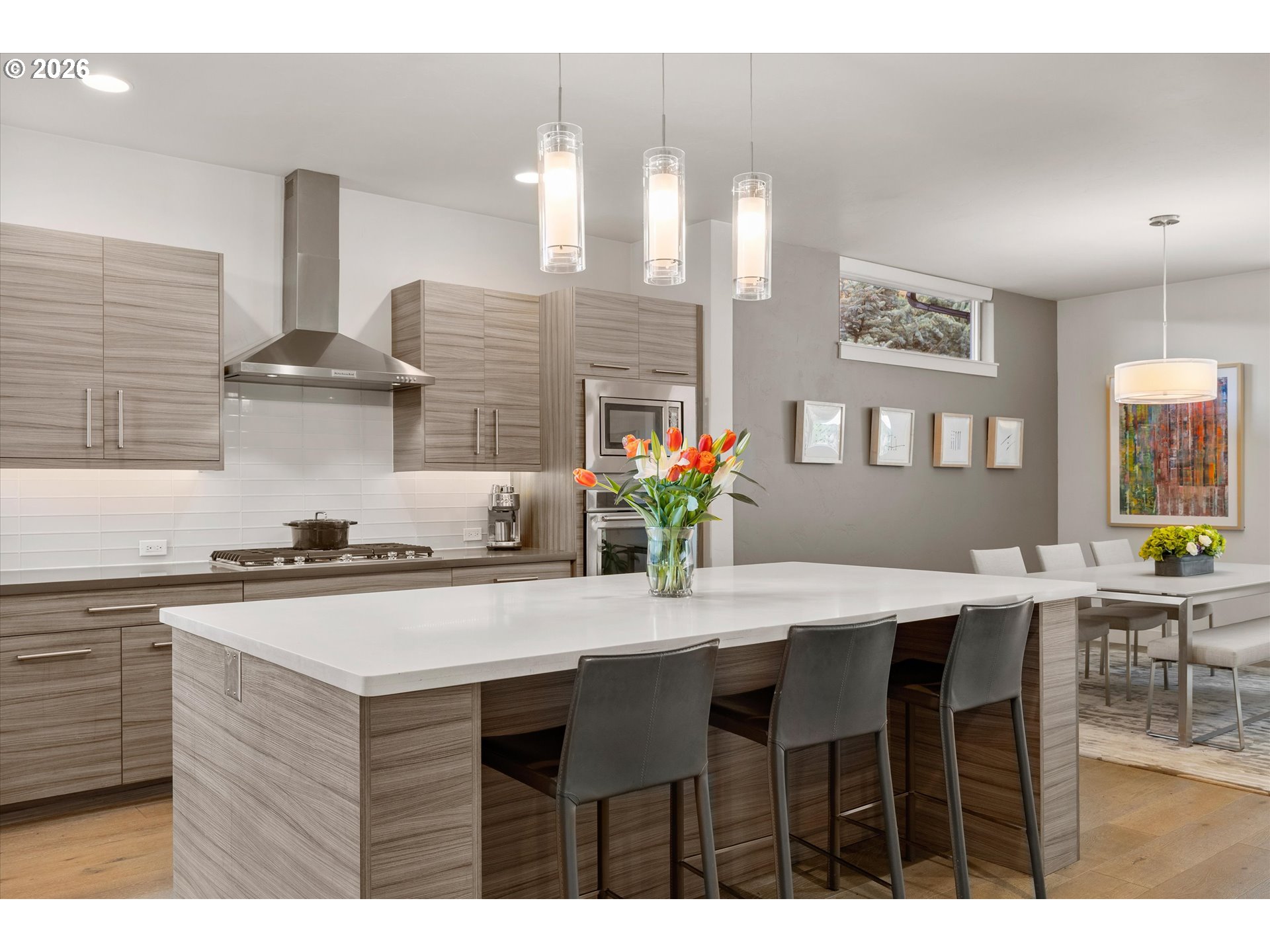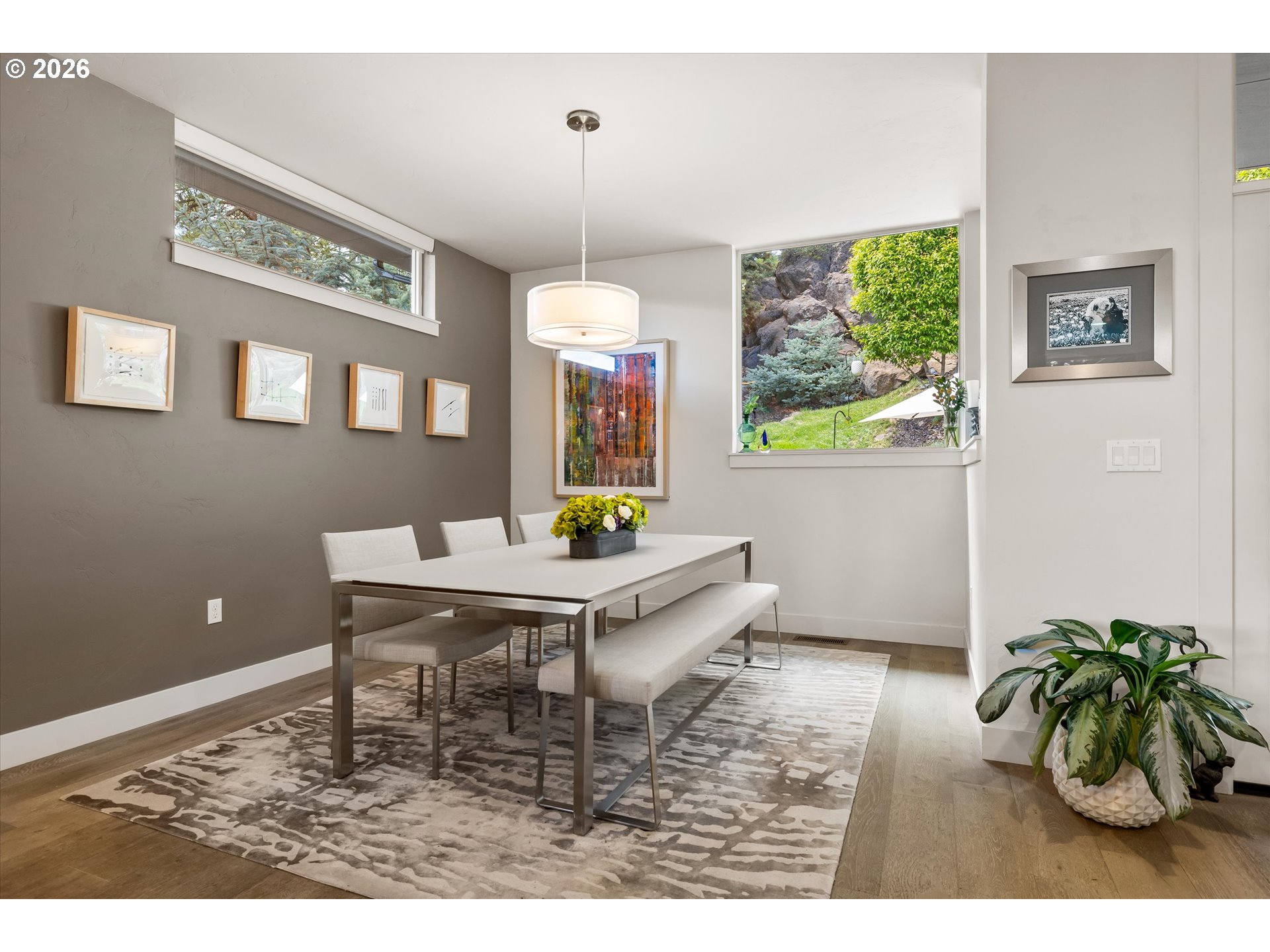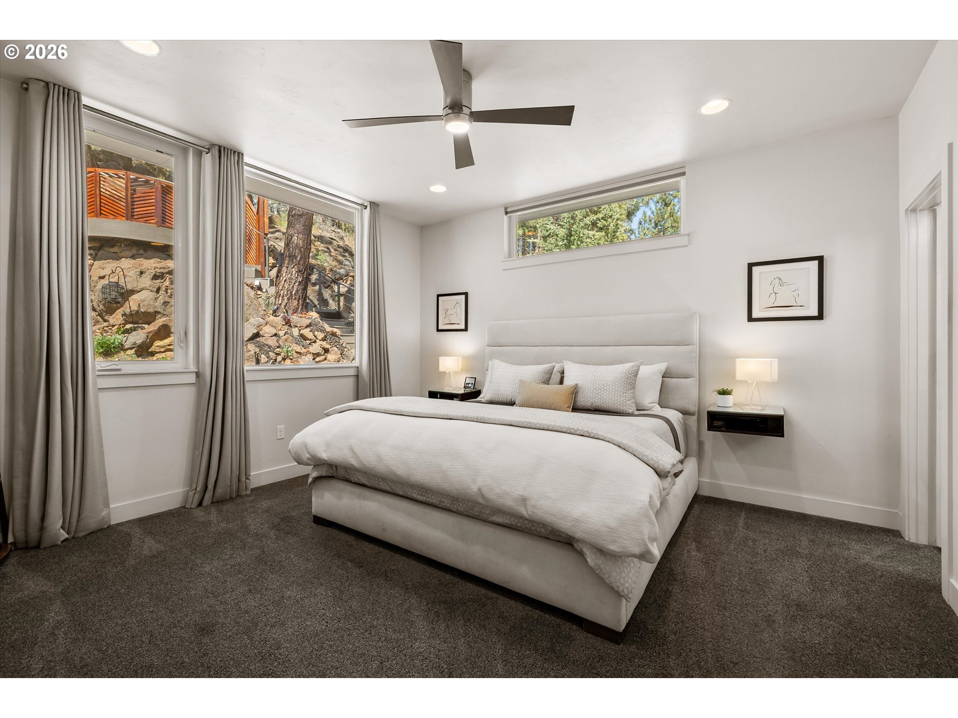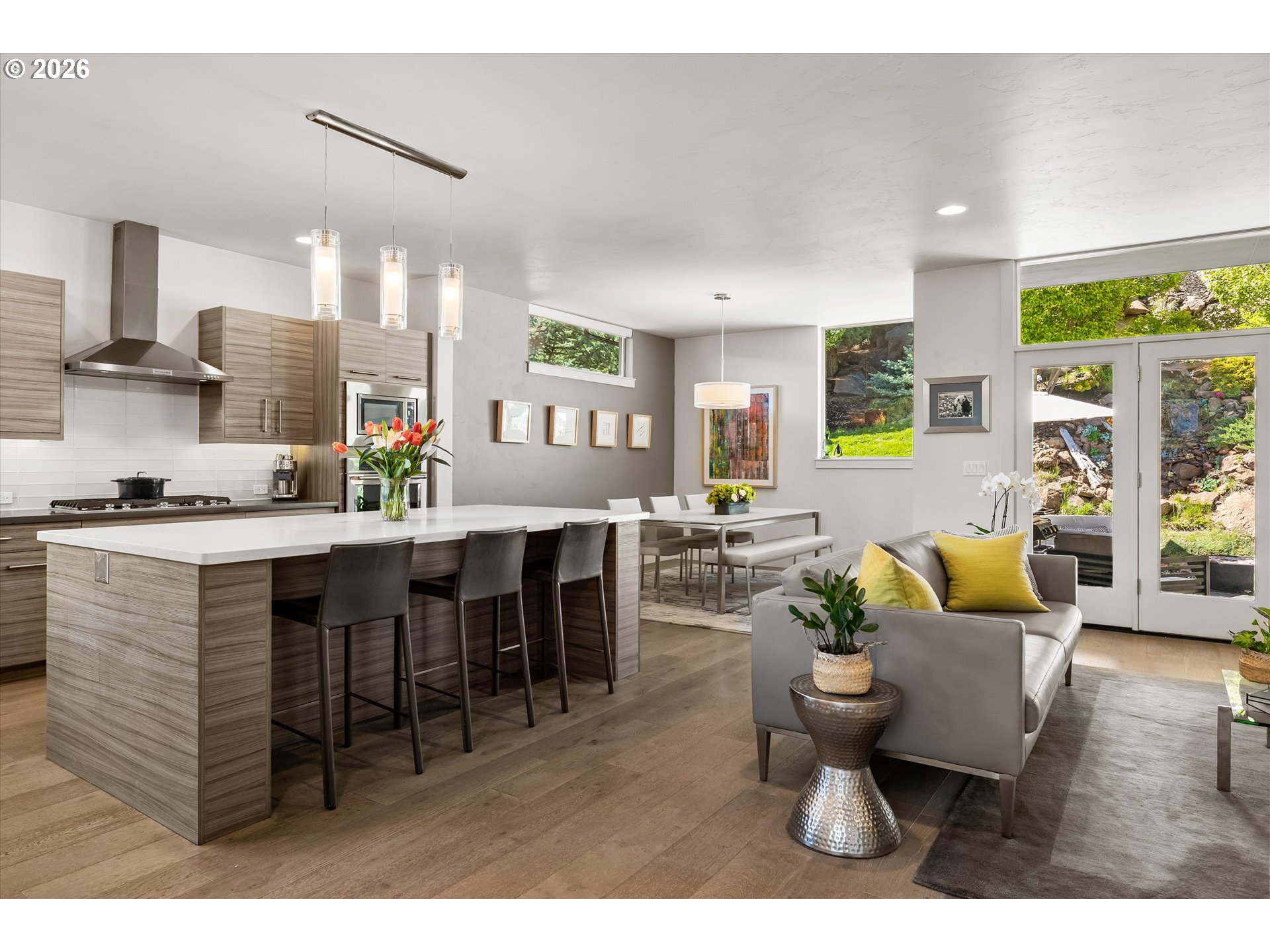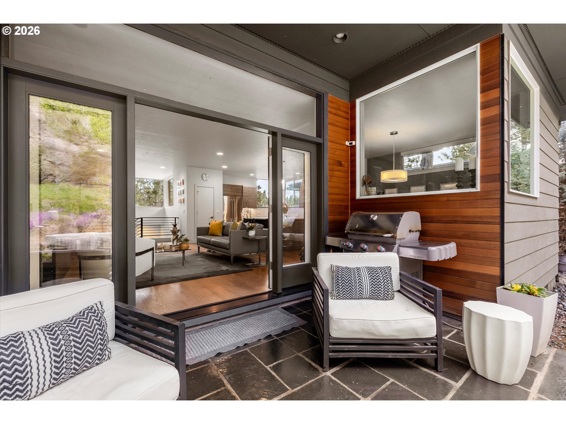 This contemporary Earth Advantage home is a peaceful, private retreat tucked into a hillside on the Westside. Elevated main floor living with a chef's kitchen that flows into a light filled great room with a striking 25 ft waterfall feature and a mature landscaped backyard. Outside is a secluded hillside hot tub, perfectly positioned for quiet evenings under the stars. Thoughtfully designed spaces include a spa inspired primary suite, dedicated office, cozy den, home gym with a custom sauna, and two guest rooms—all with treetop views from nearly every window. With quick access to the Deschutes River Trail, Phil's Trails, Tetherow, Mount Bachelor, downtown Bend, and the Old Mill District. This is a home you need to experience in person.