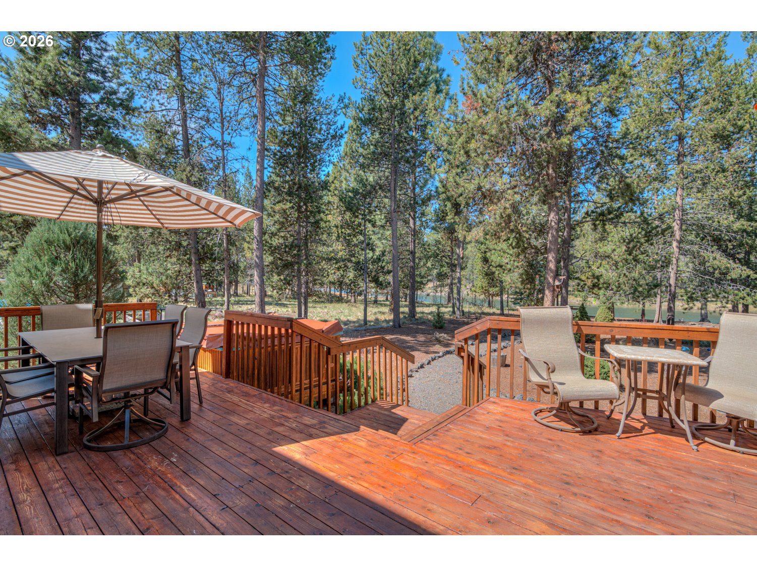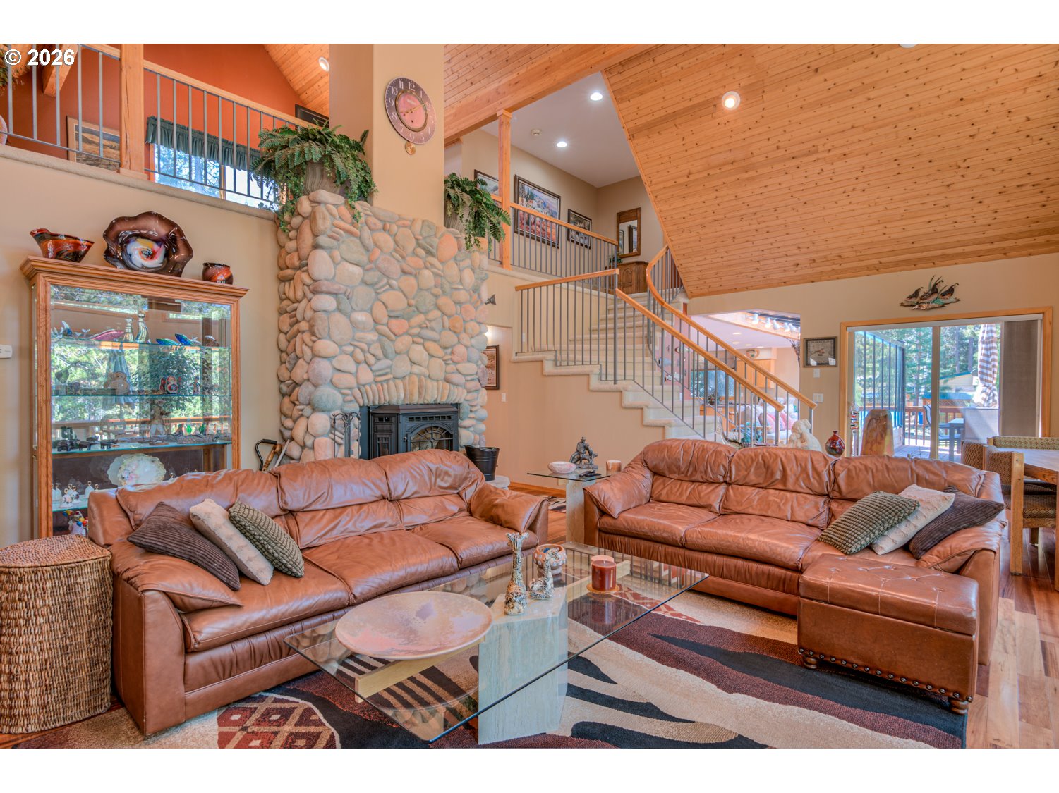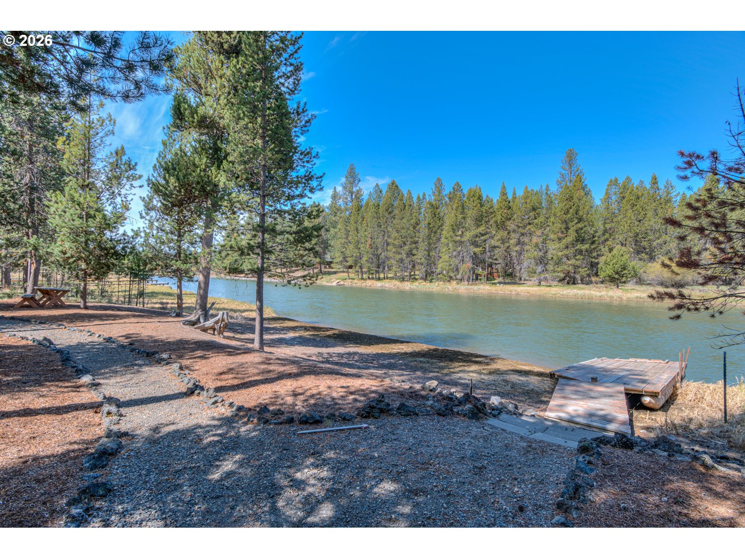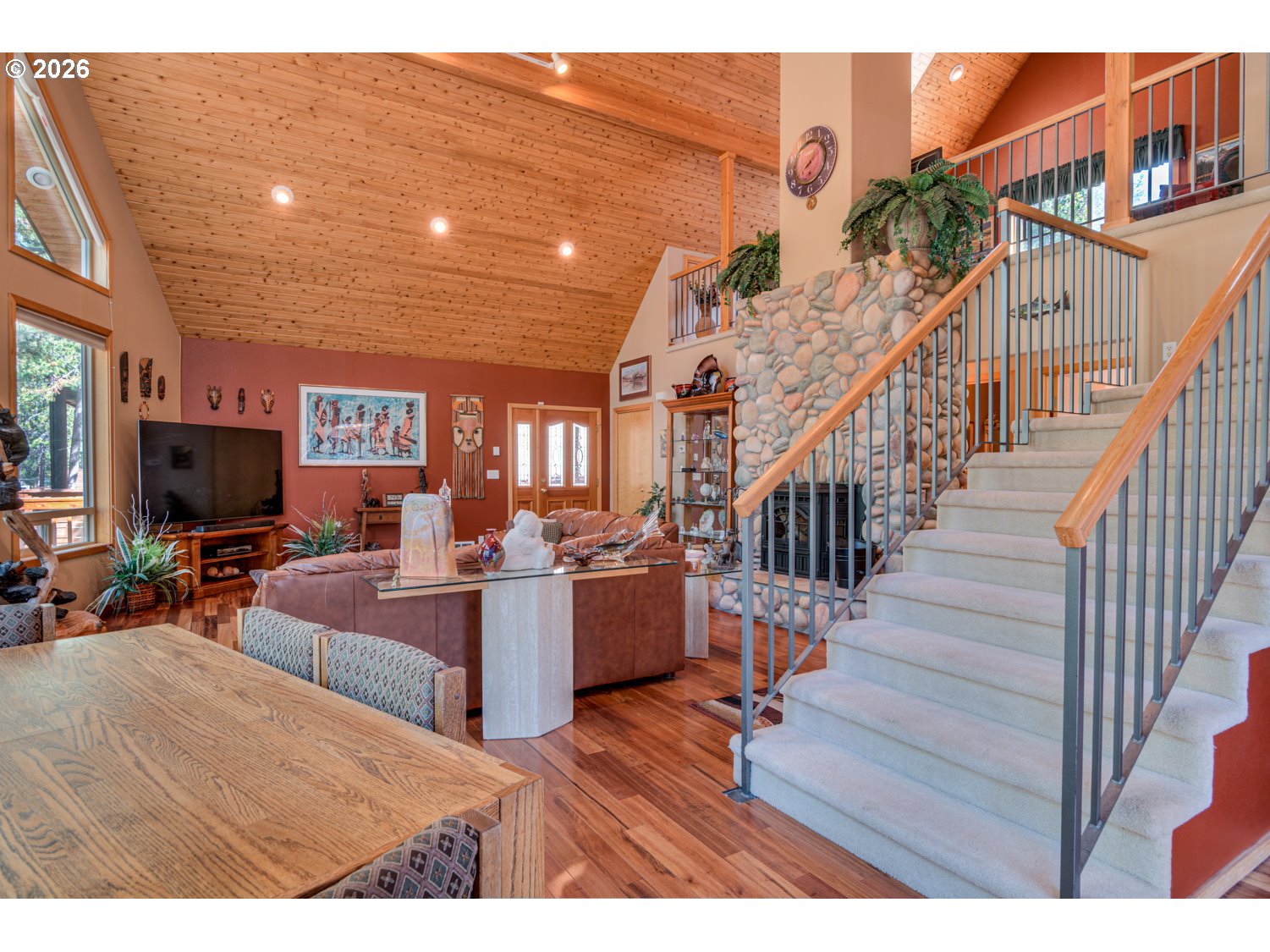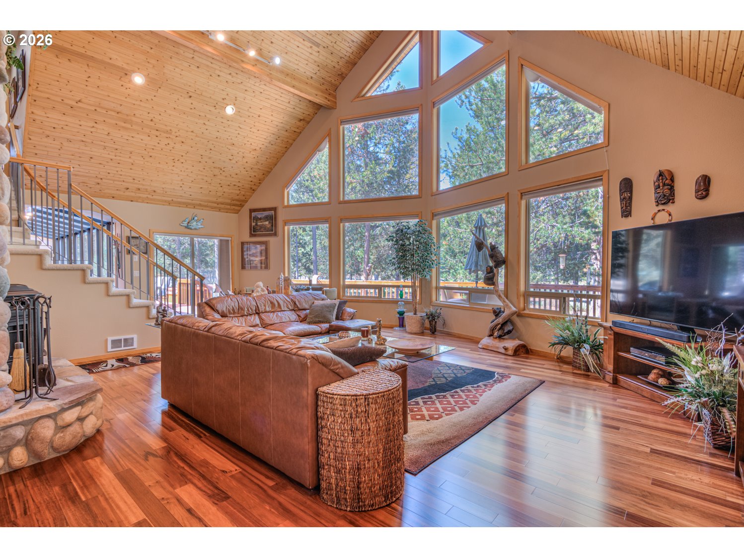 This stunning Big Deschutes riverfront home offers a seamless blend of warmth and architectural design, highlighted by a magnificent living room with Tiger Wood hardwood floors, two-story floor to ceiling windows looking out to the river, vaulted cedar ceilings, and river rock surrounding a high efficiency pellet stove. The thoughtful design ensures breathtaking, panoramic Deschutes views from the kitchen, dining area, living room, and the oversized private primary suite. This 3 bedroom, 2 bath home with over 2400 sq ft of living space offers newer stainless appliances, solid surface countertops with a large glass enclosed dining area to observe the amazing river views. Outside, the hot tub and large wrap around cedar deck provides the ultimate vantage point for the river, overlooking a large, beautifully landscaped yard that leads directly to the water's edge and private floating dock. Completing this exceptional property is an oversized three-car garage.