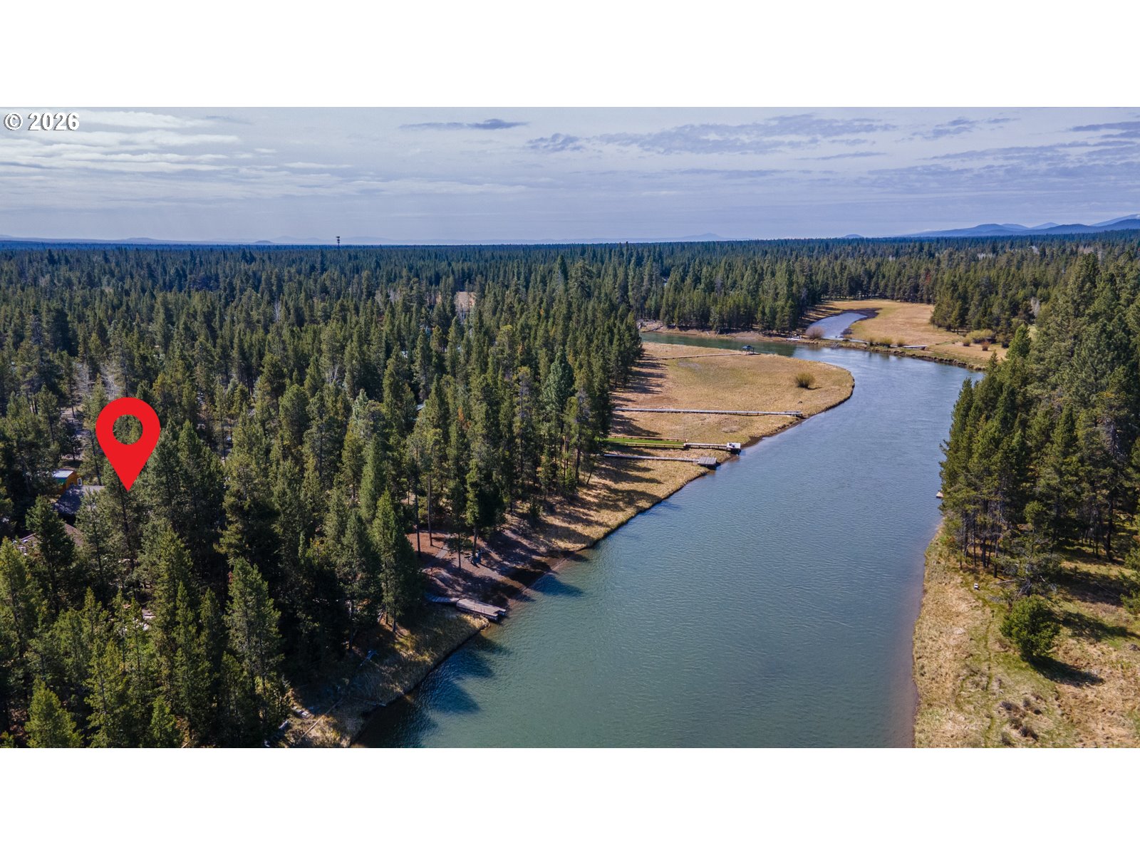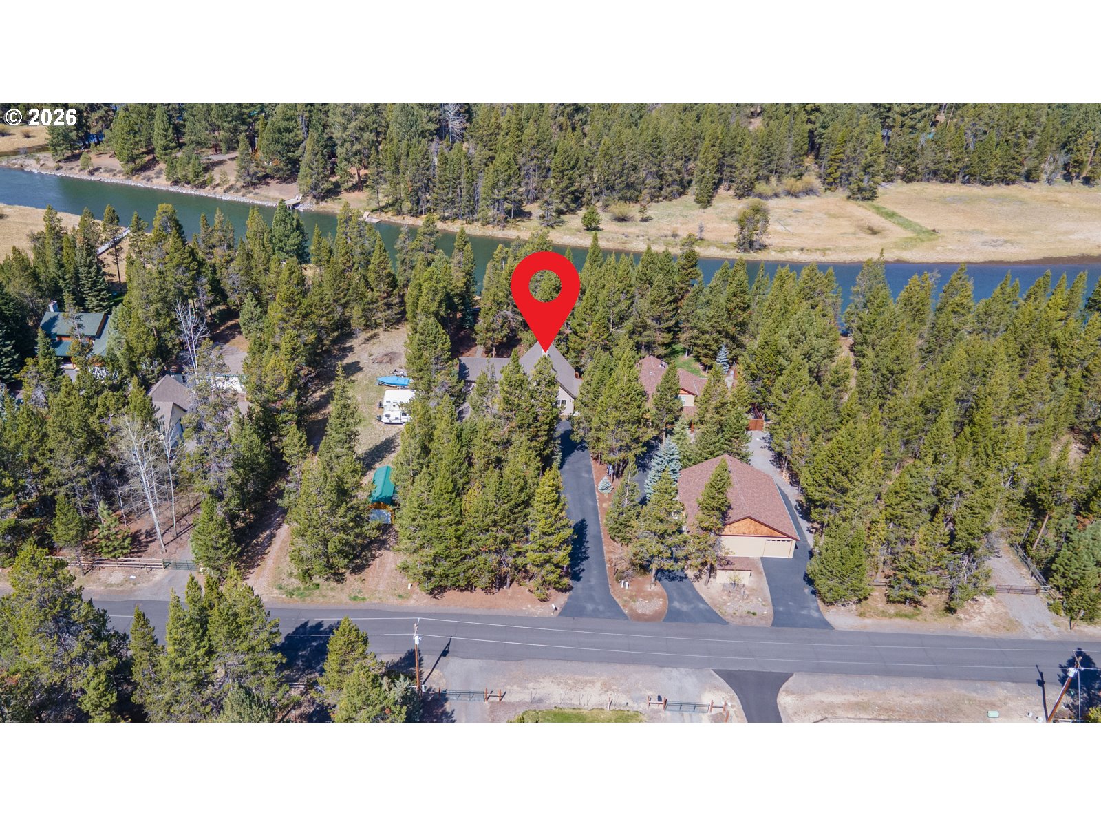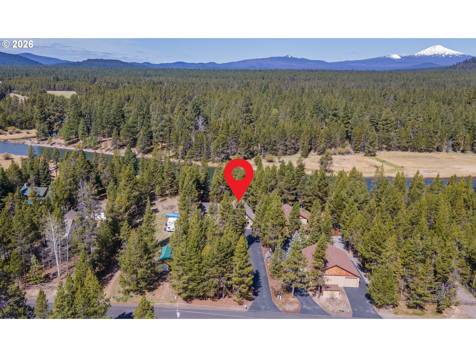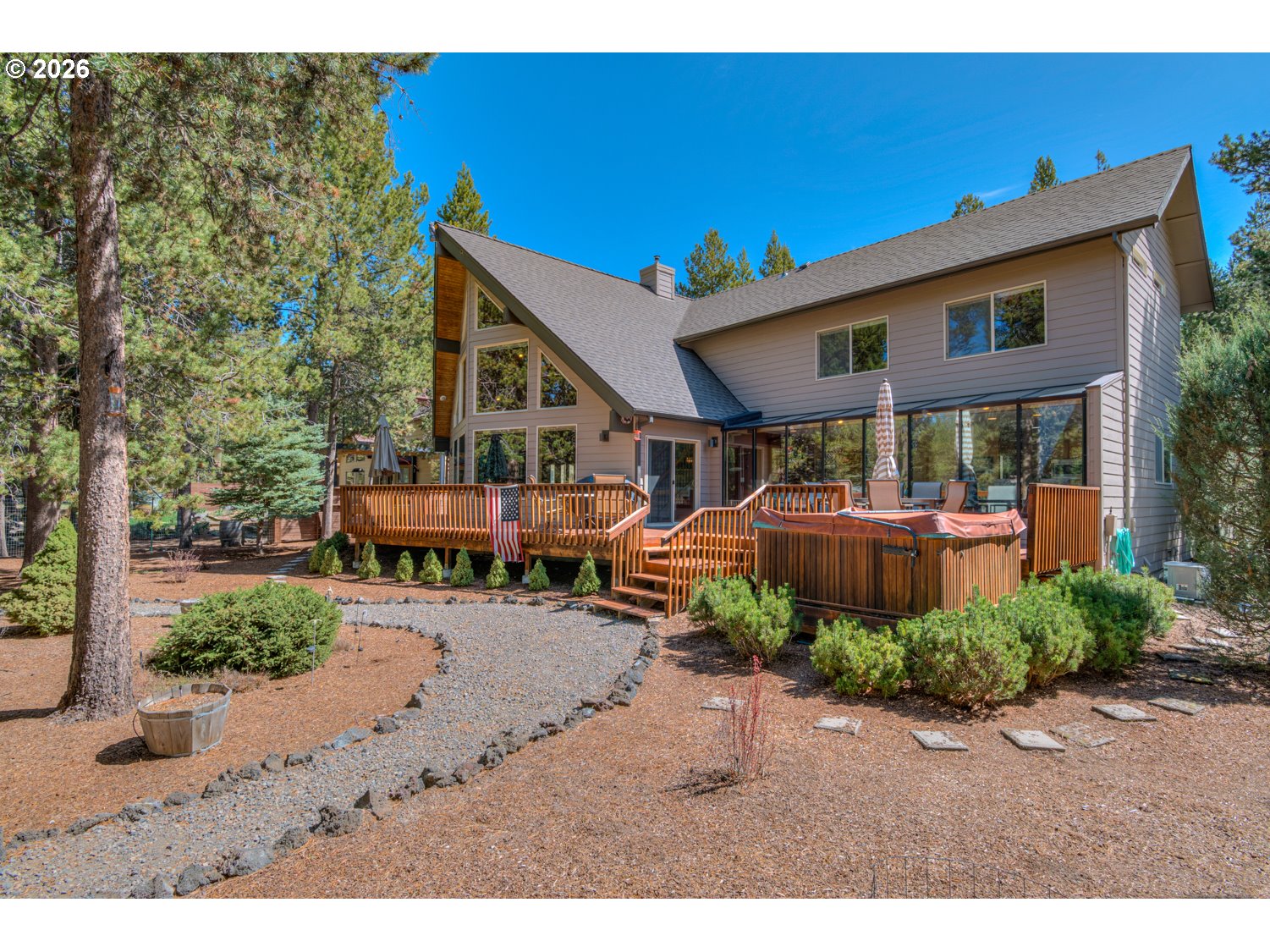 This stunning Big Deschutes riverfront home offers a seamless blend of warmth and architectural design, highlighted by a magnificent living room with Tiger Wood hardwood floors, two-story floor to ceiling windows looking out to the river, vaulted cedar ceilings, and river rock surrounding a high efficiency pellet stove. The thoughtful design ensures breathtaking, panoramic Deschutes views from the kitchen, dining area, living room, and the oversized private primary suite. This 3 bedroom, 2 bath home with over 2400 sq ft of living space offers newer stainless appliances, solid surface countertops with a large glass enclosed dining area to observe the amazing river views. Outside, the hot tub and large wrap around cedar deck provides the ultimate vantage point for the river, overlooking a large, beautifully landscaped yard that leads directly to the water's edge and private floating dock. Completing this exceptional property is an oversized three-car garage.