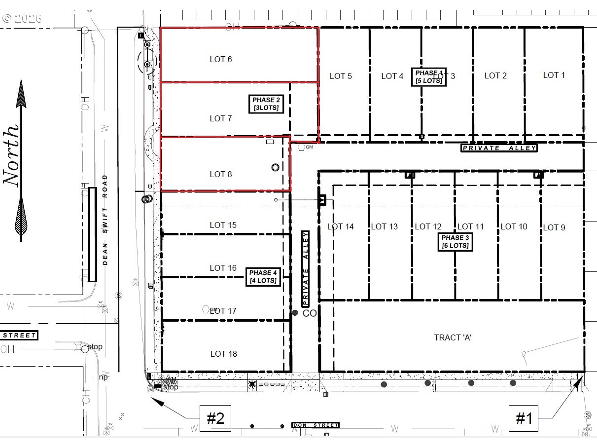 Three mixed residential ("live-work") zoned bare lots for sale. These lots are flat and ready to build with paving, curbs, sidewalks, water, sewer, gas, and electric. The special zoning for these lots permits building "duplexes" with street-level low impact business and additional level(s) above for homes with the potential to rent the business levels and homes together or separately. The subdivision is also approved for attached or detached townhomes so buildings on separate lots may be joined or partially joined at the lot lines to reduce setback requirements and allow for 60% lot coverage. The front entrances of the structures would be on Dean Swift to the west with a 5' setback and a driveway access from Gracie Lane with an 18' setback. Lot 809 and 810 are larger to accommodate driveways with access for 809 through the driveway of 810 (see tax lot map for details). Lot 171234DC00809 is 4,180 sq ft measuring 110' x 38', Lot 171234DC00810 is 4,260 sq ft measuring 110' x 38' + 4' x 20', and Lot 171234DC00811 is 3,420 sq ft measuring 90' x 38' 62062 Dean Swift Rd is the old tract address being used for the ease of location of these three developed bare lots.