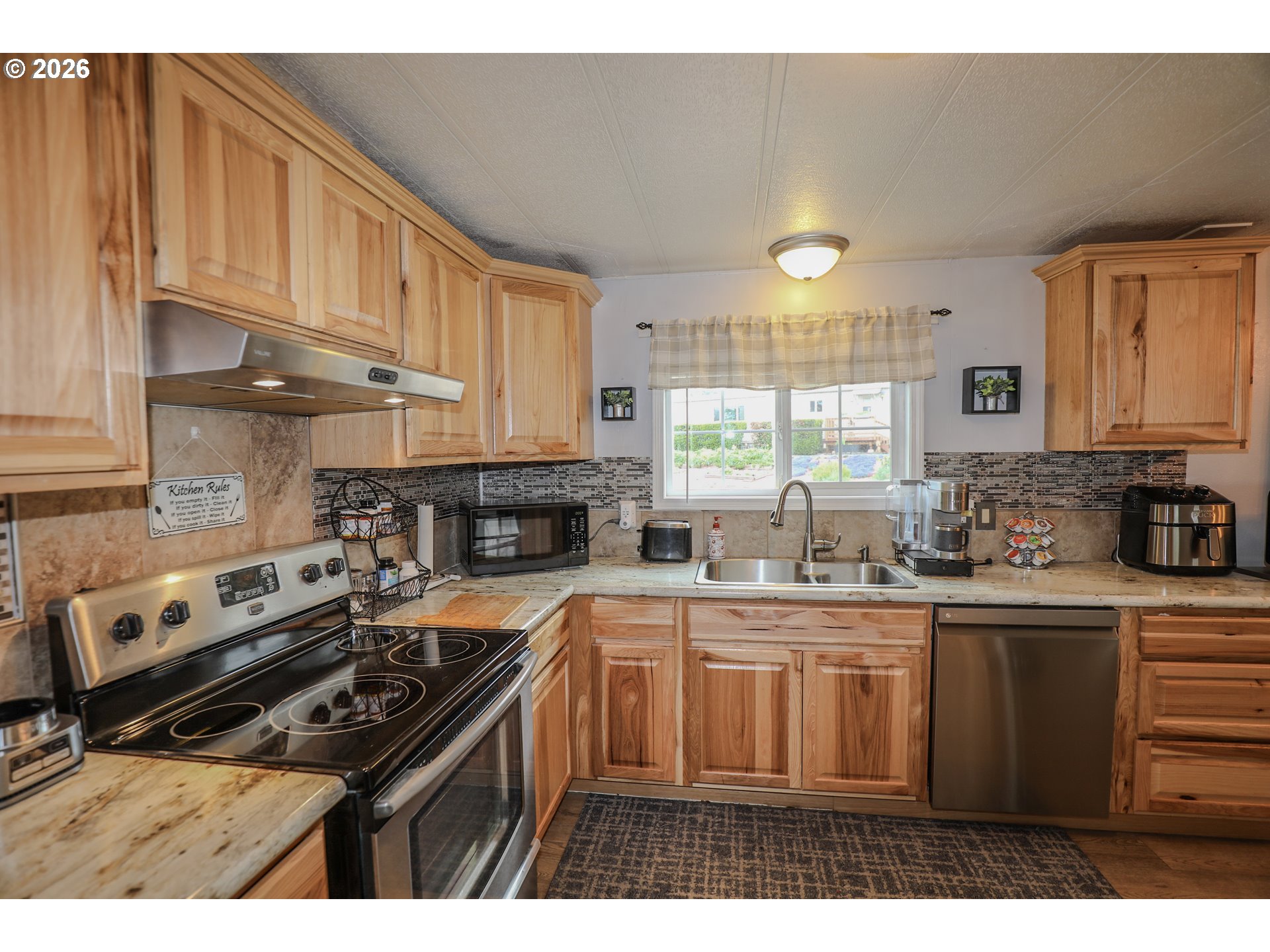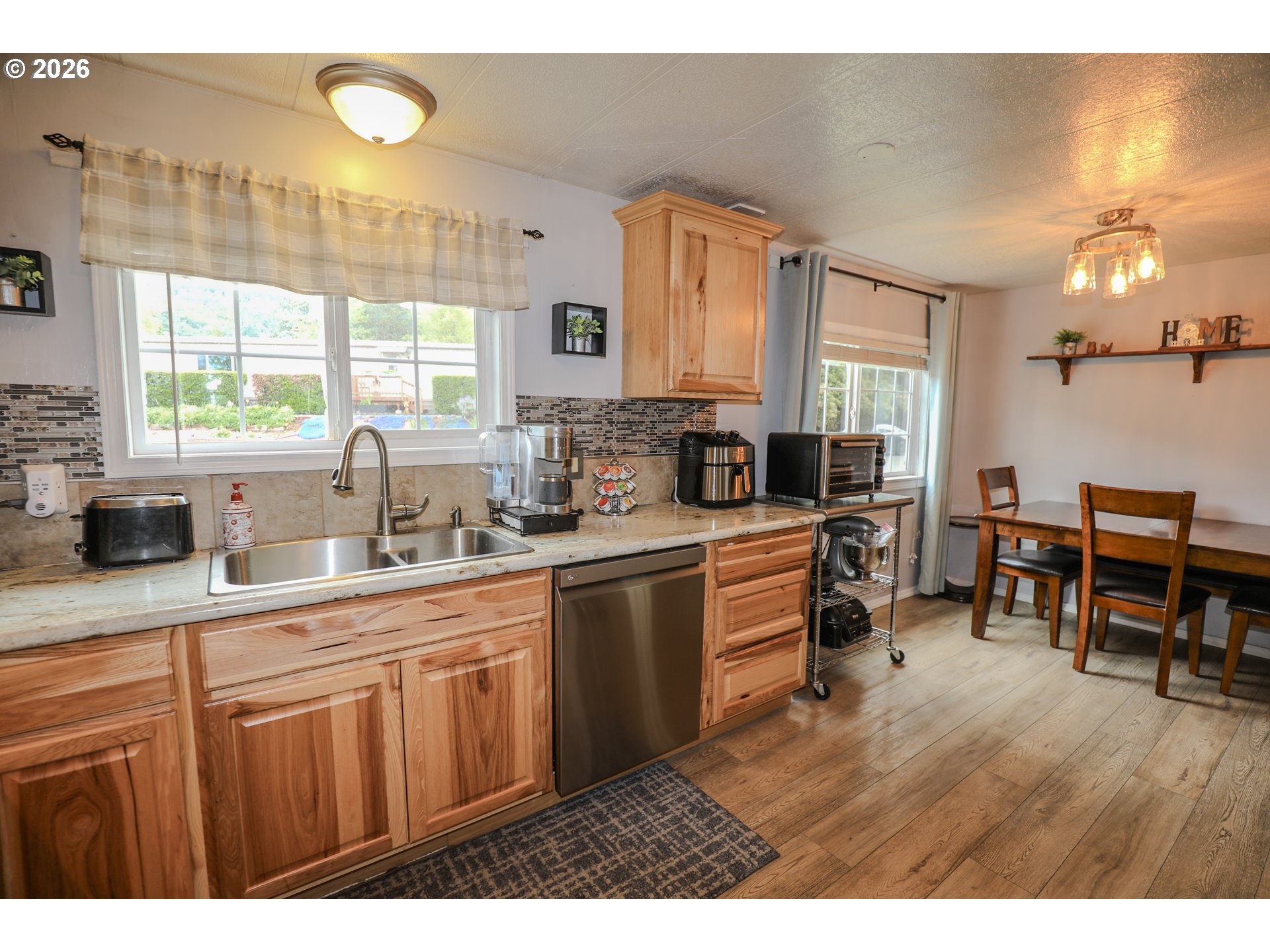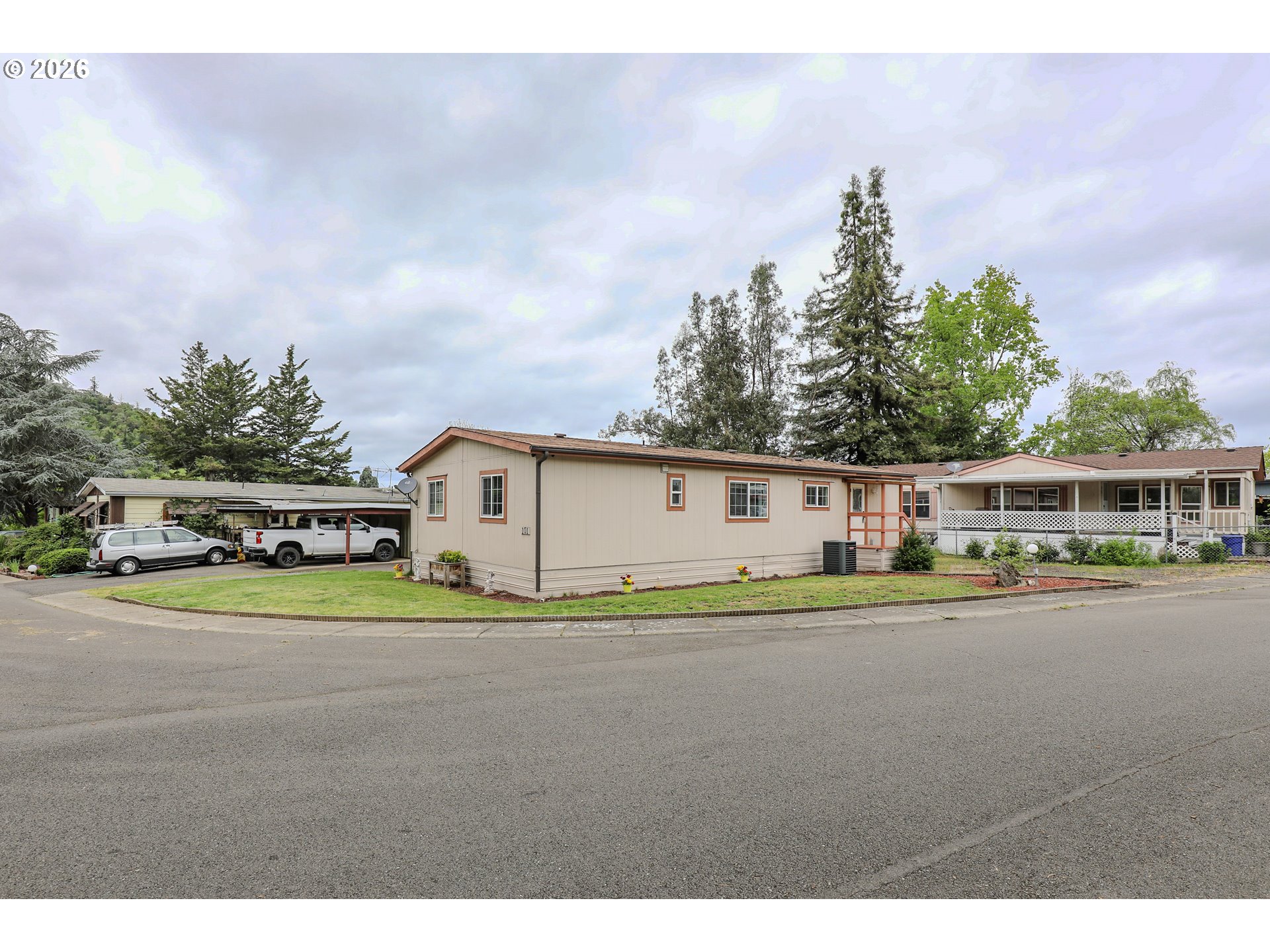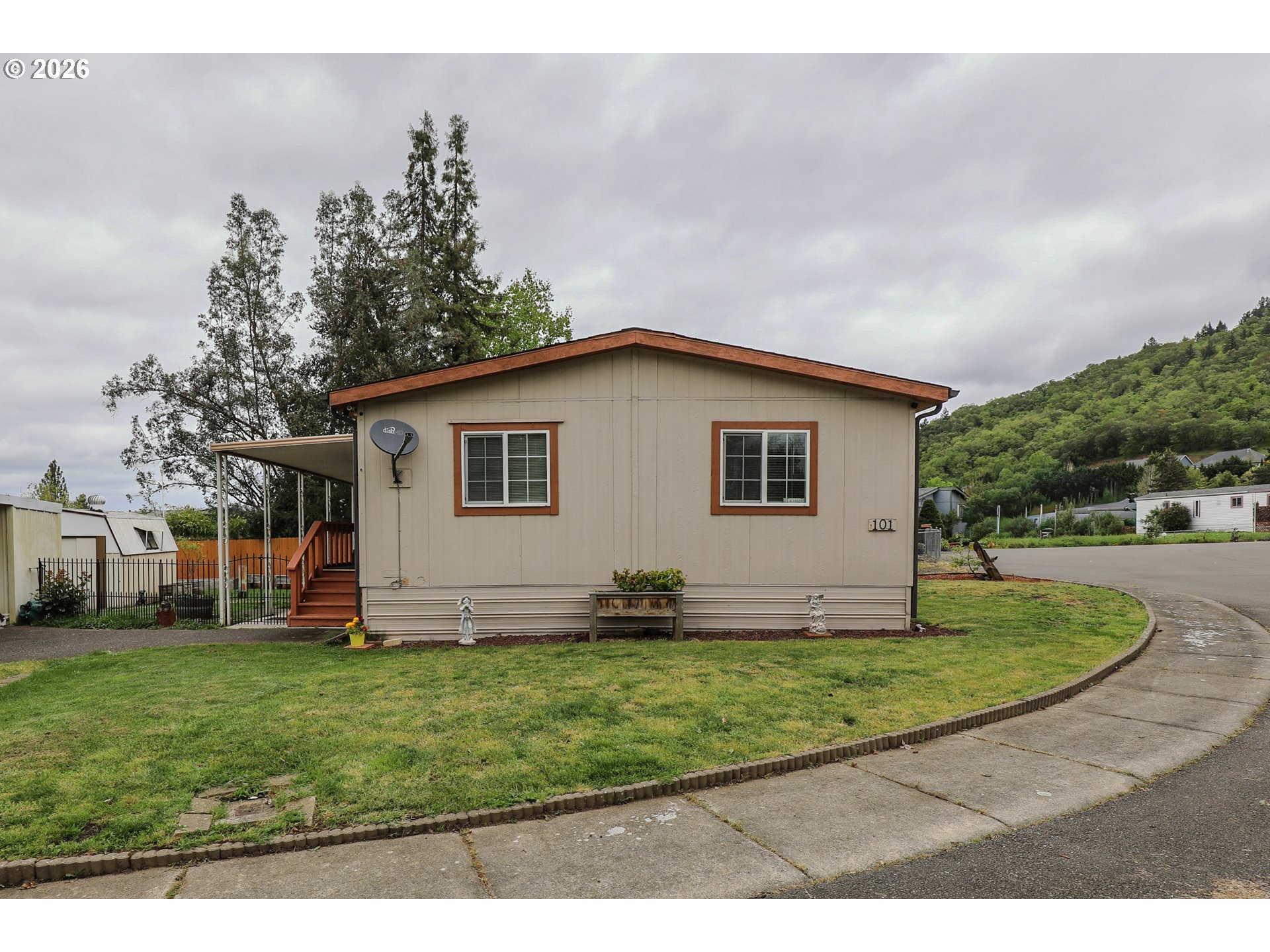 Welcome to 101 Molalla Ct. in Roseburg, located in the desirable Saddle Butte Mobile Manor community! This beautifully updated 3-bedroom, 2-bath home offers 1,152 sq ft of comfortable living with modern finishes throughout.Step inside to find stylish luxury vinyl flooring and a bright, inviting layout. The kitchen is a standout feature with gorgeous countertops, a tile backsplash, rich hickory cabinets, and stainless steel appliances—perfect for both everyday living and entertaining. The spacious living area is enhanced by an electric fireplace, creating a warm and cozy atmosphere.The primary suite offers a relaxing retreat with a soaking tub, while the additional bedrooms provide flexibility for guests, an office, or hobbies. You’ll also appreciate the laundry room with ample storage and the convenience of newer vinyl windows and an updated HVAC system for year-round comfort.Outside, enjoy a fully fenced yard with raised garden beds, a covered patio ideal for outdoor gatherings, and a corner lot that adds extra space and privacy. A storage shed with power provides great functionality for projects or additional storage needs.This well-maintained home combines comfort, style, and practicality—don’t miss your opportunity to make it yours!