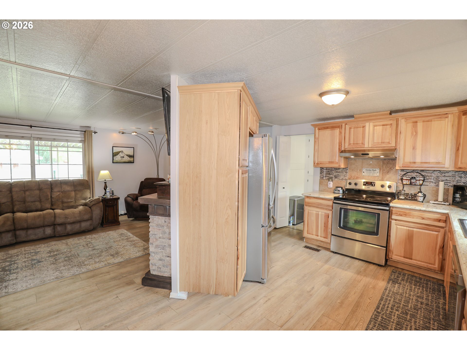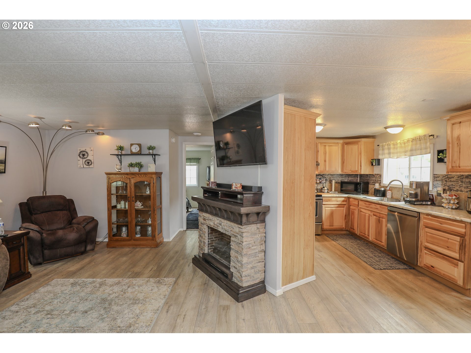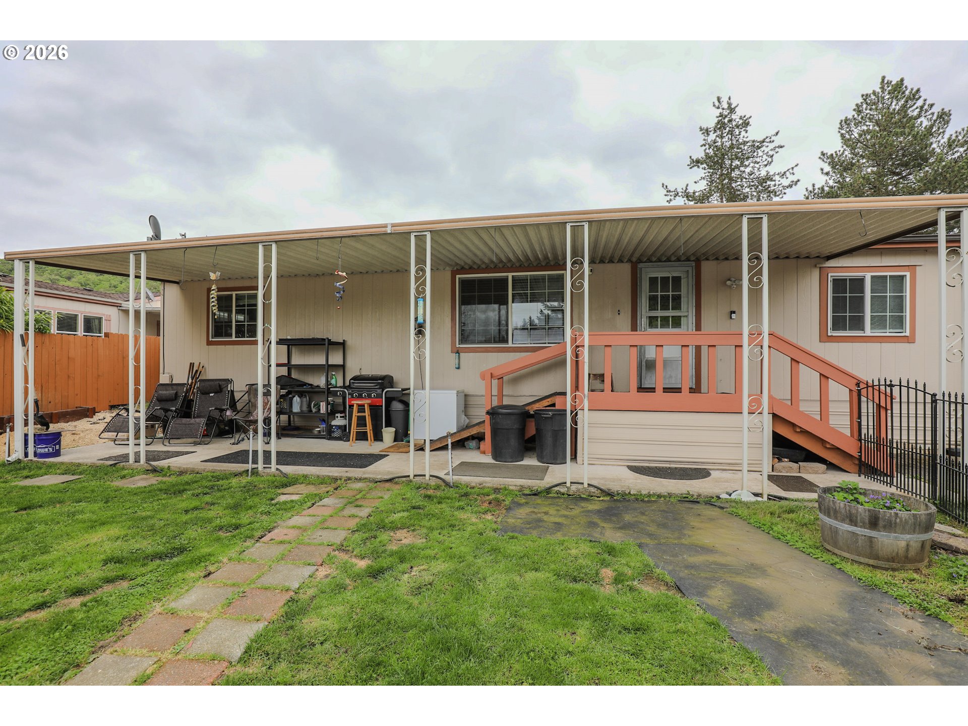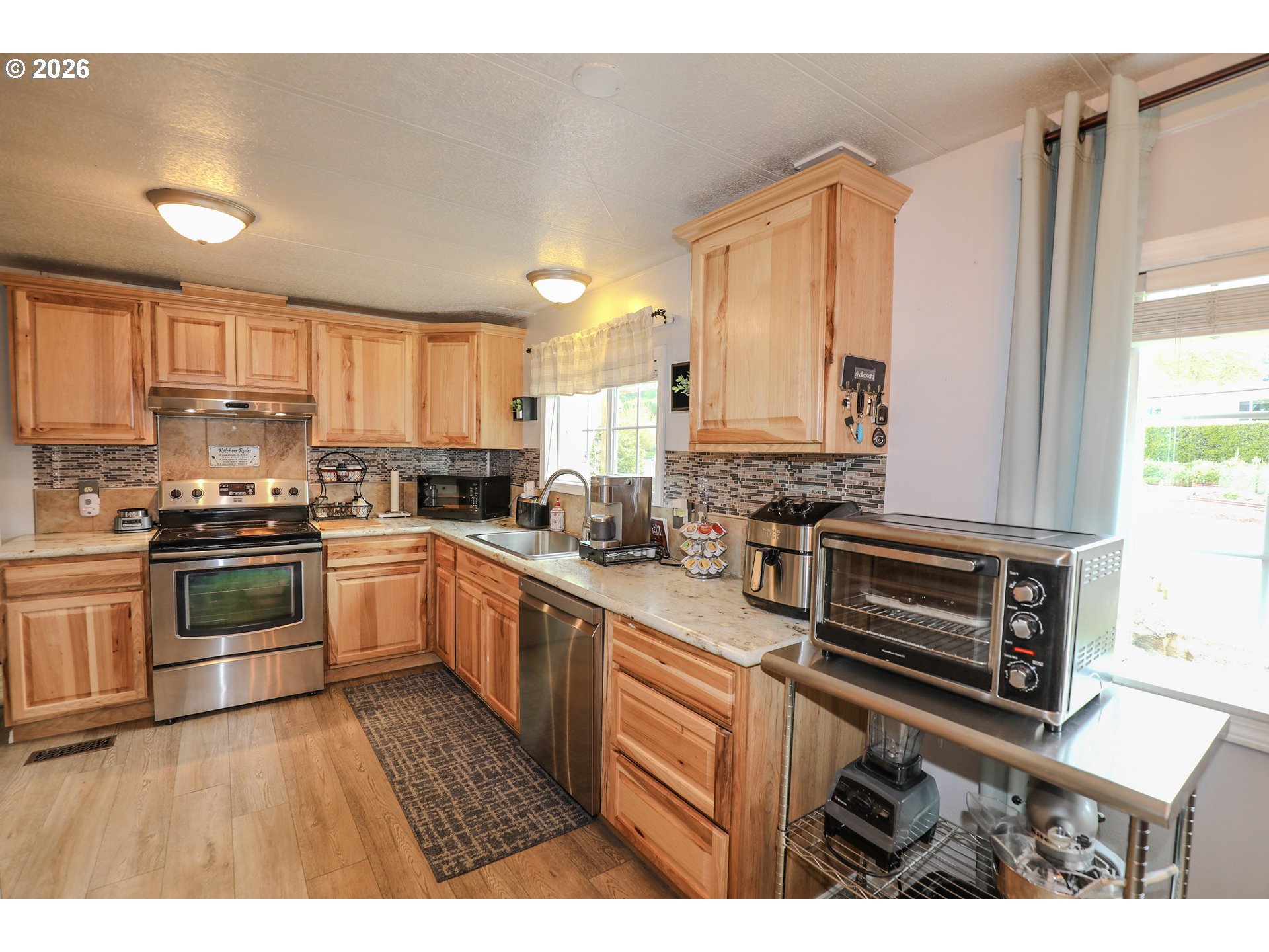 Welcome to 101 Molalla Ct. in Roseburg, located in the desirable Saddle Butte Mobile Manor community! This beautifully updated 3-bedroom, 2-bath home offers 1,152 sq ft of comfortable living with modern finishes throughout.Step inside to find stylish luxury vinyl flooring and a bright, inviting layout. The kitchen is a standout feature with gorgeous countertops, a tile backsplash, rich hickory cabinets, and stainless steel appliances—perfect for both everyday living and entertaining. The spacious living area is enhanced by an electric fireplace, creating a warm and cozy atmosphere.The primary suite offers a relaxing retreat with a soaking tub, while the additional bedrooms provide flexibility for guests, an office, or hobbies. You’ll also appreciate the laundry room with ample storage and the convenience of newer vinyl windows and an updated HVAC system for year-round comfort.Outside, enjoy a fully fenced yard with raised garden beds, a covered patio ideal for outdoor gatherings, and a corner lot that adds extra space and privacy. A storage shed with power provides great functionality for projects or additional storage needs.This well-maintained home combines comfort, style, and practicality—don’t miss your opportunity to make it yours!