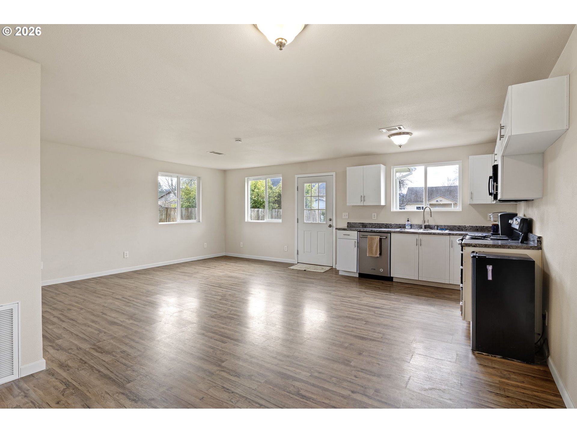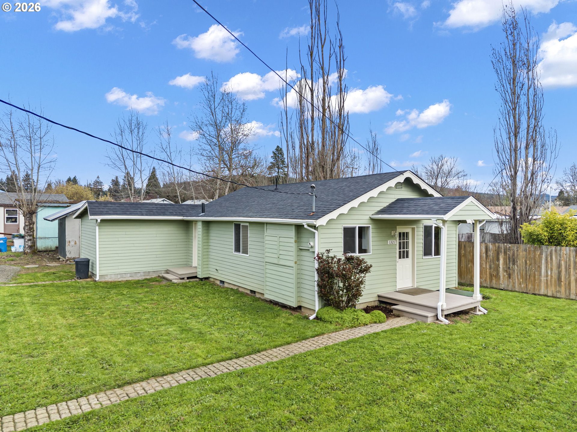 Fully remodeled and move-in ready, this charming 3bd/2bth Sutherlin home was taken down to the studs and rebuilt with new drywall, insulation, plumbing, kitchen, and beautifully tiled bathrooms. The bright open living space features luxury vinyl plank flooring throughout and a spacious kitchen with stainless appliances and ample cabinetry. Outside, enjoy a welcoming covered front porch, newer roof, fiber cement siding, and a large yard with plenty of driveway parking.