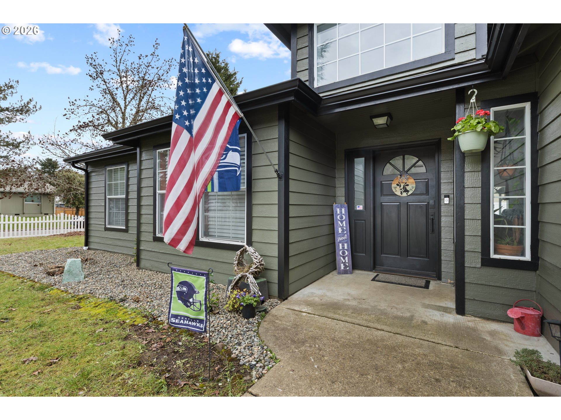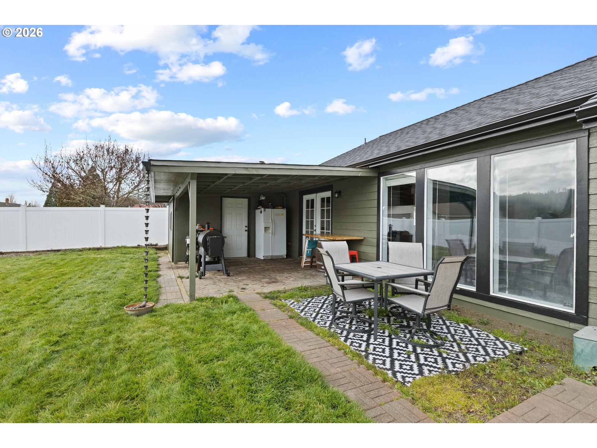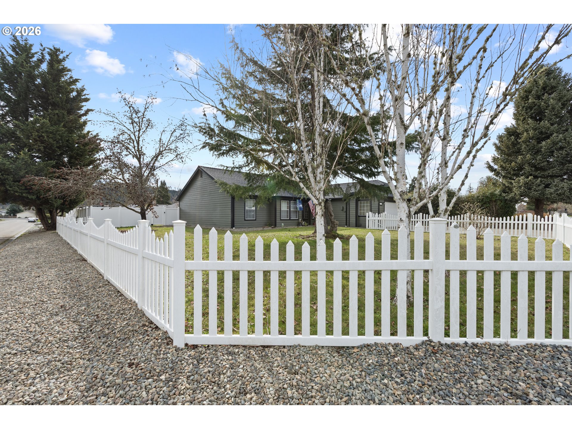 Perfectly positioned on a spacious .21-acre corner lot in the heart of Sutherlin, this beautifully updated single-level home offers comfort, style, & standout curb appeal from the moment you arrive. With fresh exterior paint & a brand-new roof & gutters, this 3-bedroom, 2-bathroom home offers 1,616 sqft of thoughtfully designed living space & peace of mind for years to come. Step inside to a welcoming entryway that opens into a light-filled living room featuring vaulted ceilings & rich bamboo flooring, creating an open & inviting atmosphere. The adjoining dining area flows seamlessly from the living space & offers french doors that lead to the covered back patio, making indoor-outdoor living & entertaining effortless. The kitchen is both functional & spacious, complete with tile flooring, stainless steel appliances, a center cook island, & ample room for a coffee bar. Just beyond, the cozy family room provides the perfect retreat with a woodstove set against a classic brick hearth, offering warmth & serenity year-round. The primary suite is thoughtfully designed with carpeted comfort, a ceiling fan, double closets, & french doors that open to the backyard. The en-suite bathroom features a tiled walk-in shower & a built-in vanity-style counter with extra space to get ready. Additional features include a dedicated laundry room with washer & dryer included, an attached two-car garage with exterior man door, & a large driveway with ample space for RV parking. The fully fenced property offers both a separately fenced front yard with charming white picket fencing & a private backyard enclosed with vinyl fencing. The spacious yard provides room to garden, play, or entertain, while the storage shed offers convenient space for tools & lawn equipment. A dedicated side yard area adds flexibility & can easily function as a private dog run. Offering comfort, functionality, & thoughtful updates in a desirable location, this well-maintained home is ready to welcome its next owner.
