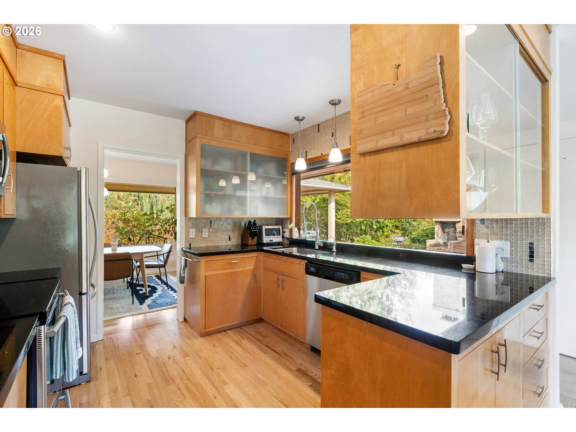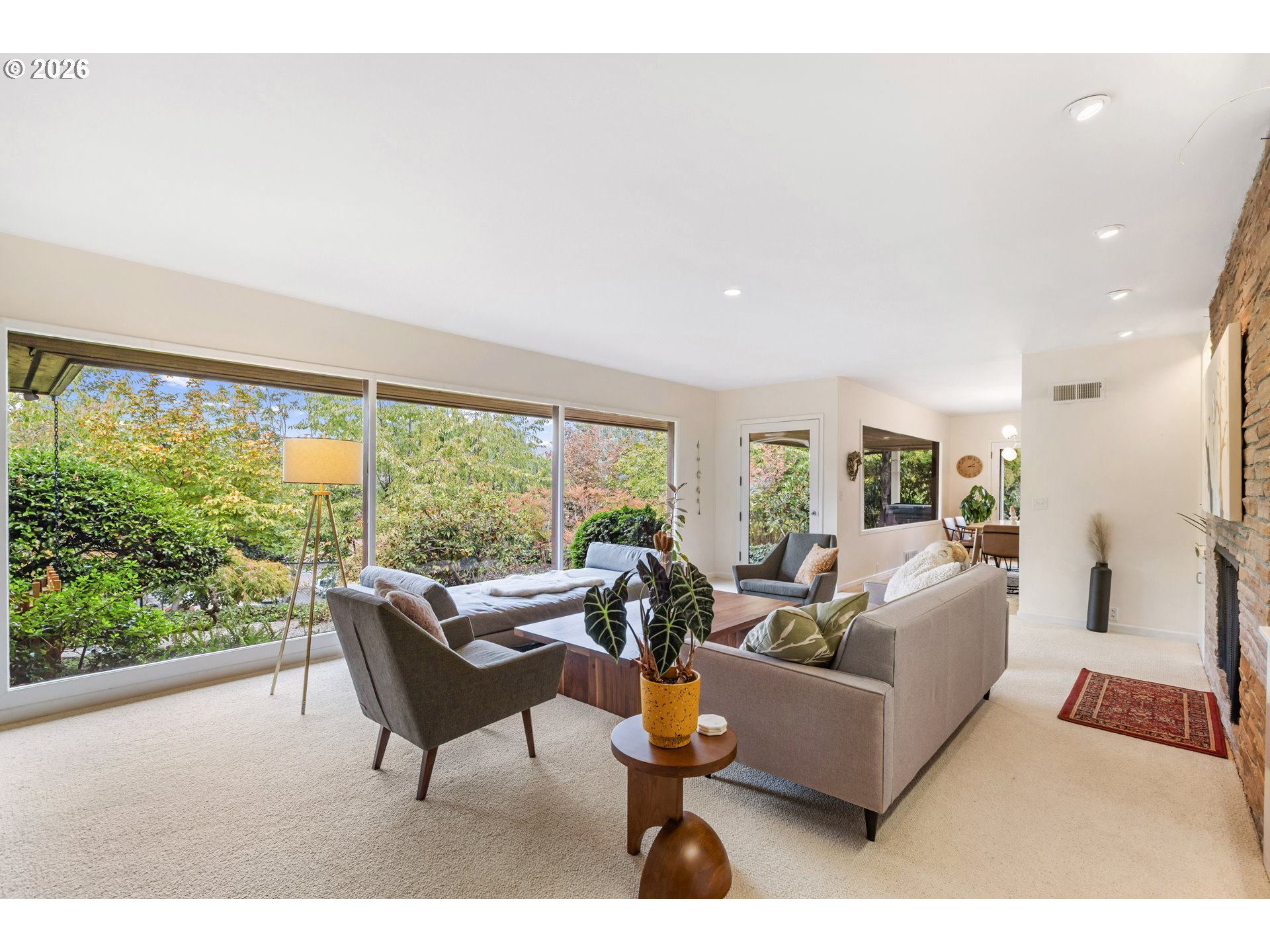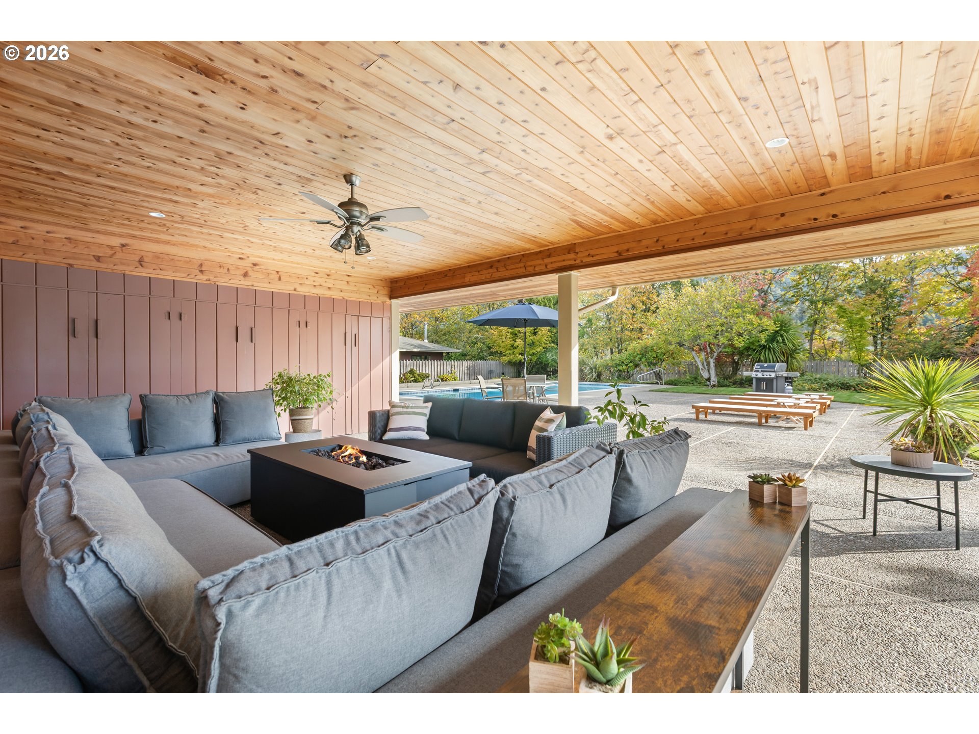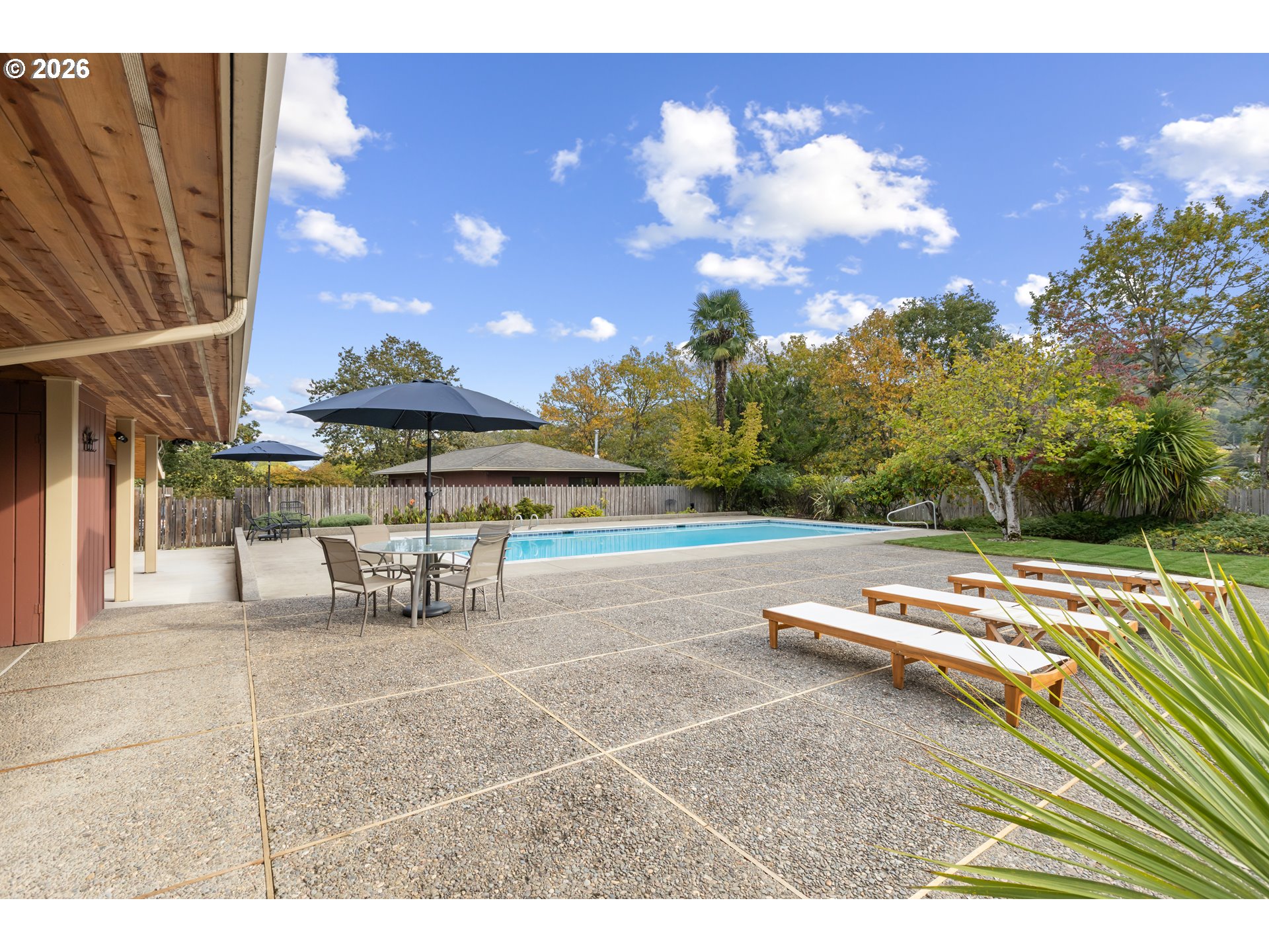 Experience the ultimate in mid-century luxury on this hidden 1.53-acre estate tucked away in the heart of Roseburg. An elegant paver parking area and large carport lead to beautiful flagstone pathways that guide you to the front door. The home opens to a tiled entryway with a convenient powder room for guests, leading into a breathtaking space where expansive windows flood the living and family rooms with natural light. Cozy fireplaces anchor each of these living areas, creating an atmosphere of warmth and sophistication. Gorgeous hardwood floors flow through the chef’s kitchen and formal dining area, where French doors lead you out to a private courtyard featuring a flagstone patio and a relaxing hot tub under a gazebo cover. The kitchen is upgraded with sleek quartz countertops and stainless steel appliances. The primary suite is a true sanctuary, featuring a large walk-in closet and a bathroom with custom tile work by David Hu, heated floors, and a massive walk-in tile shower with dual shower heads. An additional full bathroom is centrally located in the hallway near the bedrooms. Practicality meets style with a dedicated office and gigabit internet availability, a spacious laundry room, and a full bathroom with a luxurious steam shower. A huge bonus area with gorgeous exposed beams and its own fireplace provides a perfect secondary living space, including a bedroom with direct access to the pool area. The exterior is an entertainer’s dream, defined by exquisite tongue-and-groove woodwork. This gorgeous wood ceiling with recessed lighting wraps around the home, covering an aggregate-style patio that extends around the sparkling in-ground pool. For the hobbyist, a massive 4-bay shop with concrete floors, wood stove, and dedicated street access provides ample space. With a new roof and HVAC in 2022, this meticulously maintained estate offers an unparalleled lifestyle of seclusion just moments away from the vibrant amenities of downtown.