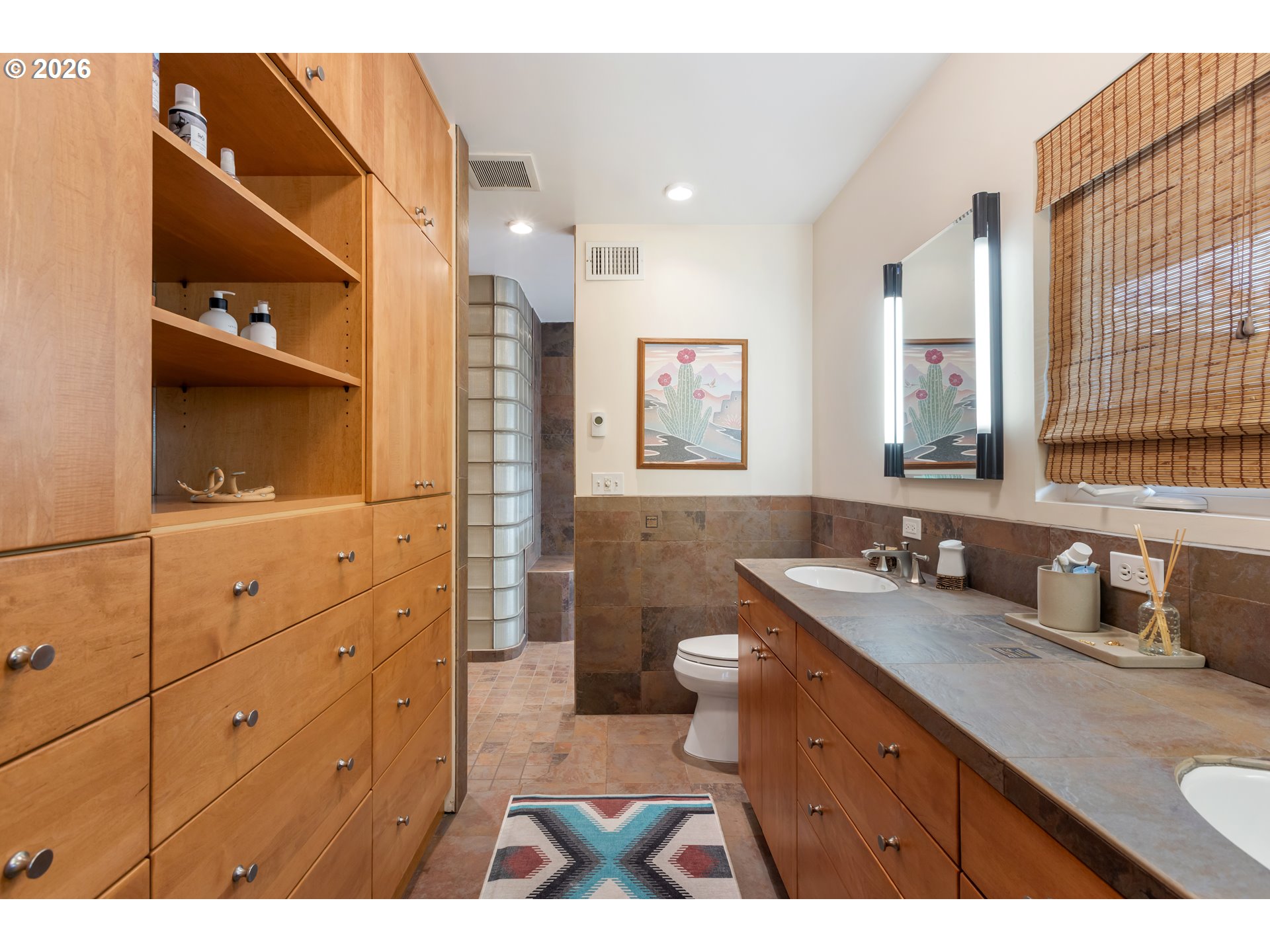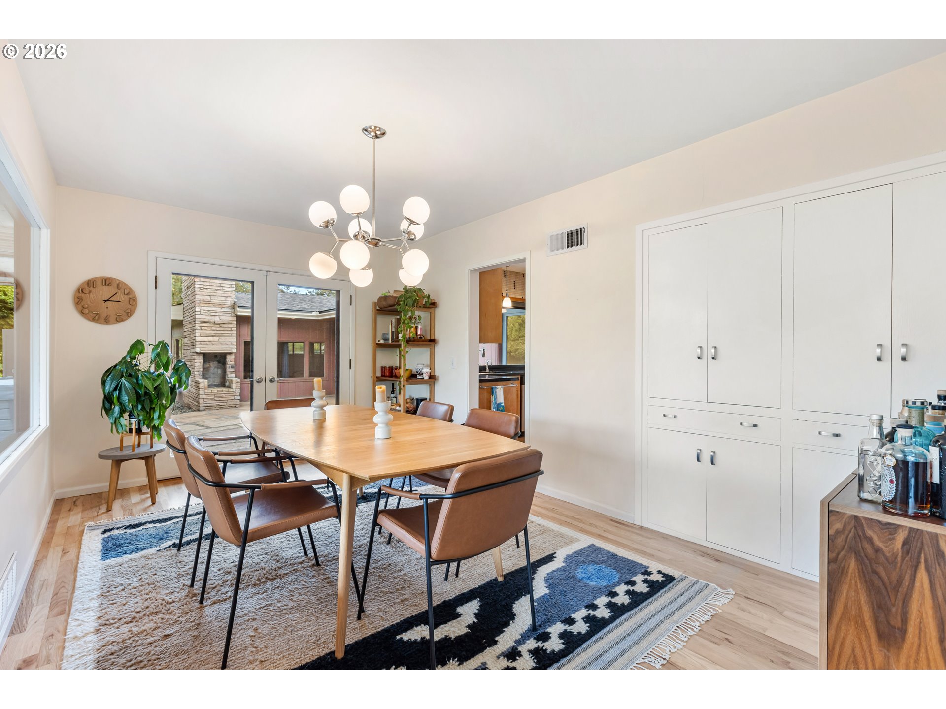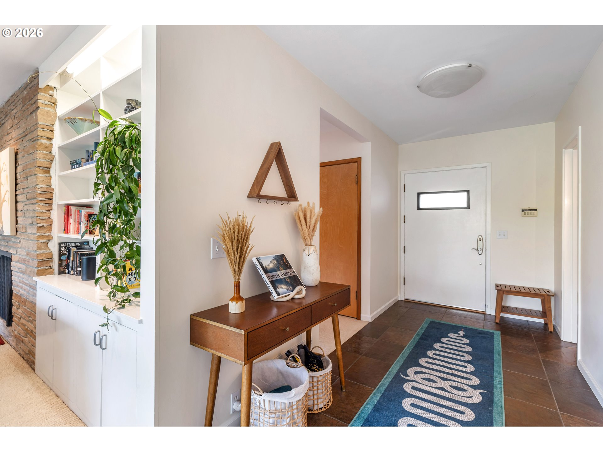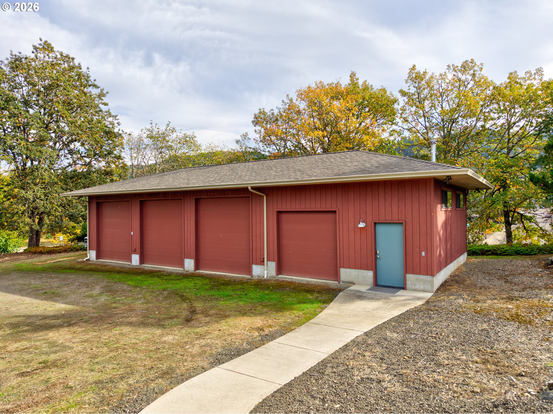Experience the ultimate in mid-century luxury on this hidden 1.53-acre estate tucked away in the heart of Roseburg. An elegant paver parking area and large carport lead to beautiful flagstone pathways that guide you to the front door. The home opens to a tiled entryway with a convenient powder room for guests, leading into a breathtaking space where expansive windows flood the living and family rooms with natural light. Cozy fireplaces anchor each of these living areas, creating an atmosphere of warmth and sophistication. Gorgeous hardwood floors flow through the chef’s kitchen and formal dining area, where French doors lead you out to a private courtyard featuring a flagstone patio and a relaxing hot tub under a gazebo cover. The kitchen is upgraded with sleek quartz countertops and stainless steel appliances. The primary suite is a true sanctuary, featuring a large walk-in closet and a bathroom with custom tile work by David Hu, heated floors, and a massive walk-in tile shower with dual shower heads. An additional full bathroom is centrally located in the hallway near the bedrooms. Practicality meets style with a dedicated office and gigabit internet availability, a spacious laundry room, and a full bathroom with a luxurious steam shower. A huge bonus area with gorgeous exposed beams and its own fireplace provides a perfect secondary living space, including a bedroom with direct access to the pool area. The exterior is an entertainer’s dream, defined by exquisite tongue-and-groove woodwork. This gorgeous wood ceiling with recessed lighting wraps around the home, covering an aggregate-style patio that extends around the sparkling in-ground pool. For the hobbyist, a massive 4-bay shop with concrete floors, wood stove, and dedicated street access provides ample space. With a new roof and HVAC in 2022, this meticulously maintained estate offers an unparalleled lifestyle of seclusion just moments away from the vibrant amenities of downtown.