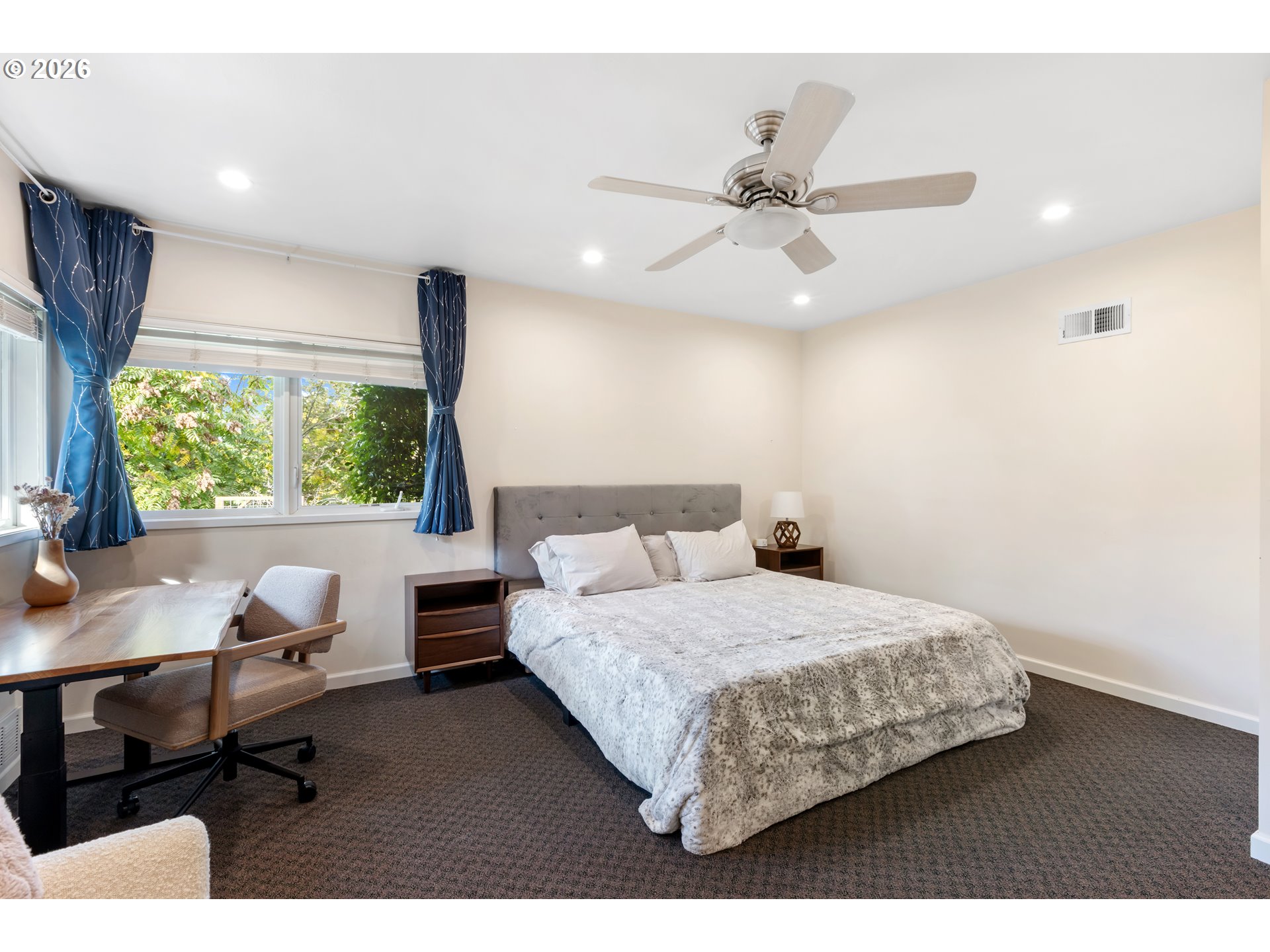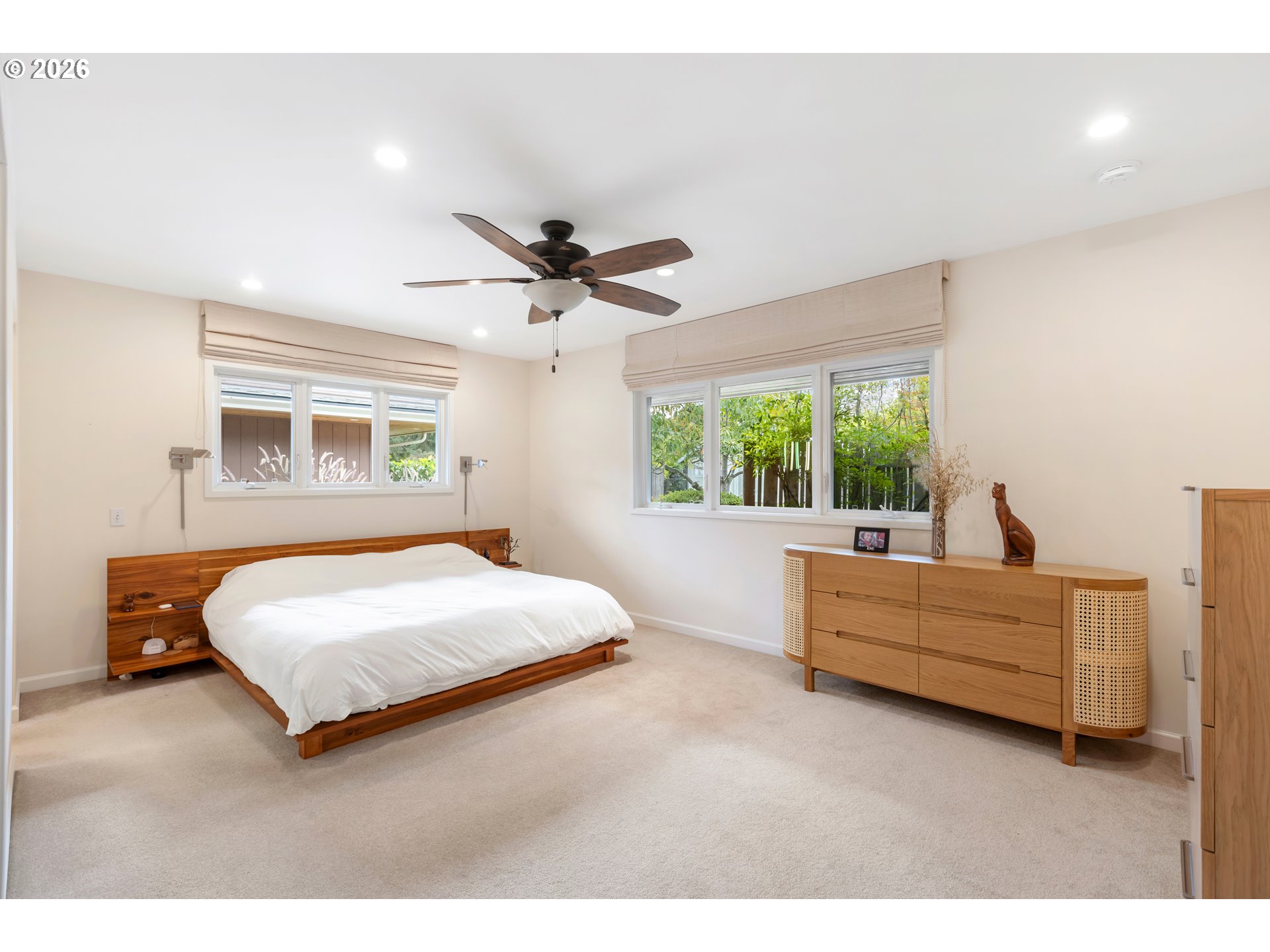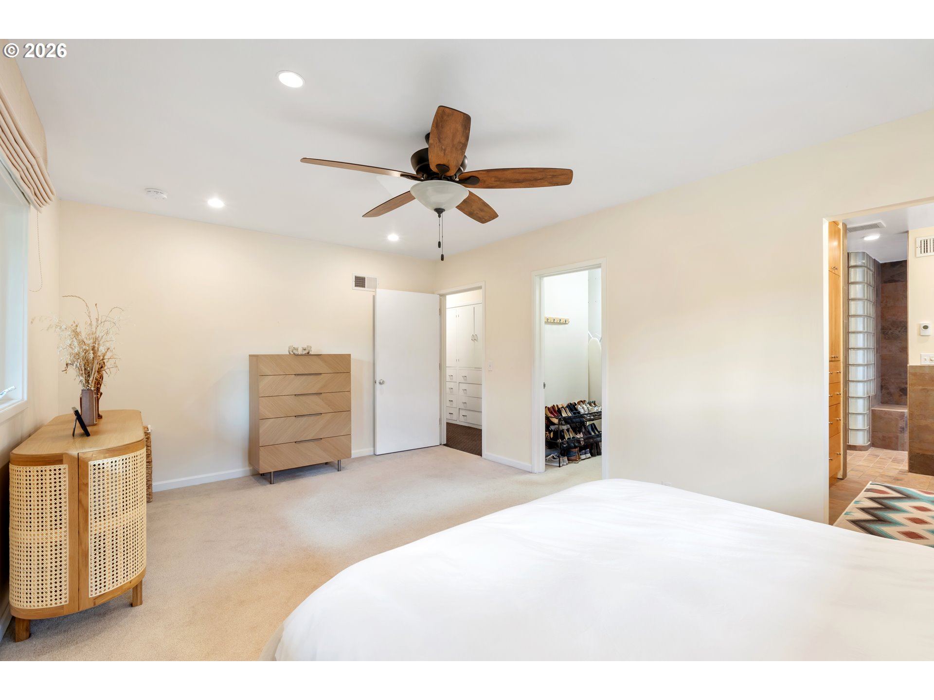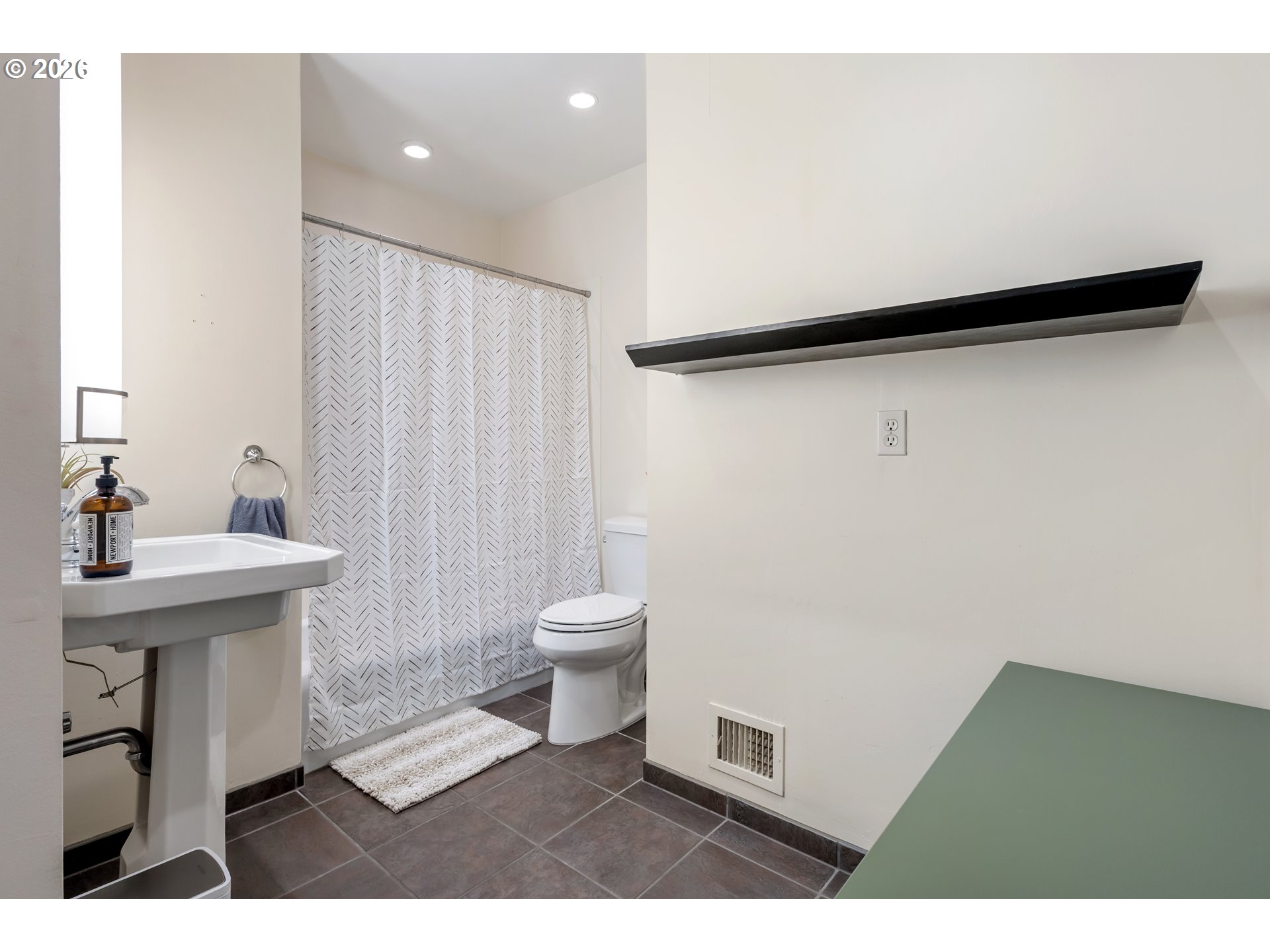 Experience the ultimate in mid-century luxury on this hidden 1.53-acre estate tucked away in the heart of Roseburg. An elegant paver parking area and large carport lead to beautiful flagstone pathways that guide you to the front door. The home opens to a tiled entryway with a convenient powder room for guests, leading into a breathtaking space where expansive windows flood the living and family rooms with natural light. Cozy fireplaces anchor each of these living areas, creating an atmosphere of warmth and sophistication. Gorgeous hardwood floors flow through the chef’s kitchen and formal dining area, where French doors lead you out to a private courtyard featuring a flagstone patio and a relaxing hot tub under a gazebo cover. The kitchen is upgraded with sleek quartz countertops and stainless steel appliances. The primary suite is a true sanctuary, featuring a large walk-in closet and a bathroom with custom tile work by David Hu, heated floors, and a massive walk-in tile shower with dual shower heads. An additional full bathroom is centrally located in the hallway near the bedrooms. Practicality meets style with a dedicated office and gigabit internet availability, a spacious laundry room, and a full bathroom with a luxurious steam shower. A huge bonus area with gorgeous exposed beams and its own fireplace provides a perfect secondary living space, including a bedroom with direct access to the pool area. The exterior is an entertainer’s dream, defined by exquisite tongue-and-groove woodwork. This gorgeous wood ceiling with recessed lighting wraps around the home, covering an aggregate-style patio that extends around the sparkling in-ground pool. For the hobbyist, a massive 4-bay shop with concrete floors, wood stove, and dedicated street access provides ample space. With a new roof and HVAC in 2022, this meticulously maintained estate offers an unparalleled lifestyle of seclusion just moments away from the vibrant amenities of downtown.