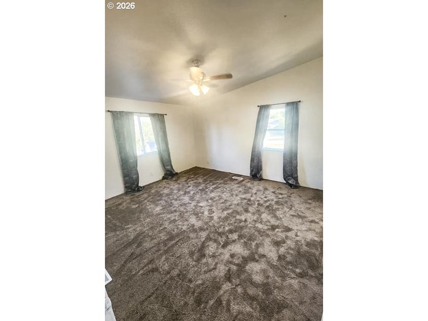 Manufactured home situated on three tax lots totaling .71 acres, offering ample space and RV parking. The property features established fruit trees and a spacious layout. Recent updates include a new hot water heater in 2025 and a roof overlay completed in 2023. Interior offers ceiling fans in all bedrooms and carpet flooring throughout. The primary suite includes a private bathroom and walk-in closet. Enjoy the vaulted living room with laminate flooring, along with a spacious kitchen featuring laminate flooring and a separate utility room for added convenience.