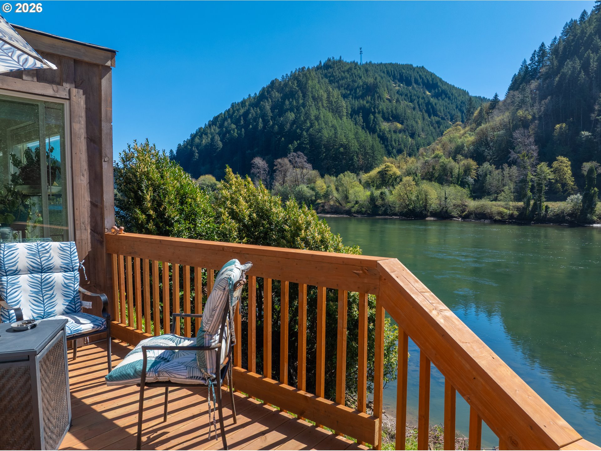 Fully rebuilt and remodeled, this Riverfront Home offers exceptional craftsmanship and a front row seat to life on the scenic Umpqua River—renowned for its outstanding fishing and abundant wildlife. Quality construction shines throughout, featuring pine exterior, solid hickory hardwood floors, granite countertops, and a spacious open concept layout. The expansive great room is designed to capture breathtaking river views through large windows that flood the space with natural light, where river otters and other wildlife can be enjoyed year-round. Thoughtfully designed for comfort and function, the home includes two generously sized bedrooms, two full bathrooms with large walk-in showers, and efficient year-round climate control with a ductless heat pump. Additional highlights include a new well and water system, RV parking and hookup, a separate boathouse, and a peaceful riverfront setting that truly brings nature to your doorstep. Furnishings may be negotiated with sale.