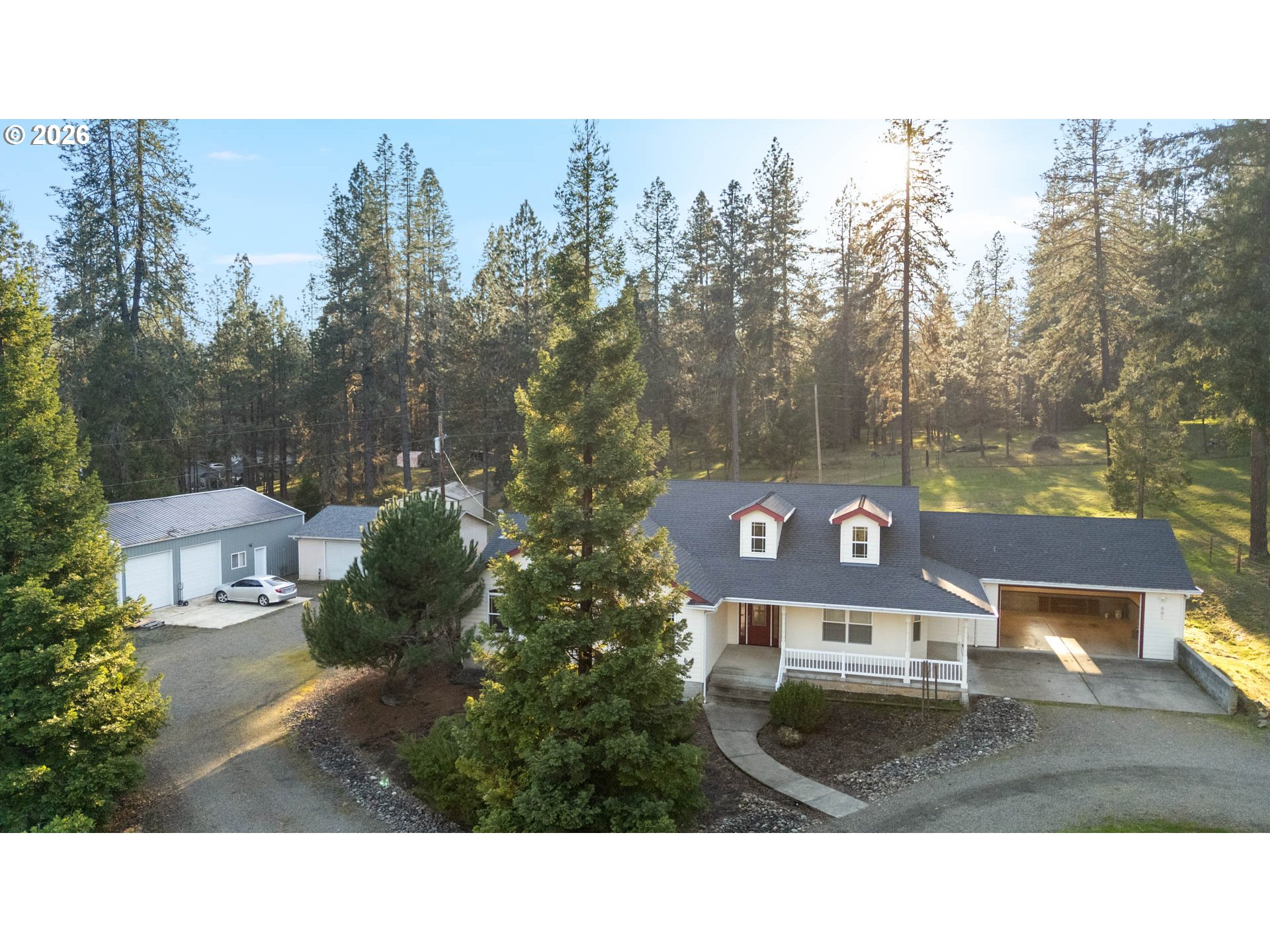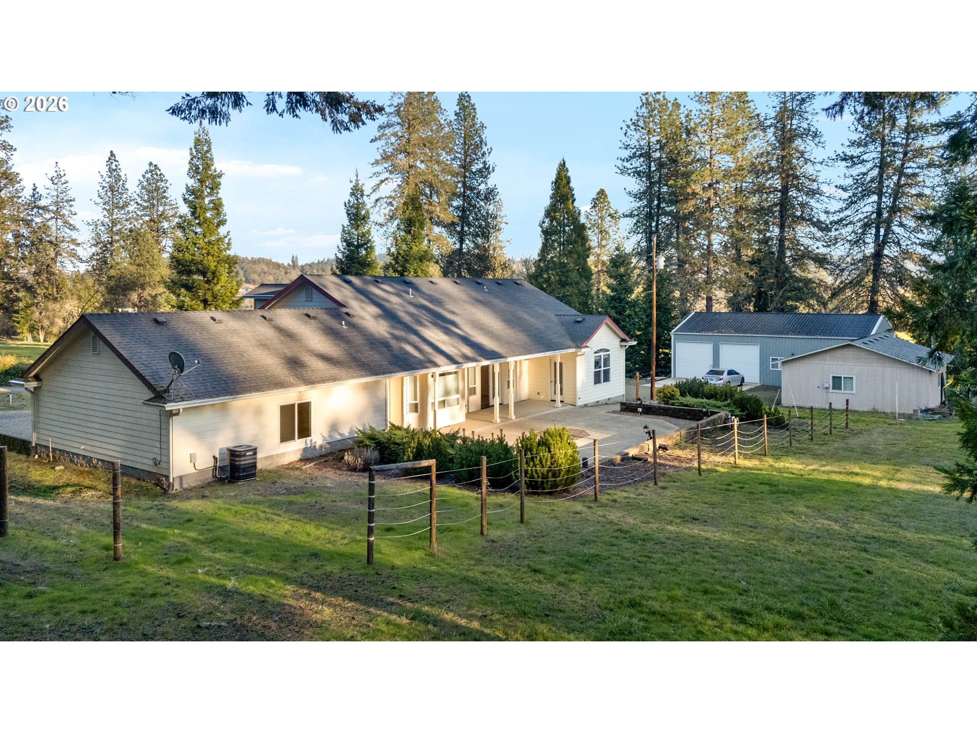This 2140 square foot home features 3 bedrooms, 2.5 baths all on one level and move-in-ready. 2.49 peacful, fenced Melrose acres. Updated kitchen including granite counters and all NEW appliances. Pantry, laundry room, dining room, this one has everything. Covered front porch and rear patio. PLUS, completed in 2022, a sturdy 1400 sqft shop with cement floor, 10' roll-up doors and a car lift! A separate garage/shop includes an additional half bath. Umpqua Basin Water. Storage galore.