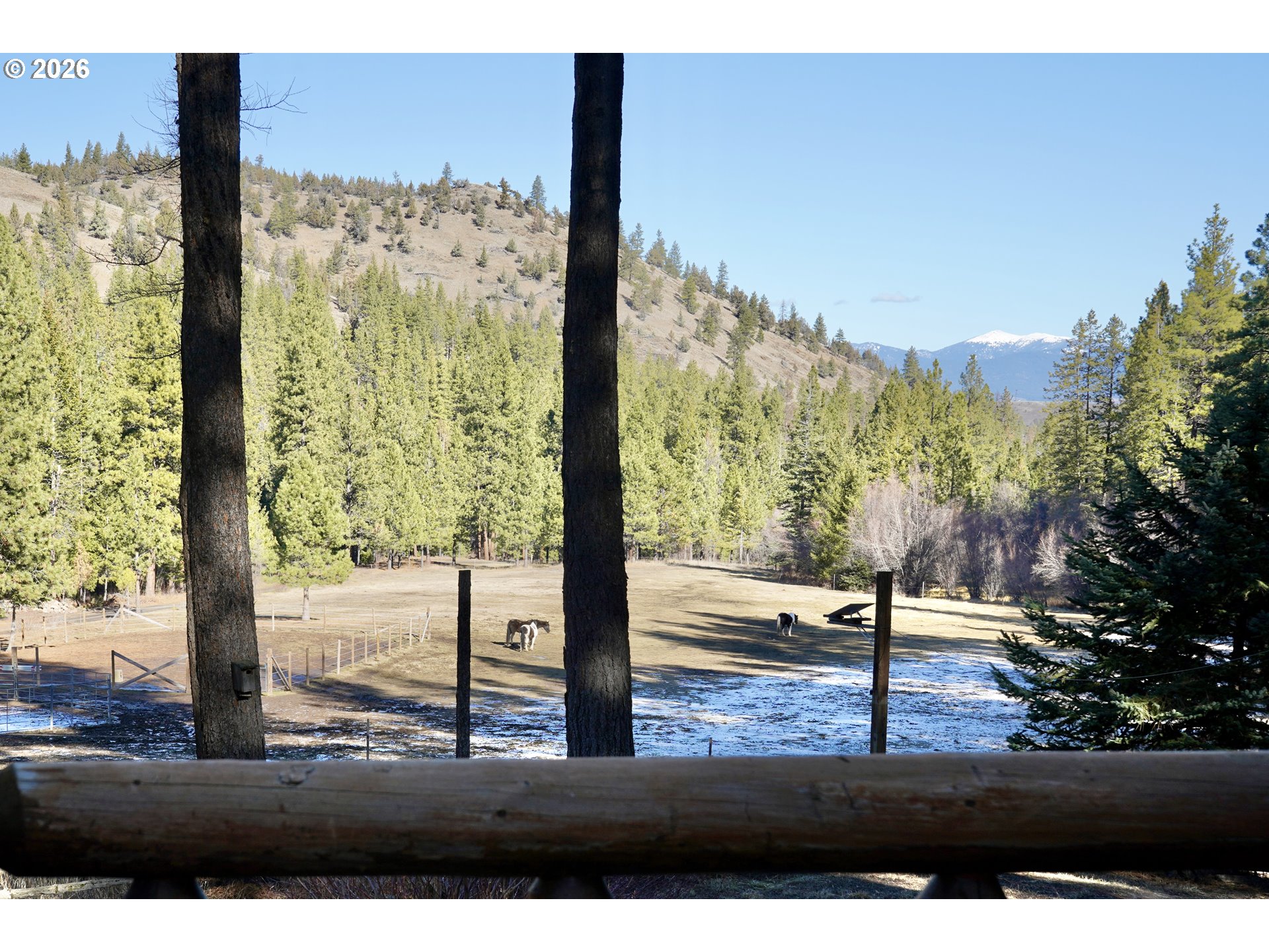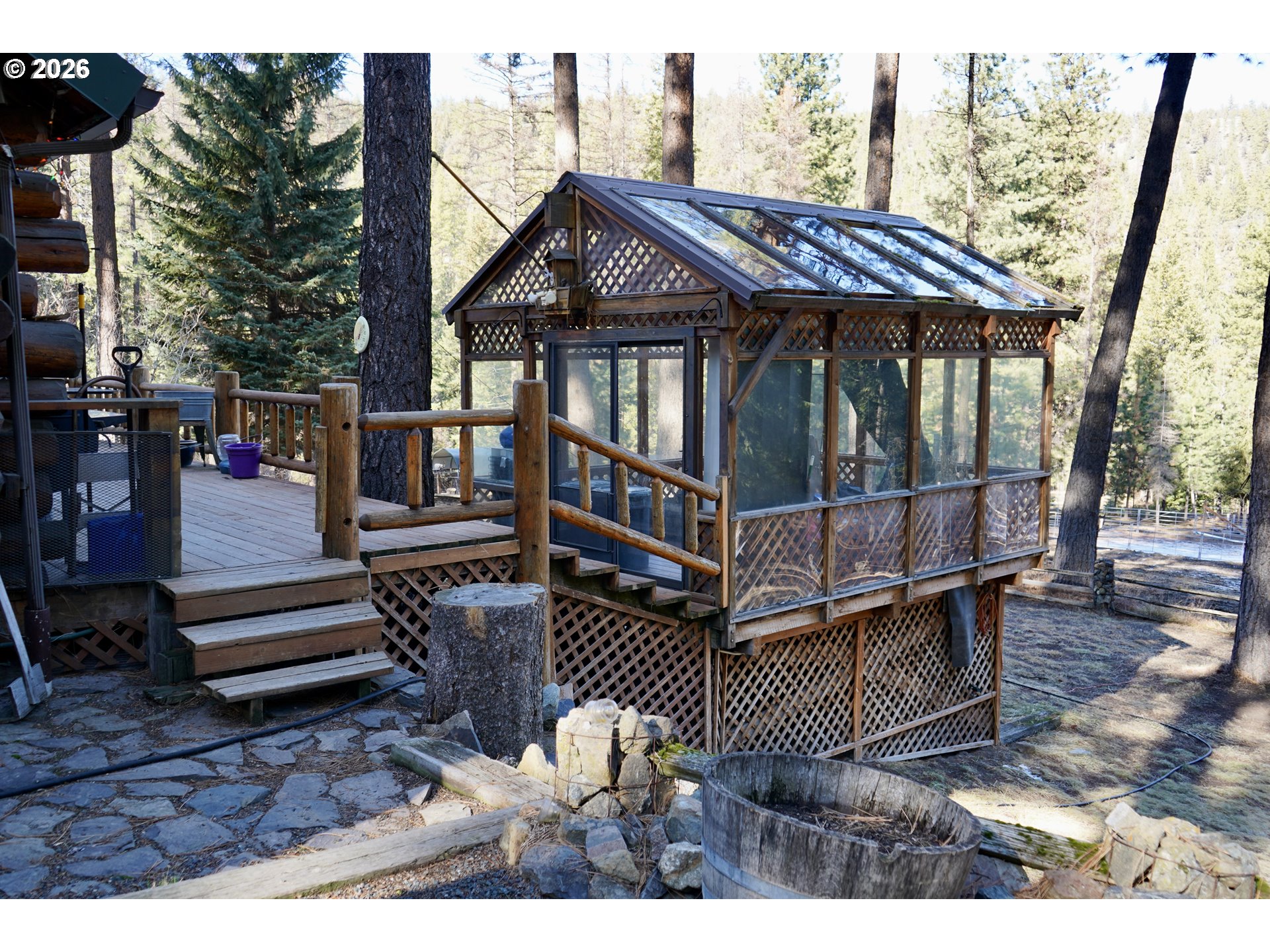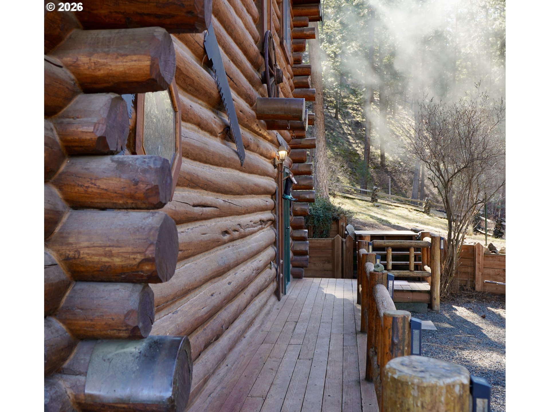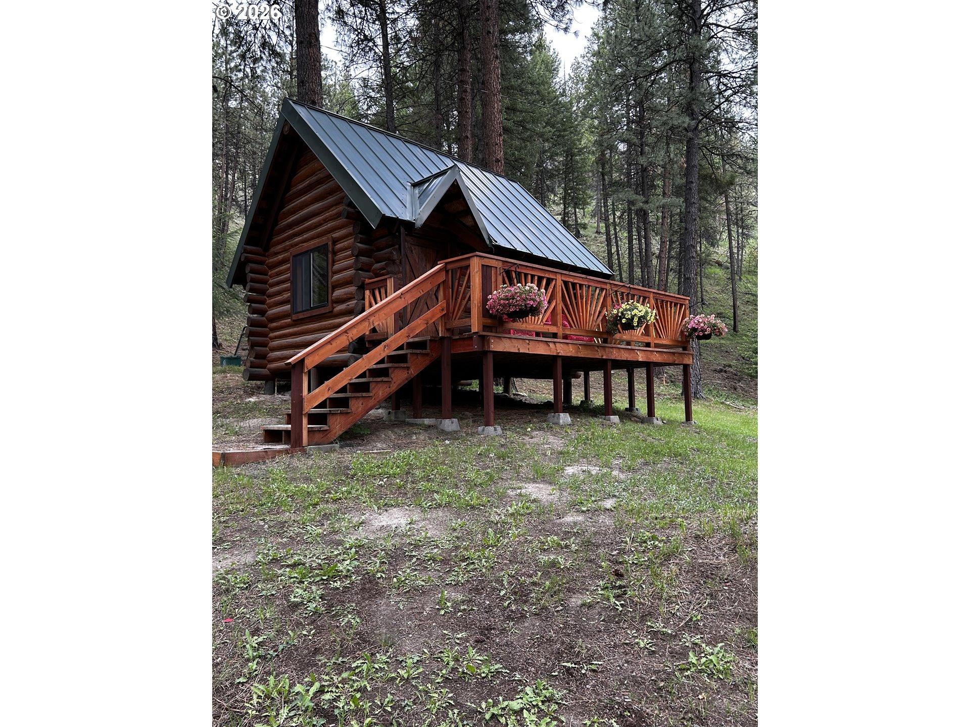 Discover the perfect blend of privacy, beauty, and self-sufficient living with this custom-built log home on timbered acreage just several miles from John Day. This property offers a rare combination of usable land and abundant water – ideal for homesteading, rural living, or a private retreat. The custom log home offers warm character and thoughtful design, featuring a main-level living room plus a second living area upstairs. The kitchen includes a propane range. Heating is provided by a wood fireplace with oil backup heat; the hot water heater also runs on oil. The home is supplied by one of several springs on the property, providing abundant water year-round. Step outside onto the expansive 621+/- square-foot deck and take in sweeping views of the irrigated meadow and the John Day Valley. A greenhouse connected to the deck extends your growing season, while attractive landscaping enhances the homesite. A log guest cabin with electricity sits near the main home. The 1,776+/- square-foot shop includes a loft for additional storage and is currently set up with half used as a workshop and half as a gym. Two powered shipping containers provide additional storage options. Access is provided by a well-maintained graveled road. The land is beautifully timbered with multiple conifer species and includes 3.5 acres of flood irrigation water rights. The irrigated meadow is fully enclosed with electric fencing and is ideal for hay production, horses, or a few cows. Pine Creek flows year-round through the property, complemented by several spring-fed ponds. A larger pond with a dock creates a peaceful setting to relax and enjoy the sounds of nature. Wildlife is abundant, with mule deer, turkey, and other native species frequently seen on the property. This property is perfectly suited for those seeking privacy and rural living without sacrificing proximity to town. *Shown by appointment only to pre-qualified buyers – Contact your agent to schedule a tour- Do not trespass*