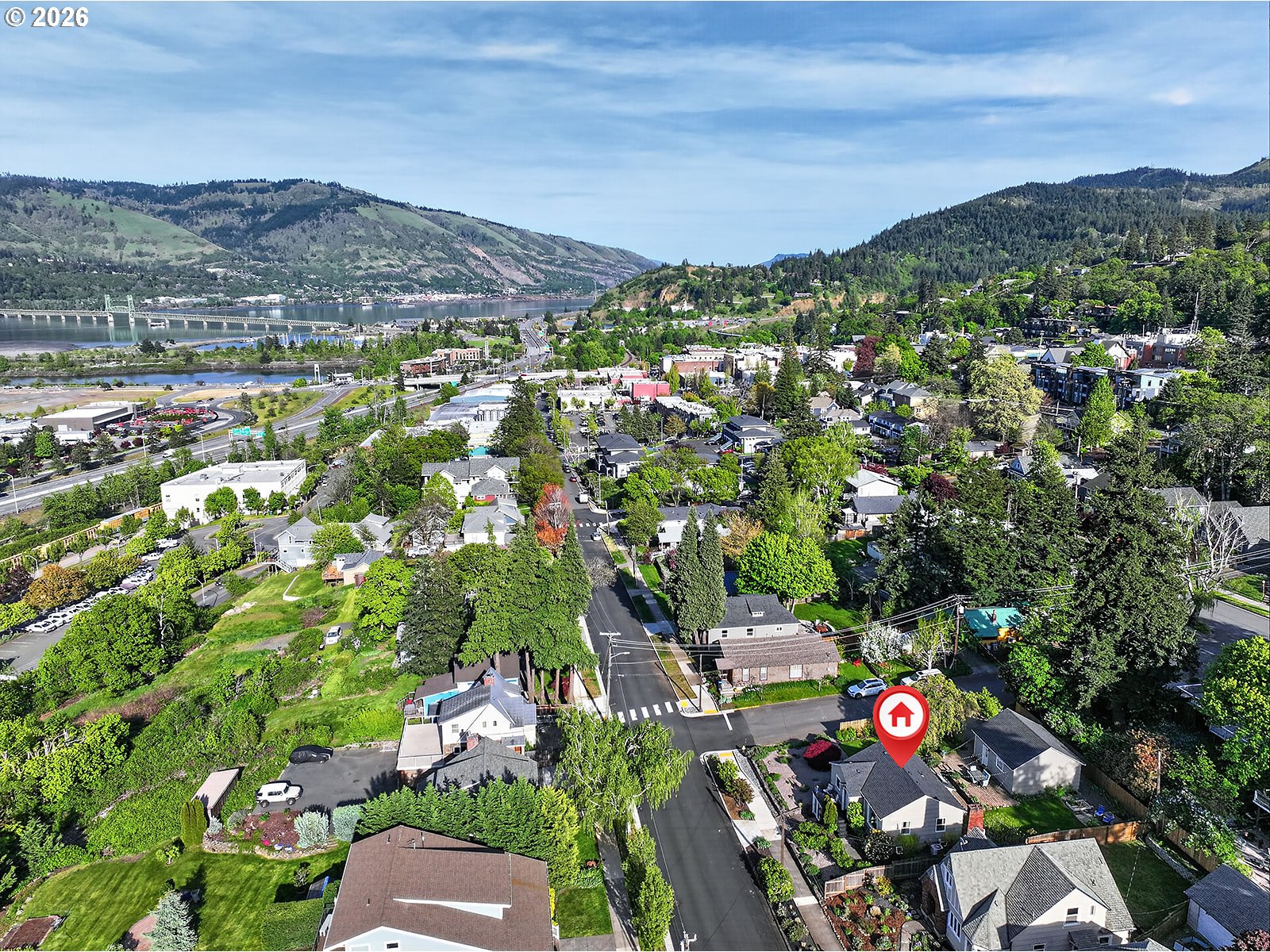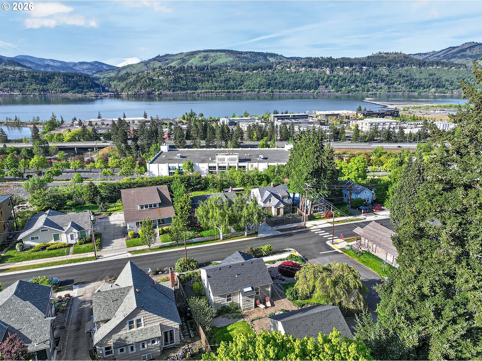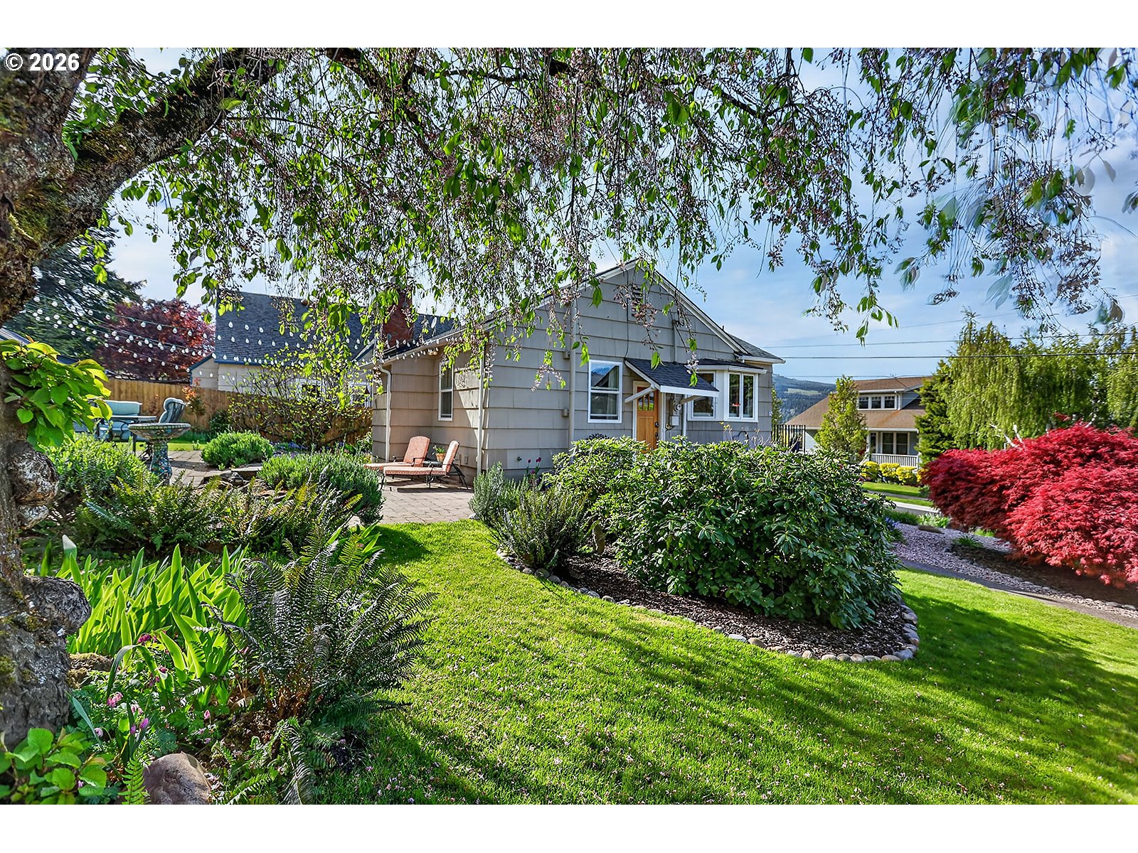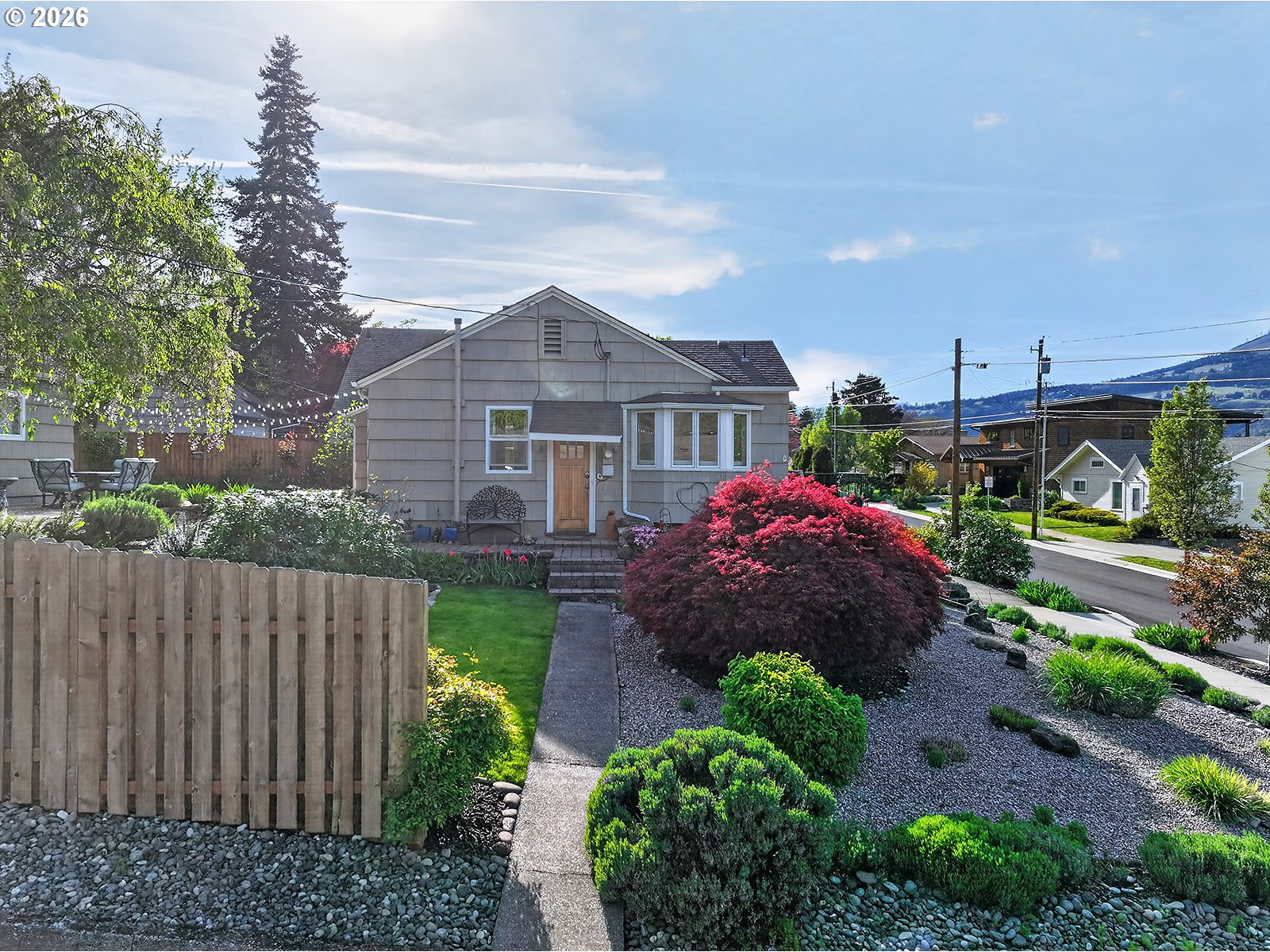 Location, Location, Location!! With peeks of Mt. Adams and the Columbia River, this classic meticulously maintained home is on one of the most desirable streets in the heart of Hood River. This large oversized .16 acre corner lot has established plantings and an irrigation system to keep it lush and green. Main level features hardwood floors throughout the updated kitchen/nook with stainless steel appliances, 2 bedrooms, bath and living room with views of the river and mountain. Lower level offers hardwood flooring in primary bedroom with large walk-in closet, slate floor family room with built in wood bookcase and French doors to Columbia Street, full bathroom has radiant heated floors and utility room with tankless water heater. Exterior features a detached 2 car garage, fun paver patio and fenced backyard lawn entertainment area. Short walk to downtown or stay in your own private space. Best of both worlds!