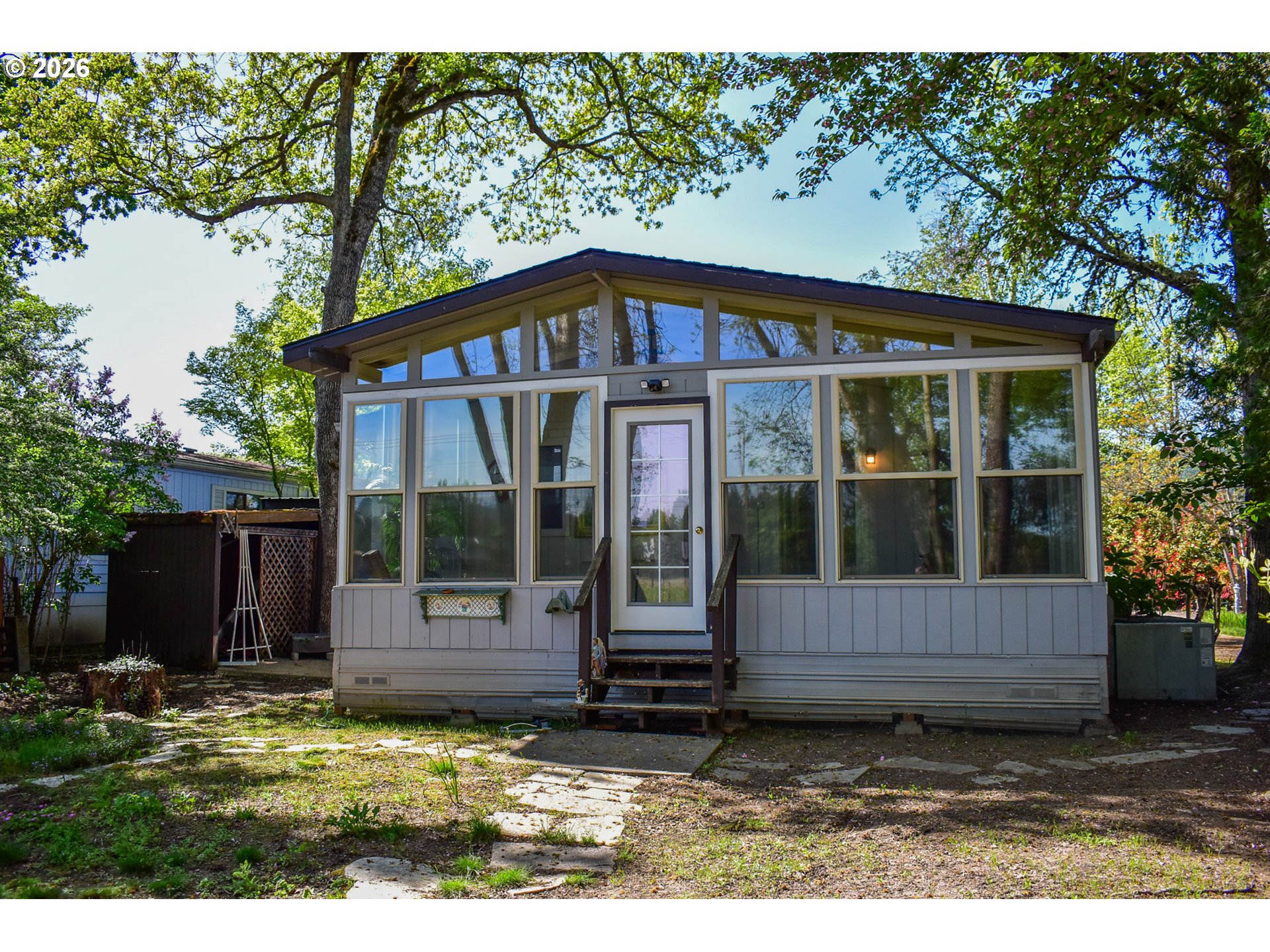 Nestled between a canopy of mature trees and landscape, this move-in ready home offers newer floors, double paned windows, central heat and air, and lots of extras. 2 roomy bedrooms both with attached bathrooms. Extra living space with the ''Sunroom/Bonus Area'' for entertaining, yoga, or hobby room! Indulge in quiet mornings or long summer evenings on the covered front porch. Built in 1988, this perfect property includes vaulted ceilings, nice size living, dining, and kitchen areas. Lots of storage, and natural light. Roof is approx 8 years old per seller. Woodland-like privacy makes every day delightful! Space rent currently $683/mo & includes water, trash, sewer. Park approval is required before close of escrow, and may involve an application fee from Park. Royal Estates Park is 55+ age minimum. Includes refrigerator. Enjoy elegant Jacksonville lifestyle with ease, and just blocks from downtown! Royal Mobile Estates & easy to show! Owner has replacement property in place.