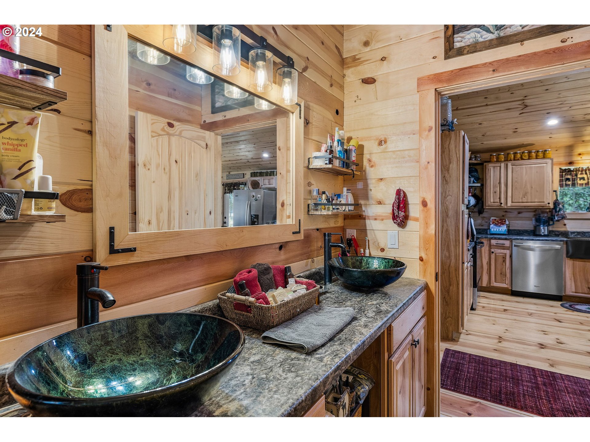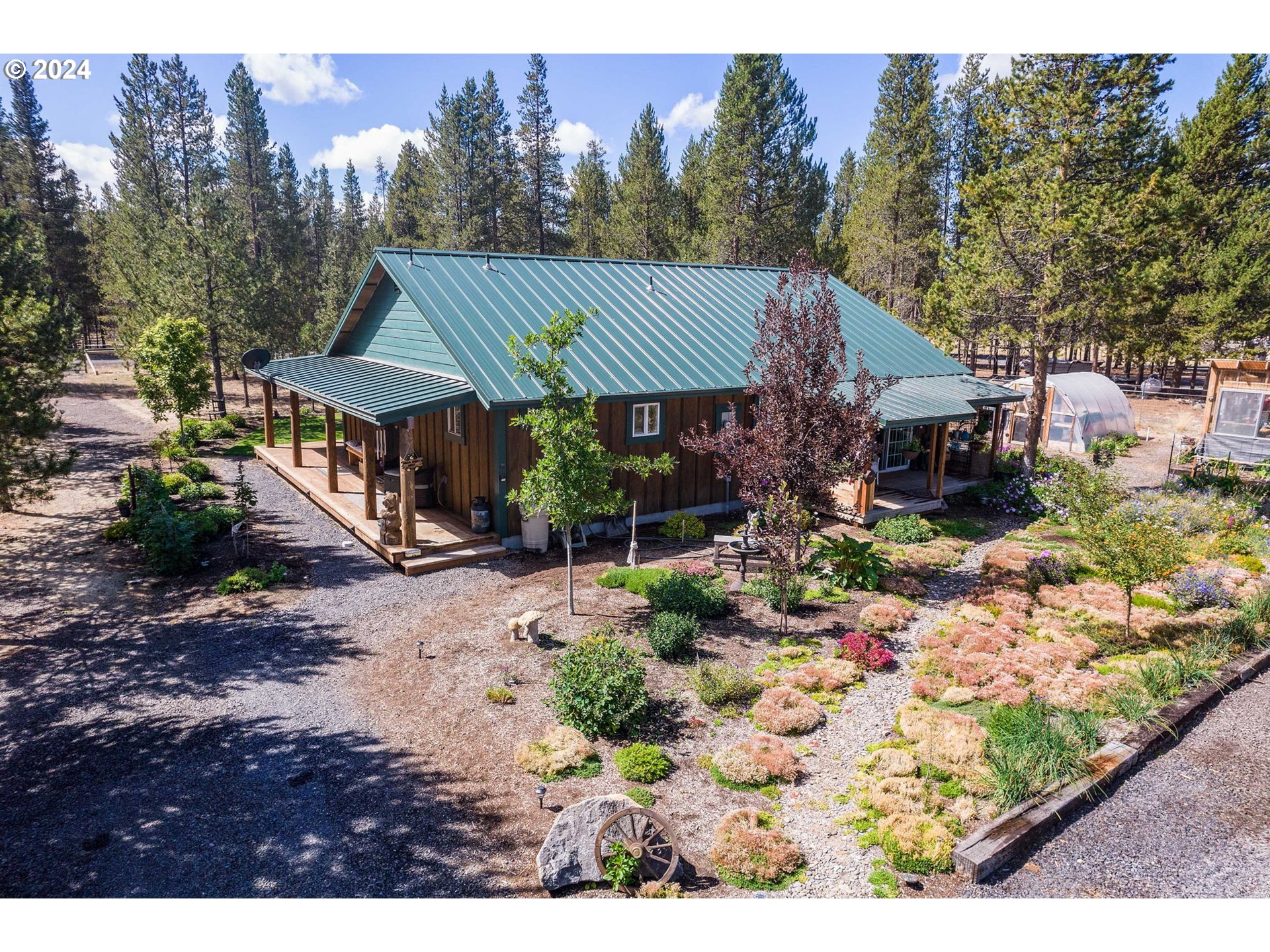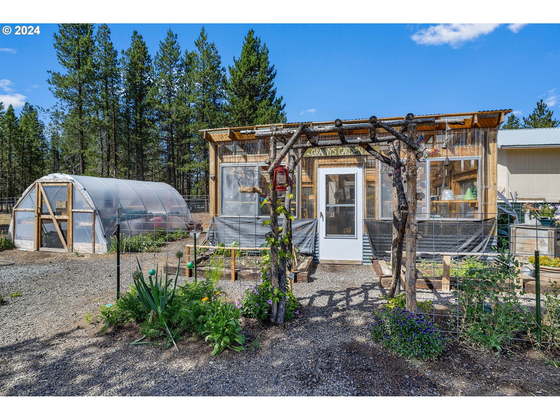 Ever dreamt of a self-sustainable, Little House on the Prairie lifestyle? This charming 2-bedroom, 1.5-bath, 1200 sq ft home offers just that. Adorned with 1x12 hand-finished pine plank floors, pine walls, and elegant hickory cabinets, every inch exudes rustic charm and quality craftsmanship. The home features a double vanity, a cozy pellet stove, and modern comforts with fully fenced surroundings and a spacious garage. With inground sprinklers, 4 greenhouses, serene water features, a chicken coup, and a smokehouse, covered decks with lighting, you can embrace self-sufficiency. Fruit trees dot the abundance of gorgeous landscaping, adding to the home's idyllic setting. If you're ready to live your homesteading dream, this property awaits!