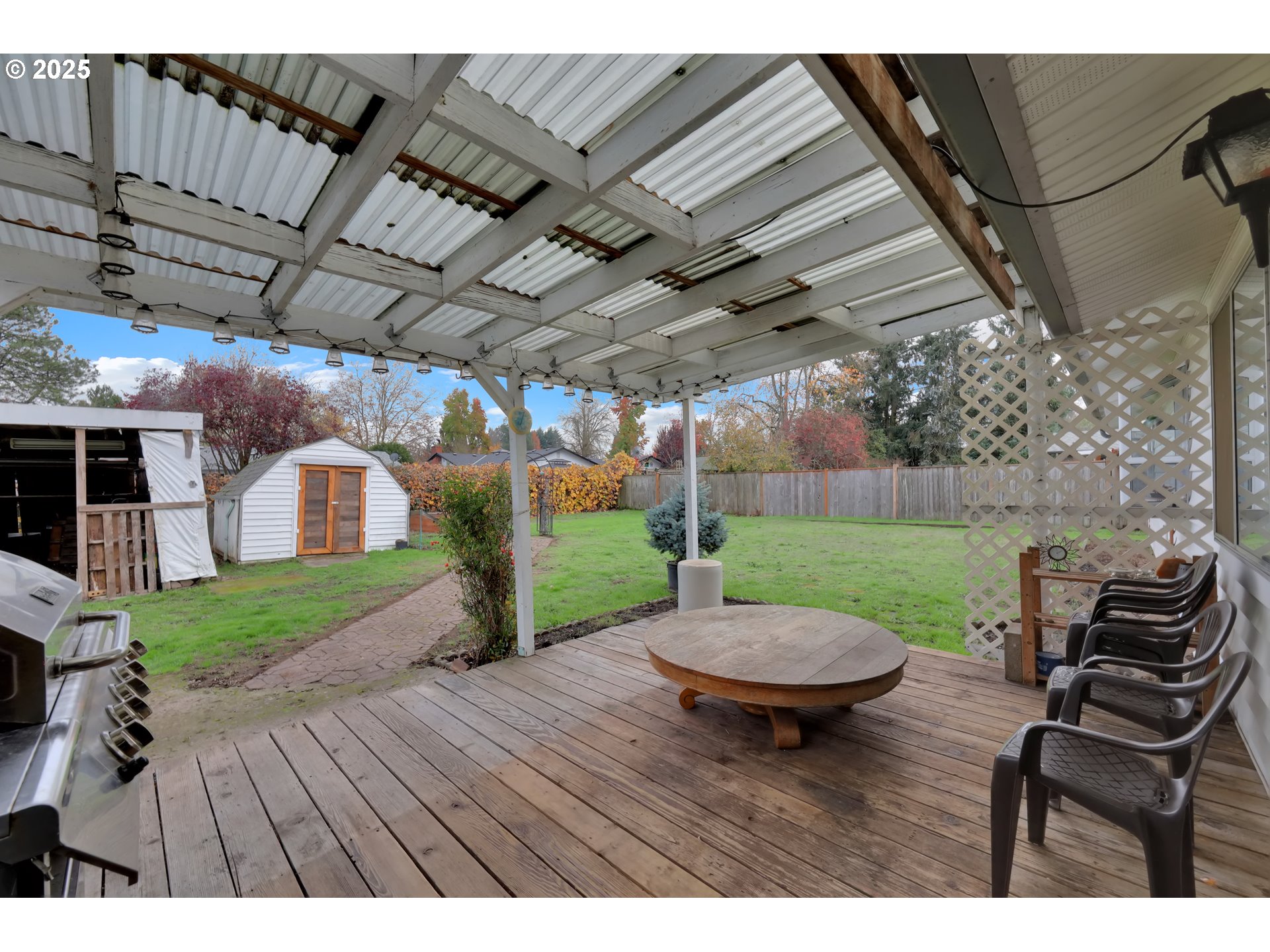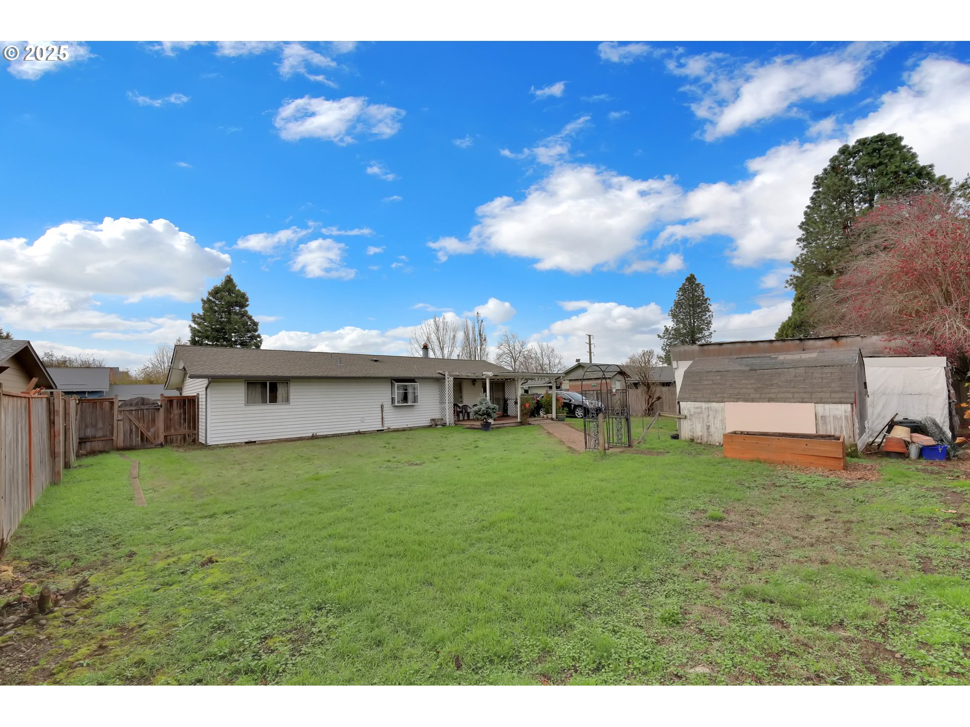 Spacious Yard, Fresh Updates, and Covered RV/Boat Storage—This One Has It All! Well-maintained single-level home in a quiet Eugene neighborhood! This 3-bed, 1-bath property features a spacious living room with a brick fireplace and picture window, a bright galley kitchen with abundant storage, and two flexible dining areas. Convenient laundry/pantry off the kitchen. All bedrooms offer comfortable space and good closets. Major updates include a brand-new furnace, new water heater and newer roof for peace of mind. Enjoy the extra-deep, fully fenced backyard with two storage sheds, raised beds, and a large covered deck for year-round outdoor living. The extra-long driveway includes gated, covered RV/boat parking in addition to the attached garage. Close to parks, schools, shopping & transit—move-in ready and exceptionally cared for!