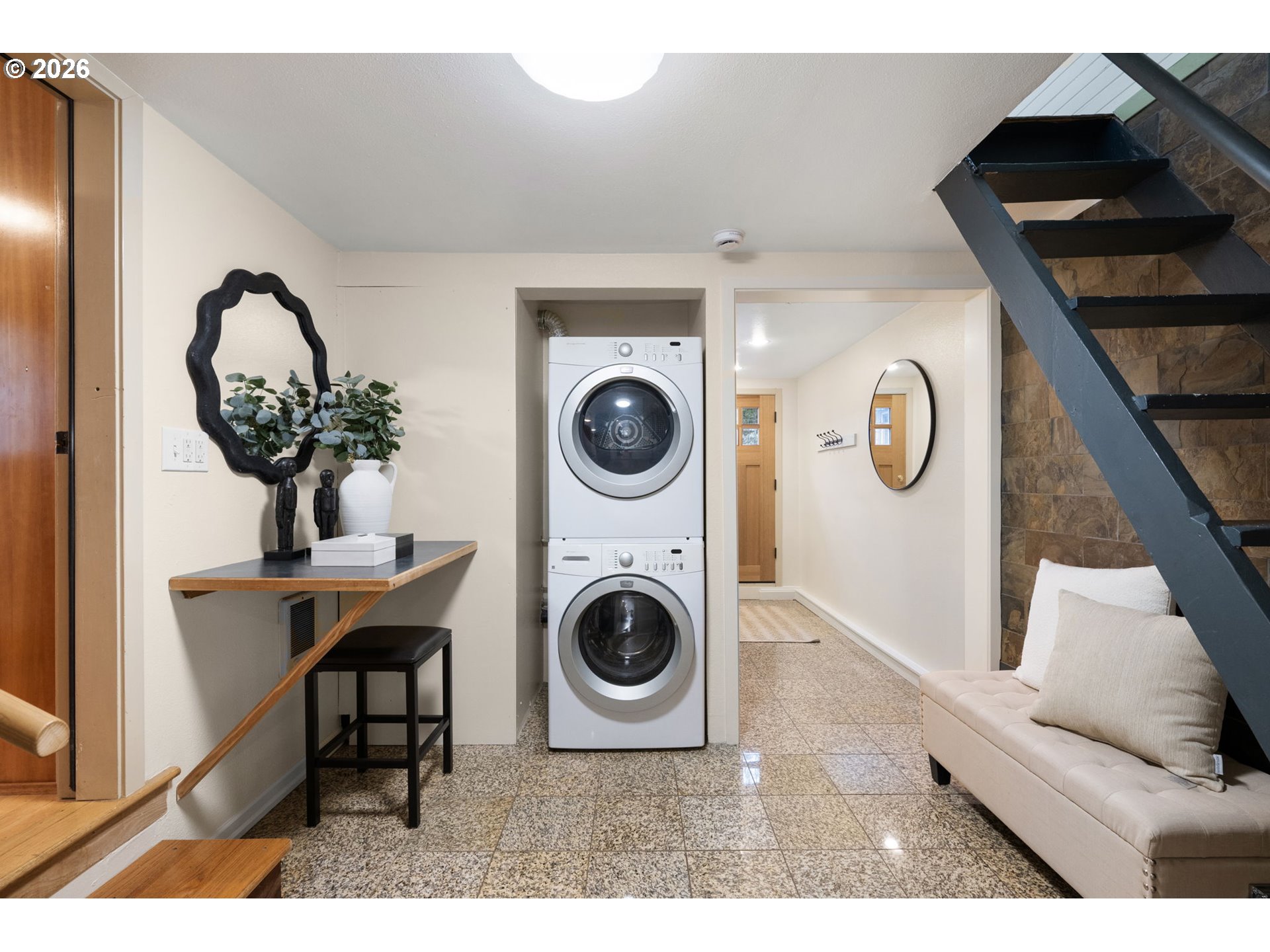 CeilingFan, Laundry, TileFloor, WasherDryer, WoodFloors