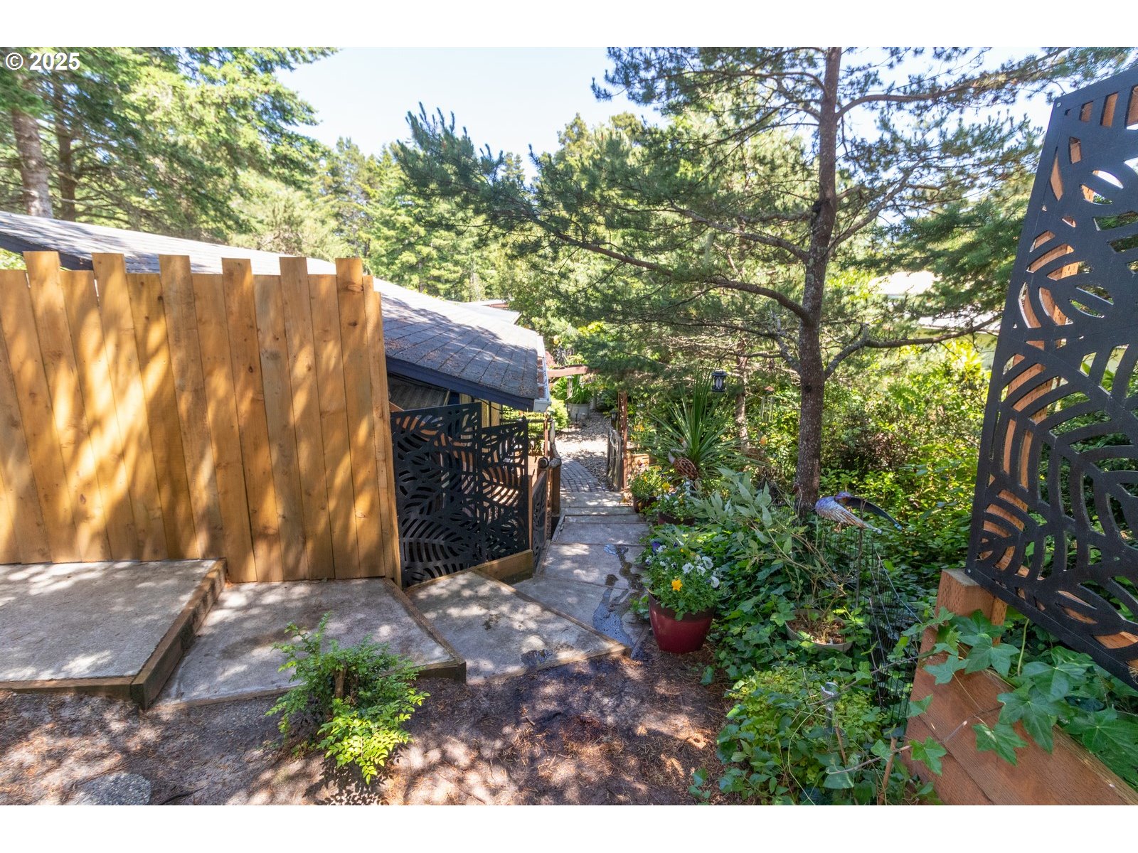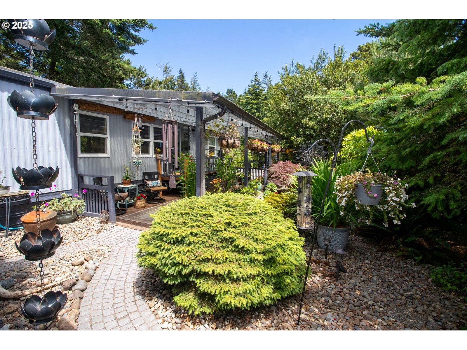Perfect for a weekend getaway or full time Coastal Living. This beautiful serene peaceful setting invites you to stay awhile in this charming 1 bedroom, 1 bath updated singlewide in Greentree's 55+ community. Large, covered porch to enjoy the serene garden with brick pathways, arbor with steps to an extremely private sitting area with fire pit to unwind and totally relax. Small fenced area for pets, separate shop with electricity & storage area. Mini split in living area, knotty pine wood paneling, doggy door, built in bookshelves. Kitchen offers Samsung glass top stove, Whirlpool stainless refrigerator with ice maker, built in hutch and new flooring. Carpet throughout approximately 2 years old. Bathroom with built in drawers, bath with tub, shower/laundry room (washer & dryer excluded) Updates with newer roof, windows, electrical, mini-split heat pump. Remodeled bathroom, exterior and interior painting, RV hook-ups for smaller RV and 30amp, water and sewer. Don't miss the opportunity to call this one home. Minutes to shopping, medical facilities, library, Historical Old Town, Golf course, ATV dunes rides and not to mention the beautiful Coastal Beaches. HOA fees include cable, internet, garbage, water and sewer.