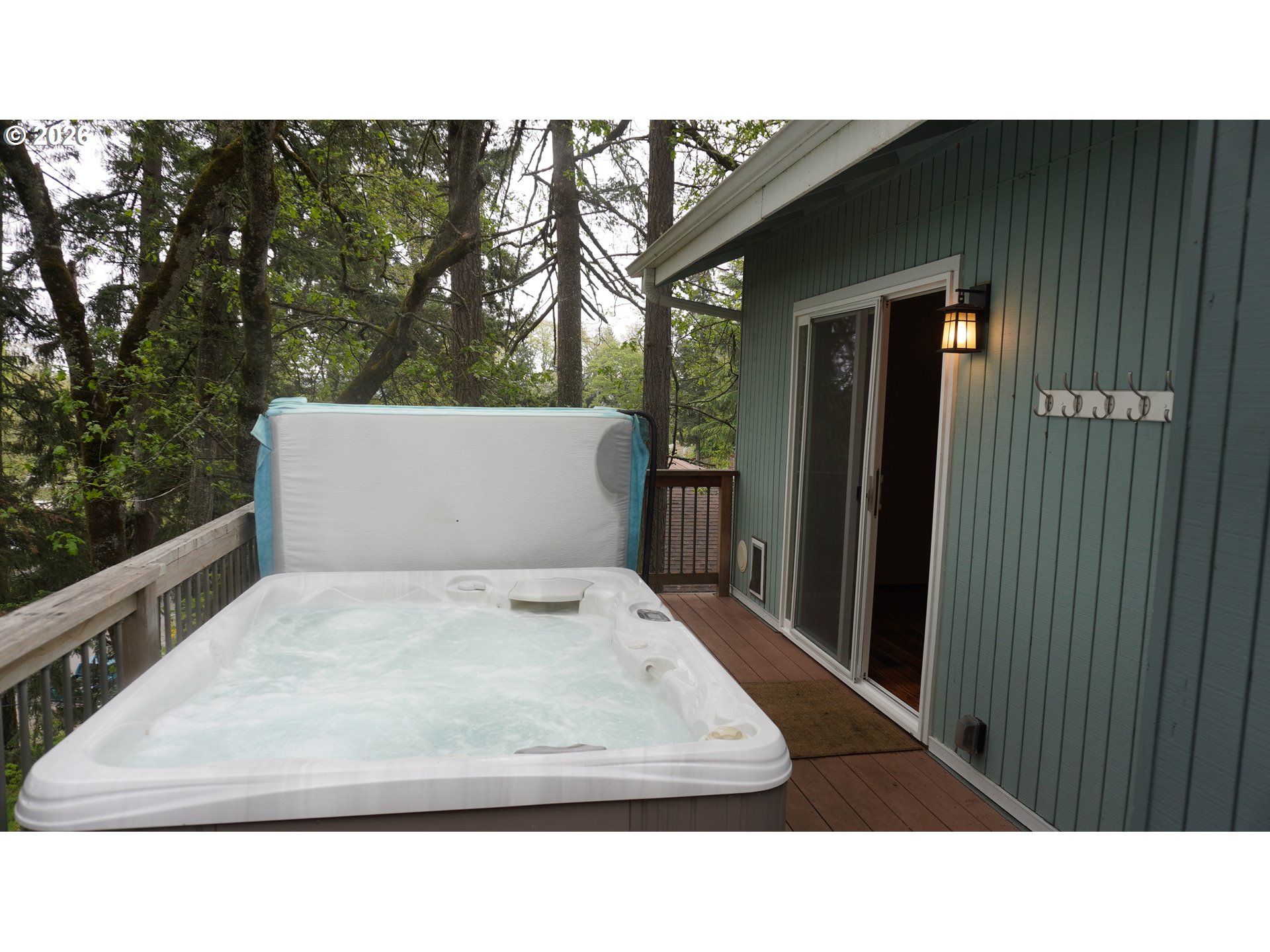 Claim this elevated, cul-de-sac privacy amongst tall firs with northerly Mount Tom, Coburg Mountains, & city light views; this is only the beginning of many features enhancing this beautifully updated, Northwest Contemporary home. You will find quiet living & serenity surrounded by soaring vaulted ceilings with clerestory windows, glass French doors, extensive engineered Acacia hardwood flooring, a renovated kitchen with solid, knotty Alderwood cabinetry, granite slab countertops with a full backsplash & peninsula bar, updated appliances including a gas range/oven & a newer GE stainless steel refrigerator, light fixtures & ceiling fan, a floor-to-ceiling, full-wall stone hearth, a fully permitted woodstove insert for cozy winter nights, tile shower & acrylic surrounds, a new, fully permitted gas furnace (2026), central A/C, and vinyl windows. Exterior amenities include a covered rear wrap deck for entertaining, featuring a natural gas plumbed BBQ center (BBQ included) and a bubbling hot tub also included. Access to the hot tub is also available via a privacy slider off of the main floor bedroom & bath ensuite. The floorplan provides three bedrooms, three full baths, a remodeled kitchen, an adjacent dining area with slider access to the covered deck, a great living room with vaulted ceiling, a lower recreation room with a dedicated, full bath and private deck, an attached carport with a 240v outlet for your EV, an oversized 1-car garage, and a detached storage shed. Abundant natural light combined with a woodsy setting makes for a bright & peaceful sanctuary.