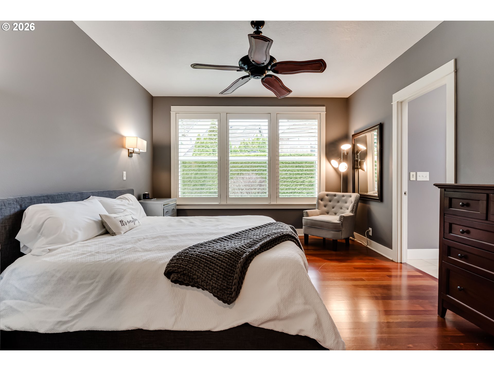 Impeccably maintained home with elevated finishes and a thoughtfully designed floor plan. Rich hardwood floors lead into a light-filled open living space with a cozy gas fireplace. The kitchen features quartz countertops, a large island, and ample space for cooking and gathering. The main-level primary suite offers privacy and comfort. Upstairs includes two bedrooms, a full bath, and a spacious bonus room that can serve as a fourth bedroom, office, or media room. Enjoy a private backyard with covered patio, built-in fire pit, and low-maintenance turf with a putting green, surrounded by mature hedges. Attached three-car garage. Located on a quiet cul-de-sac near shopping, dining, and commuter routes.