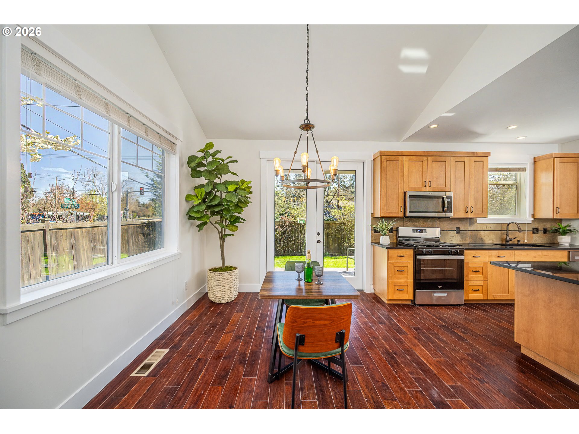 Clean lines, open spaces, and a sense of light define this contemporary home, where modern design meets everyday comfort. The layout flows effortlessly, with expansive living areas, vaulted ceilings, and a gas fireplace anchoring the spacious great room—perfect for both relaxed evenings and gathering with friends.The kitchen is designed to be both functional and inviting, featuring a large center island, a new gas range, and easy access to the backyard for seamless indoor-outdoor living. Just beyond, a lush yard offers a quiet backdrop for morning coffee or weekend entertaining.The main-level primary suite provides a peaceful retreat, complete with a large window overlooking the backyard and a beautifully tiled, step-free walk-in shower. Upstairs, three additional bedrooms offer flexibility for guests, work, or hobbies.Set in a desirable location near Oakway Center for shopping and dining, with convenient access to Sheldon High School and the trails and open spaces of Alton Baker Park, this home strikes a thoughtful balance between neighborhood charm and everyday convenience.