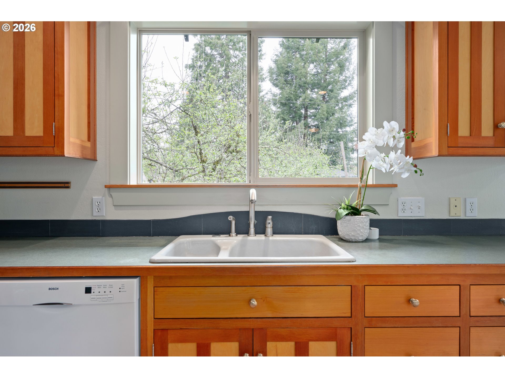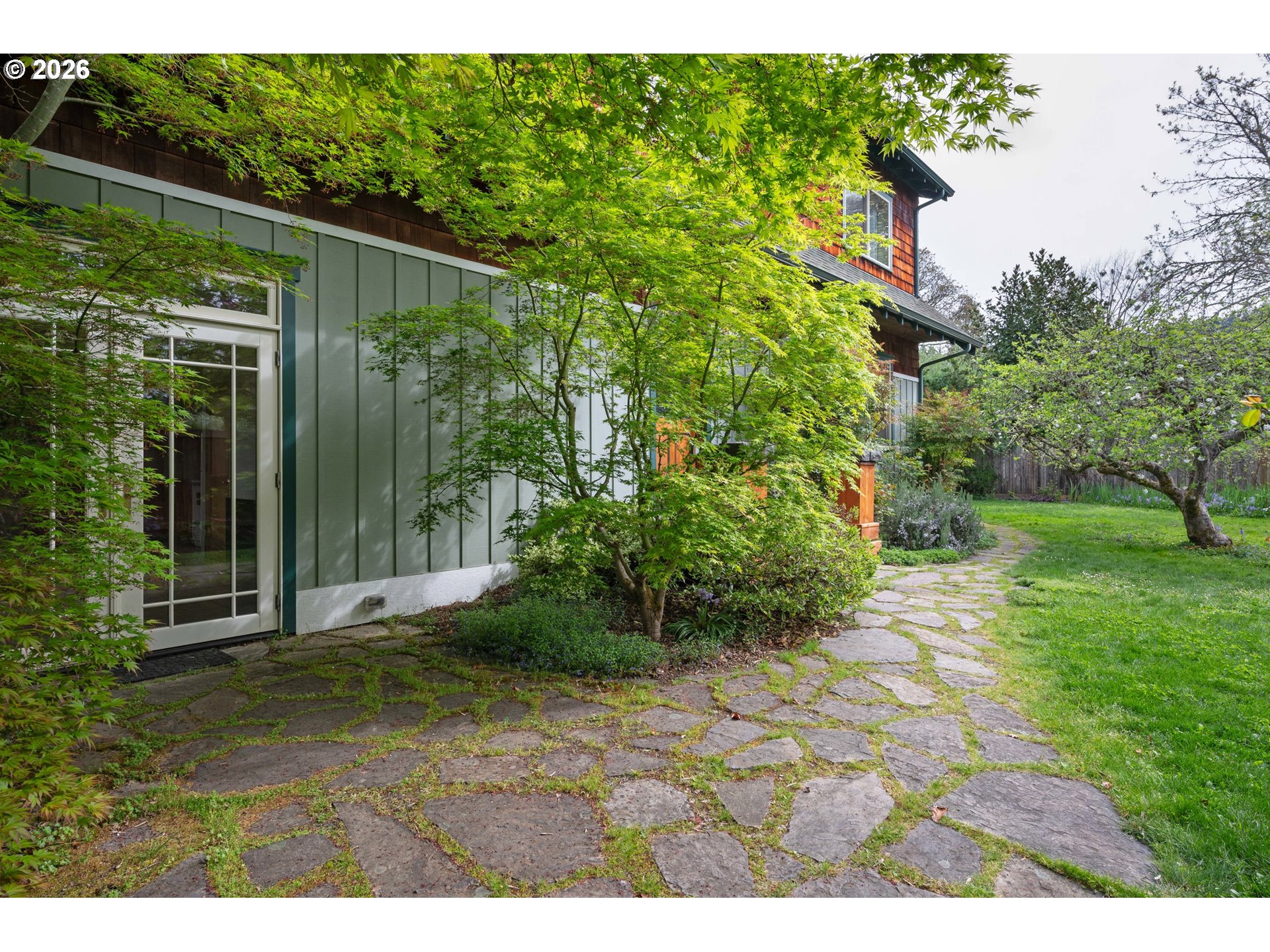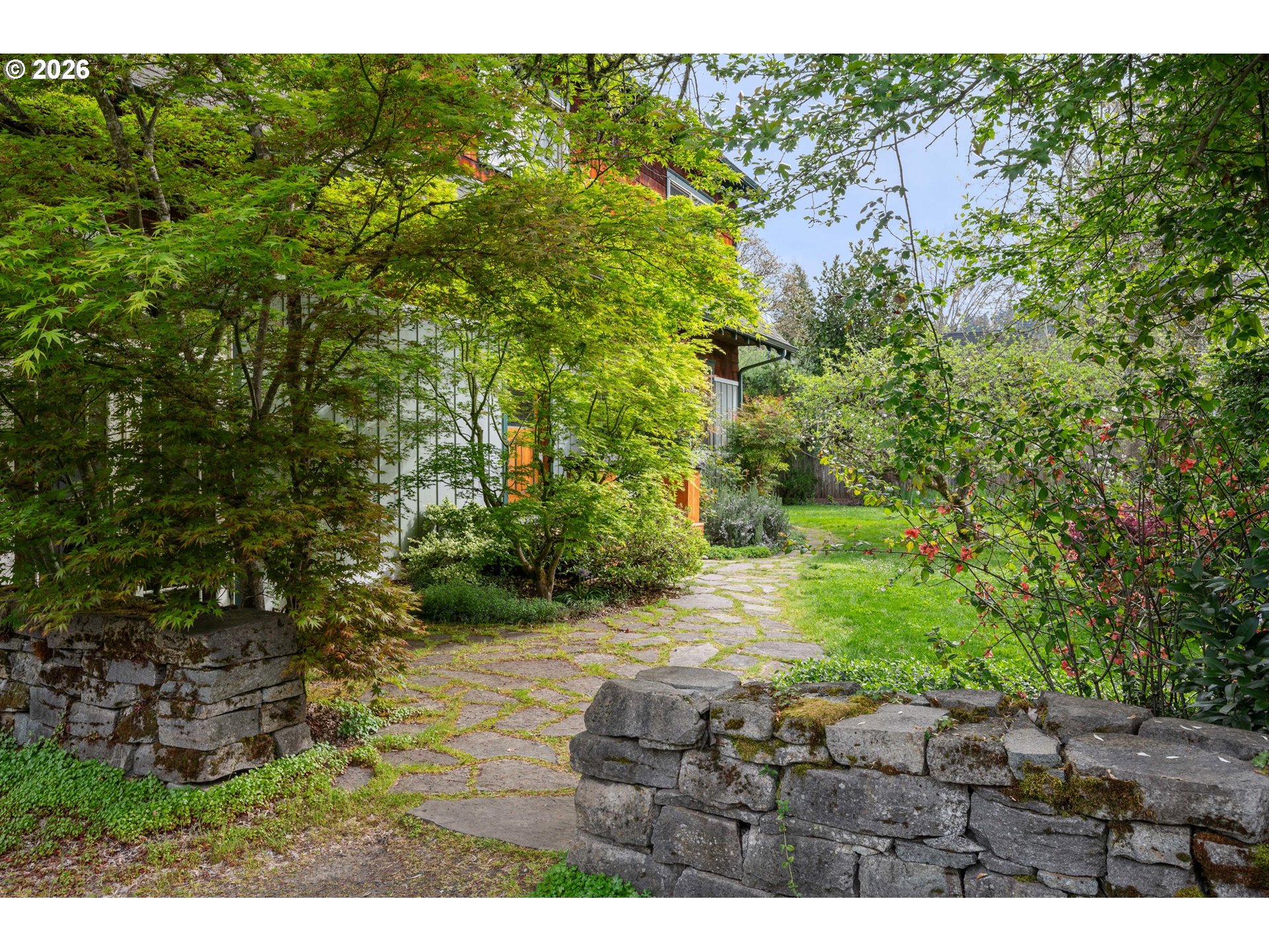 Open house 4/11 from 1-3pm! Charming and spacious, this home is set within a former apple orchard and surrounded by lush garden views from every window. Located in the desirable South University neighborhood, it offers a peaceful, natural oasis with a warm and vibrant feel. Step into a light-filled living room featuring fir and maple built-ins, maple hardwood floors, and 9-foot ceilings. Thoughtful details include a granite-topped island, stainless steel appliances, honeycomb blinds, and handcrafted art glass in the front door. This inviting home offers four bedrooms, two and a half baths, and nearly 2,400 square feet of living space, with flexible dual-living potential. Additional highlights include owned solar panels and a large lot with possible building opportunities. Conveniently proximity to Edison Elementary, the University of Oregon, the YMCA, parks, shops, and restaurants. Truly a special property—come experience it for yourself.
