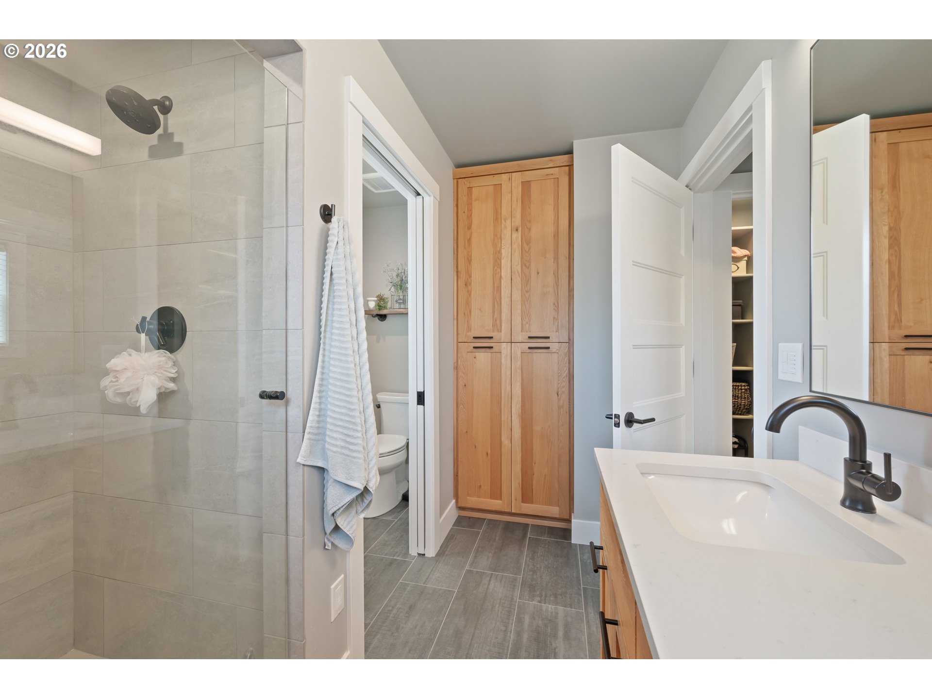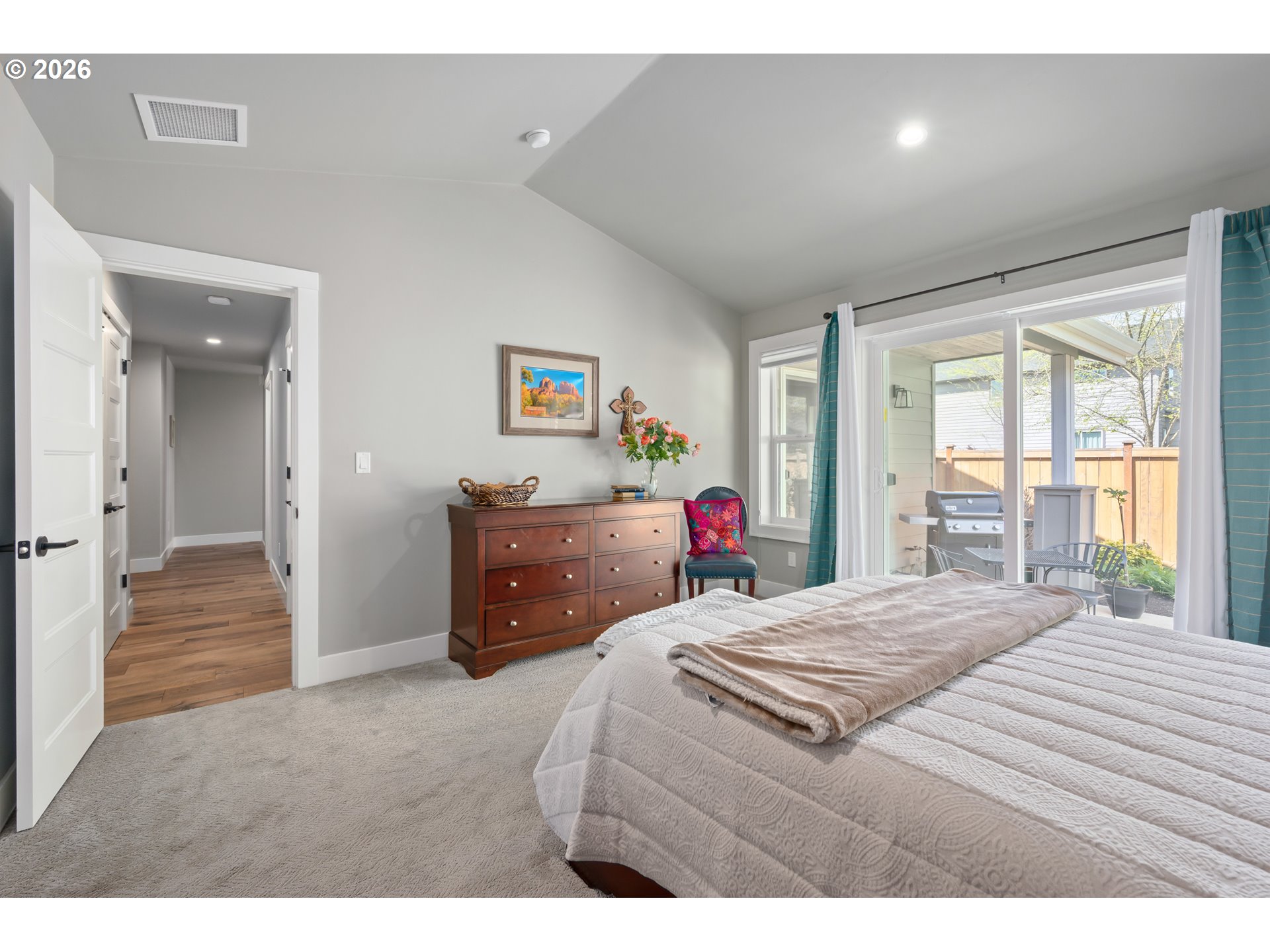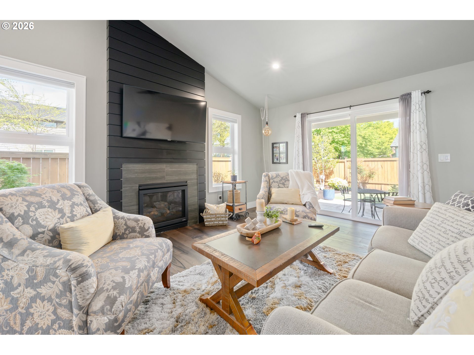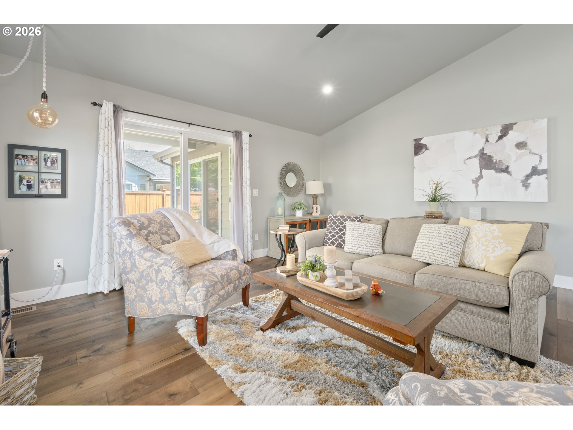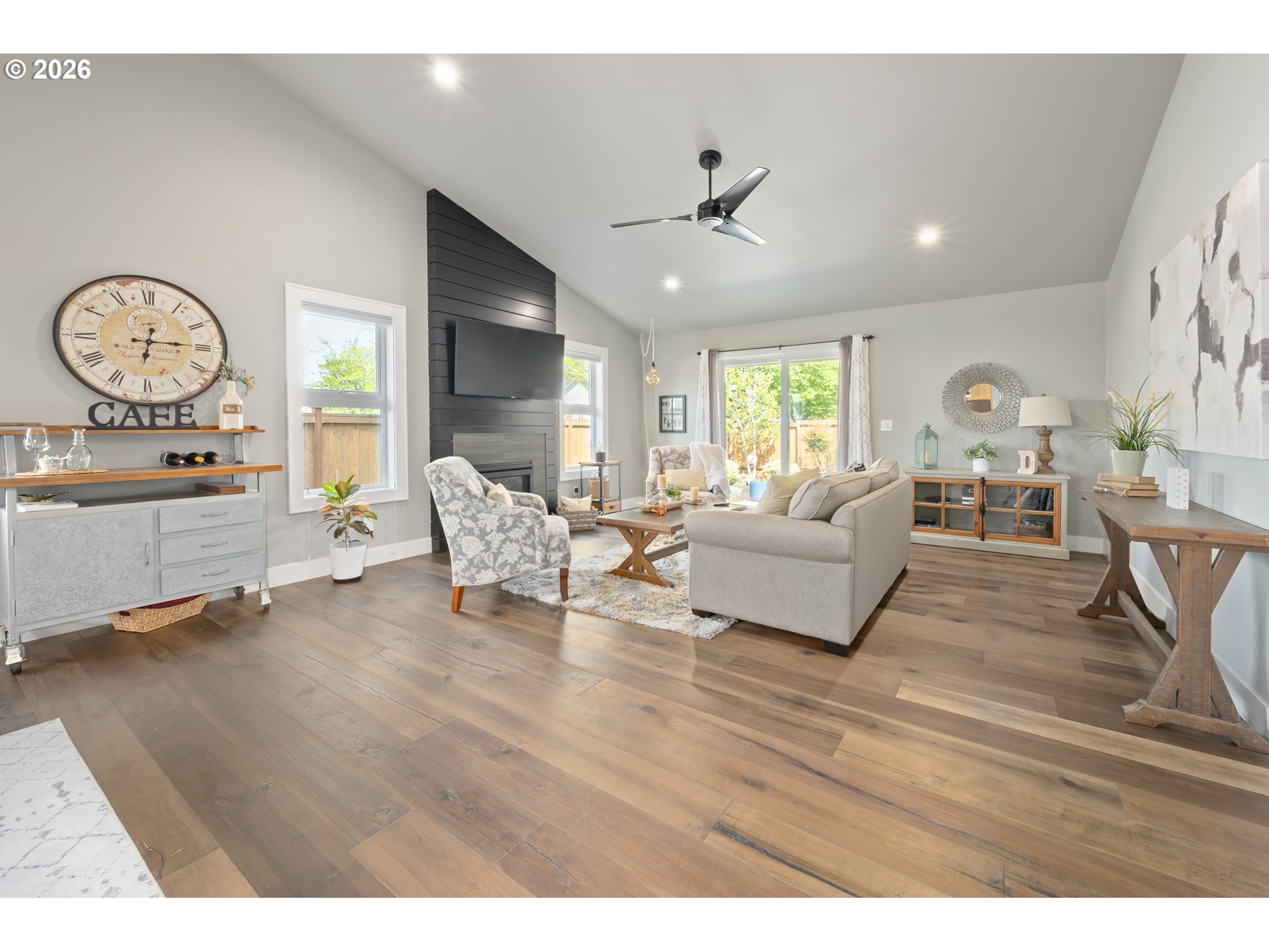 Built by Jordan Iverson Signature Homes, this home sits in a well-established Santa Clara neighborhood that feels grounded and quietly refined rather than newly packed and repetitive. Inside, the finishes are warm and intentional. White oak cabinetry carries throughout, paired with Swedish maple carob engineered hardwood that brings a soft, natural depth underfoot. The kitchen feels both functional and inviting, with black stainless KitchenAid appliances, gas cooking, and an island that naturally becomes the place people gather, whether for a quick breakfast or simple gathering. The main living space opens upward with vaulted ceilings, but still holds onto a sense of comfort. A gas fireplace wrapped in black shiplap anchors the room, adding contrast and a bit of edge without overpowering the space. It all flows easily to the partially covered patio, already set up with a gas hookup, making it just as usable on a cool wet evening as it is in the middle of summer. The primary suite is positioned on the main level and feels quietly tucked away, with direct access to the patio, two walk-in closets, and a bathroom that’s clean and well executed with tile floors, a tiled shower, and a quartz double vanity; quality materials done right. Upstairs, the bonus room offers a generous, flexible space that adapts easily whether it becomes a media room, office, or something in between. The oversized garage adds another layer of practicality, giving you extra space for storage. Set on a corner lot, the outdoor space has been thoughtfully designed with low-maintenance landscaping that still feels lush and complete. Turf, established plantings, and intentional layout make it easy to enjoy without constant upkeep. With gas hot water, a Trane gas heating system, and a heat pump, the home is as comfortable behind the walls as it feels inside them. It has been lightly lived in and lovingly maintained, and that sense of ease comes through the moment you step foot inside.