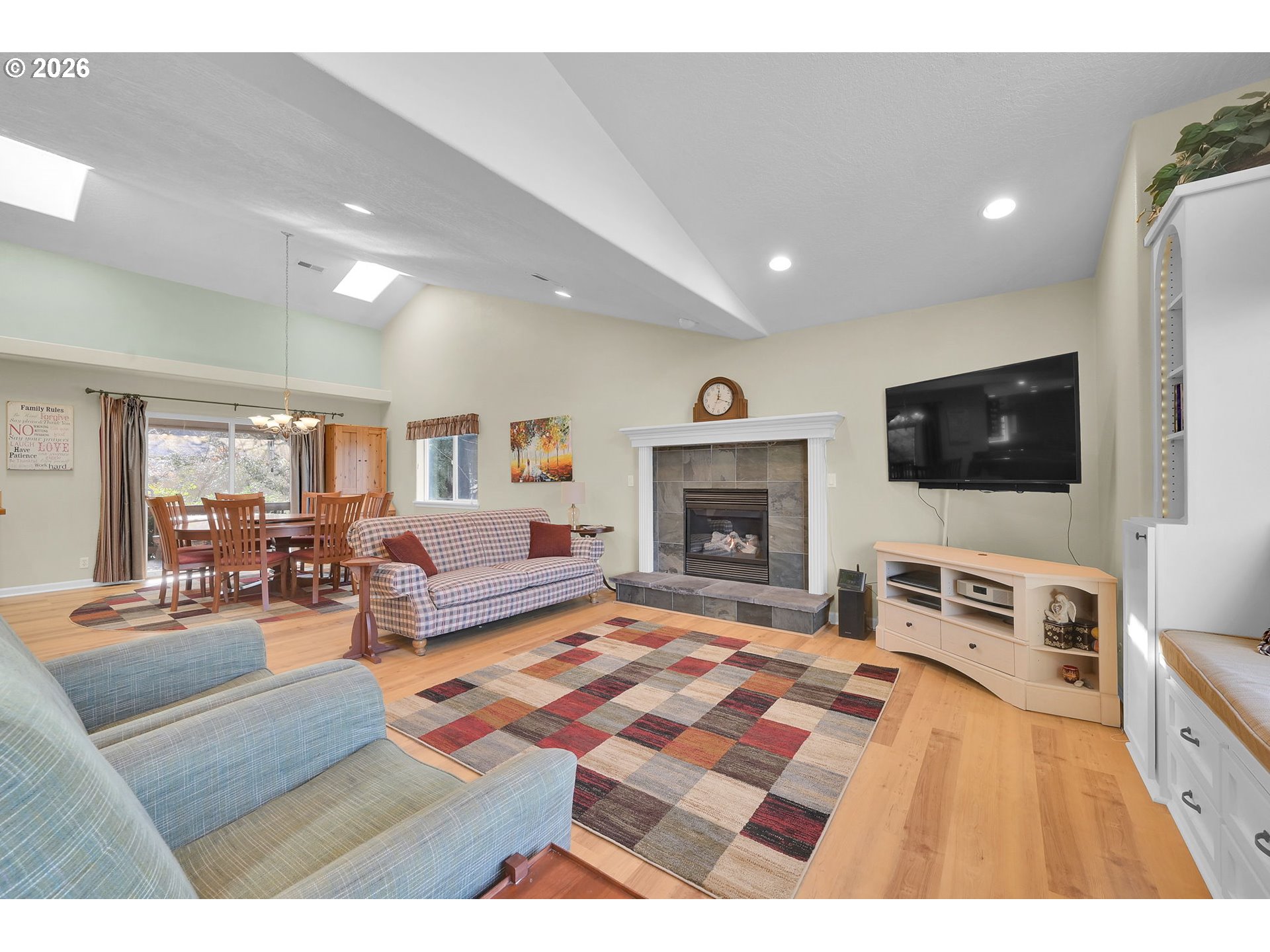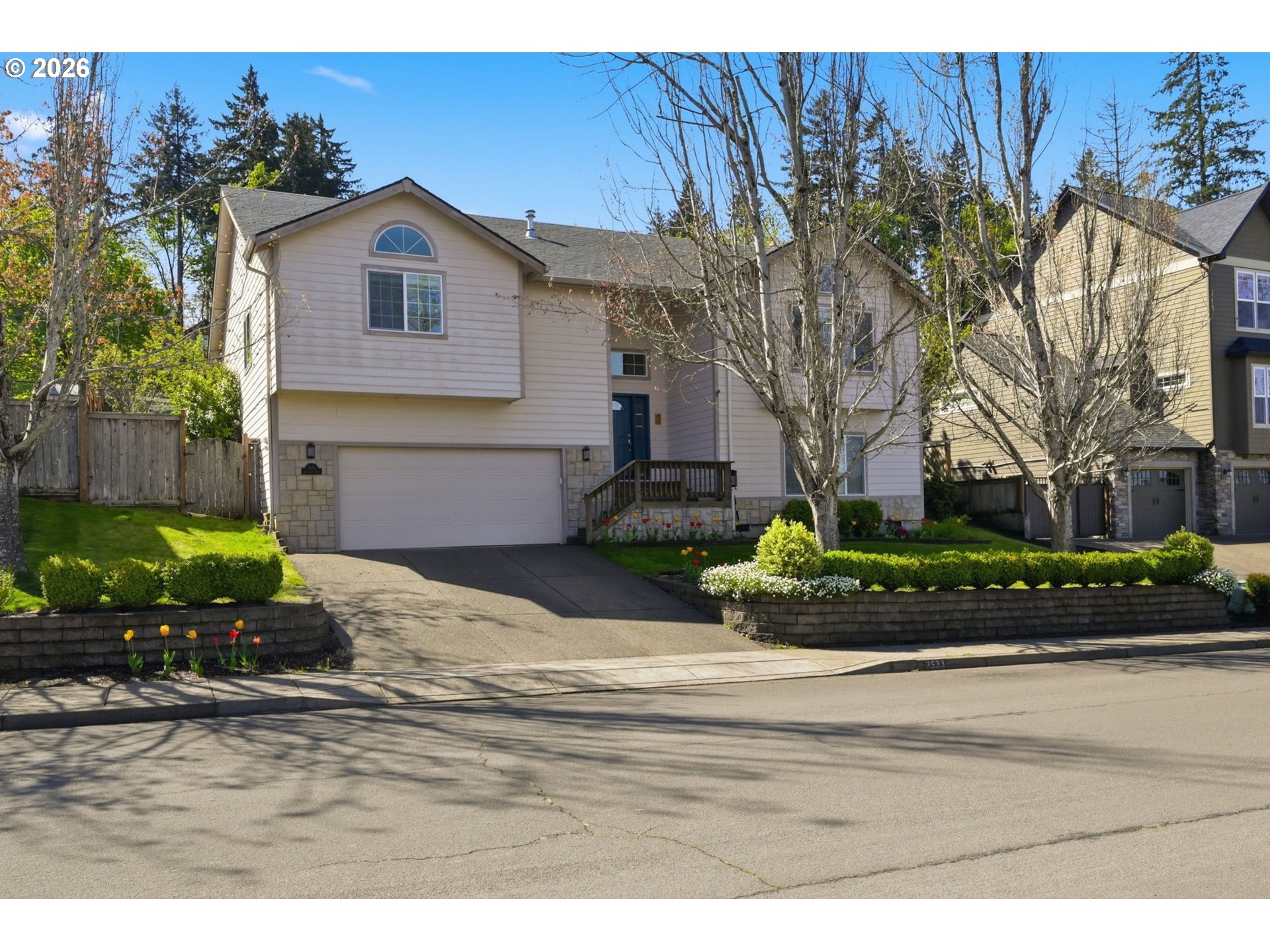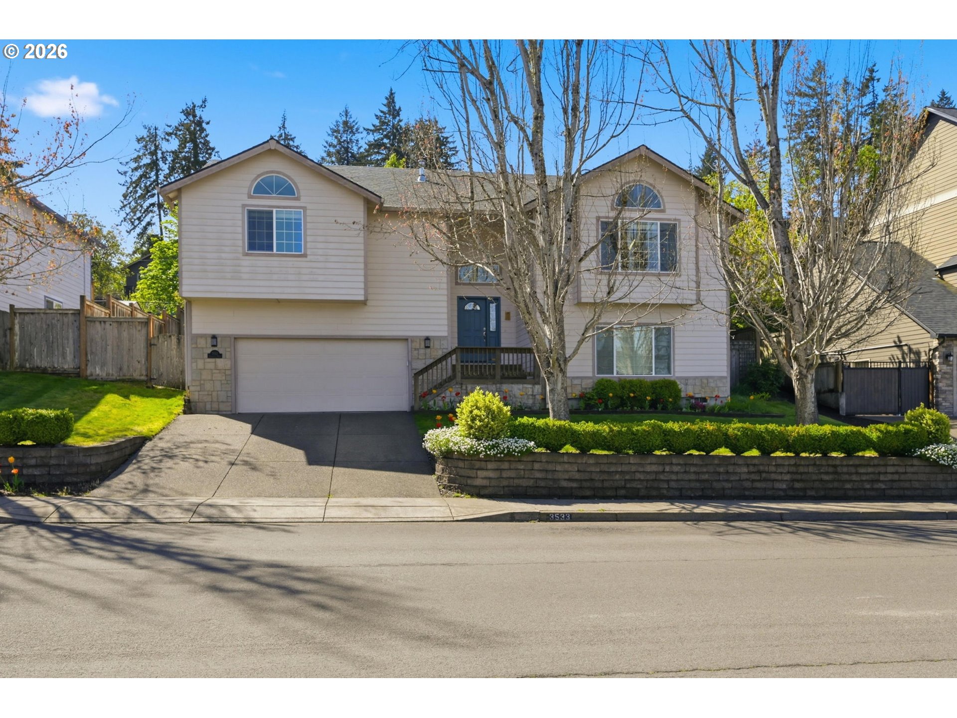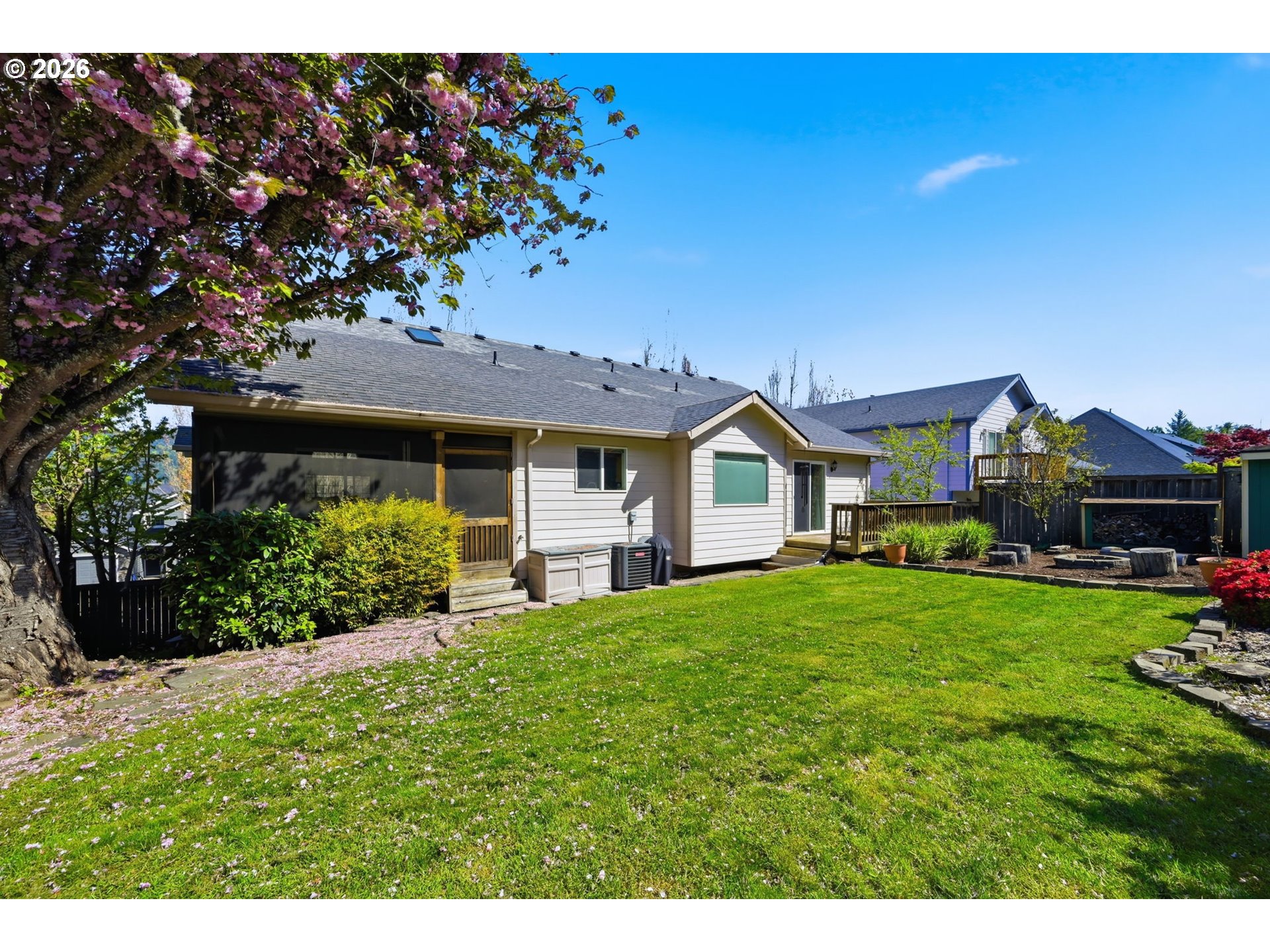 Beautifully maintained 4-bedroom, 3-bath home offering 2,724 sq ft of open, light-filled living. Vaulted ceilings and fans throughout enhance the spacious feel. Dream kitchen features breakfast bar, walk-in pantry, new dishwasher, and dining area with patio access. Living room offers inviting views and fireplace. Luxurious primary suite includes jetted tub. Enjoy a screened-in porch overlooking a private terraced yard with Cherry, Peach and nectarine trees, strawberries, marionberries and Raspberries. Lower level provides family room or office and fourth bedroom. HVAC installed 3 years ago. Oversized two-car garage.