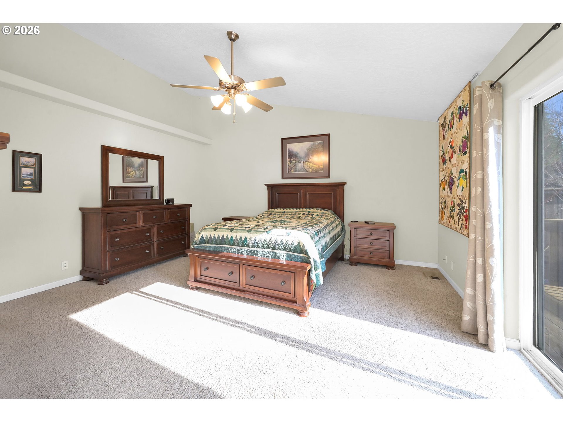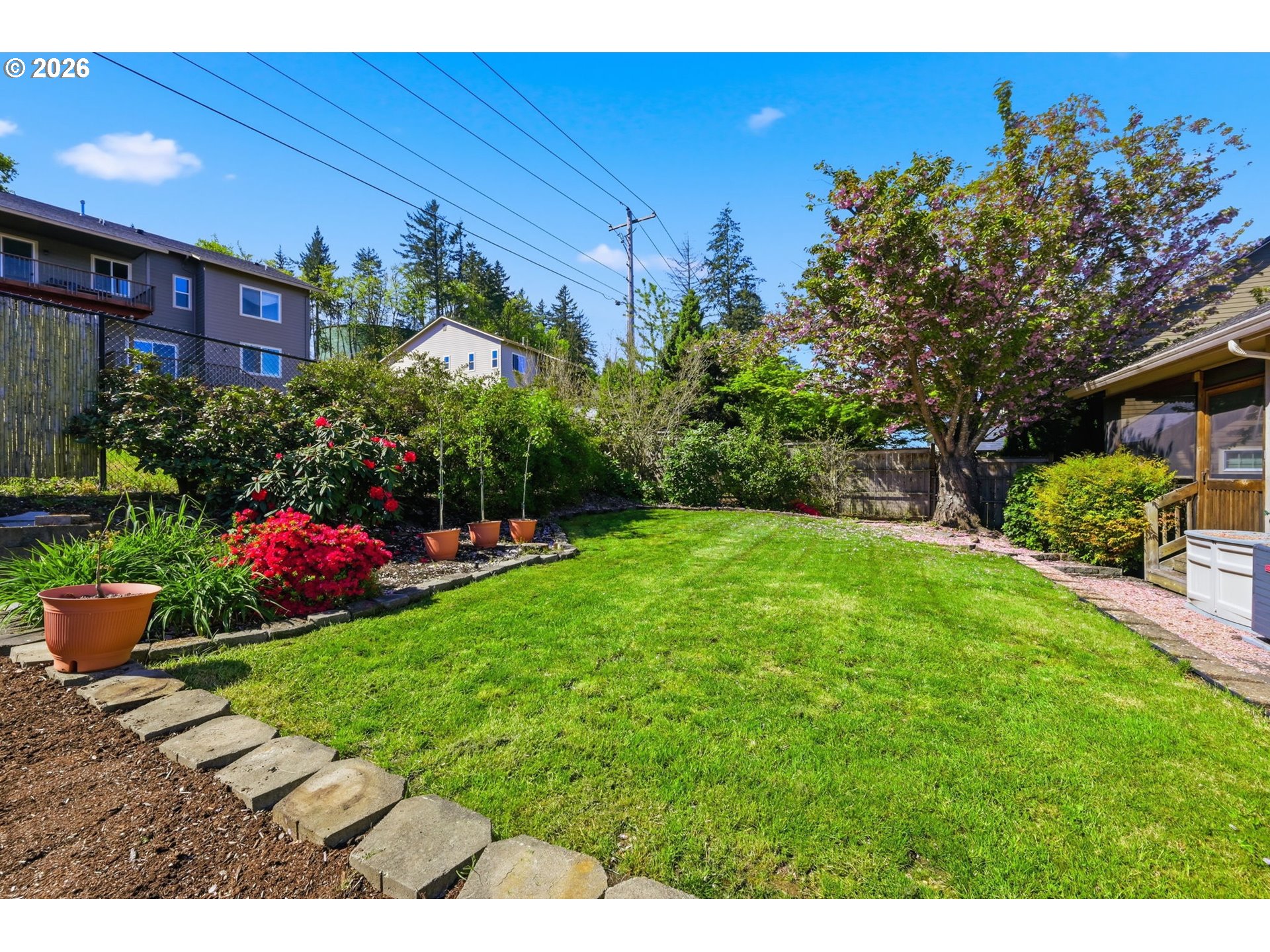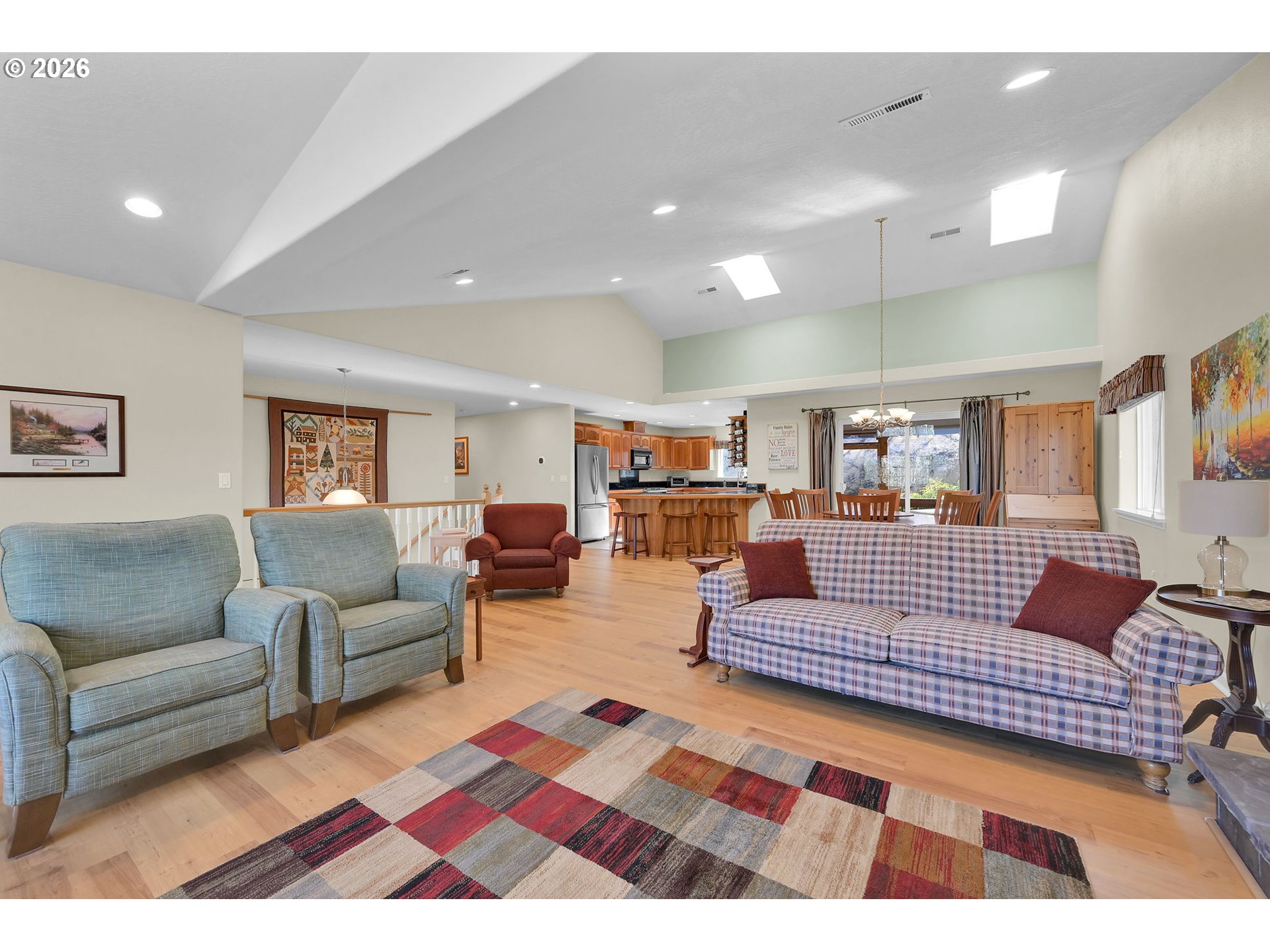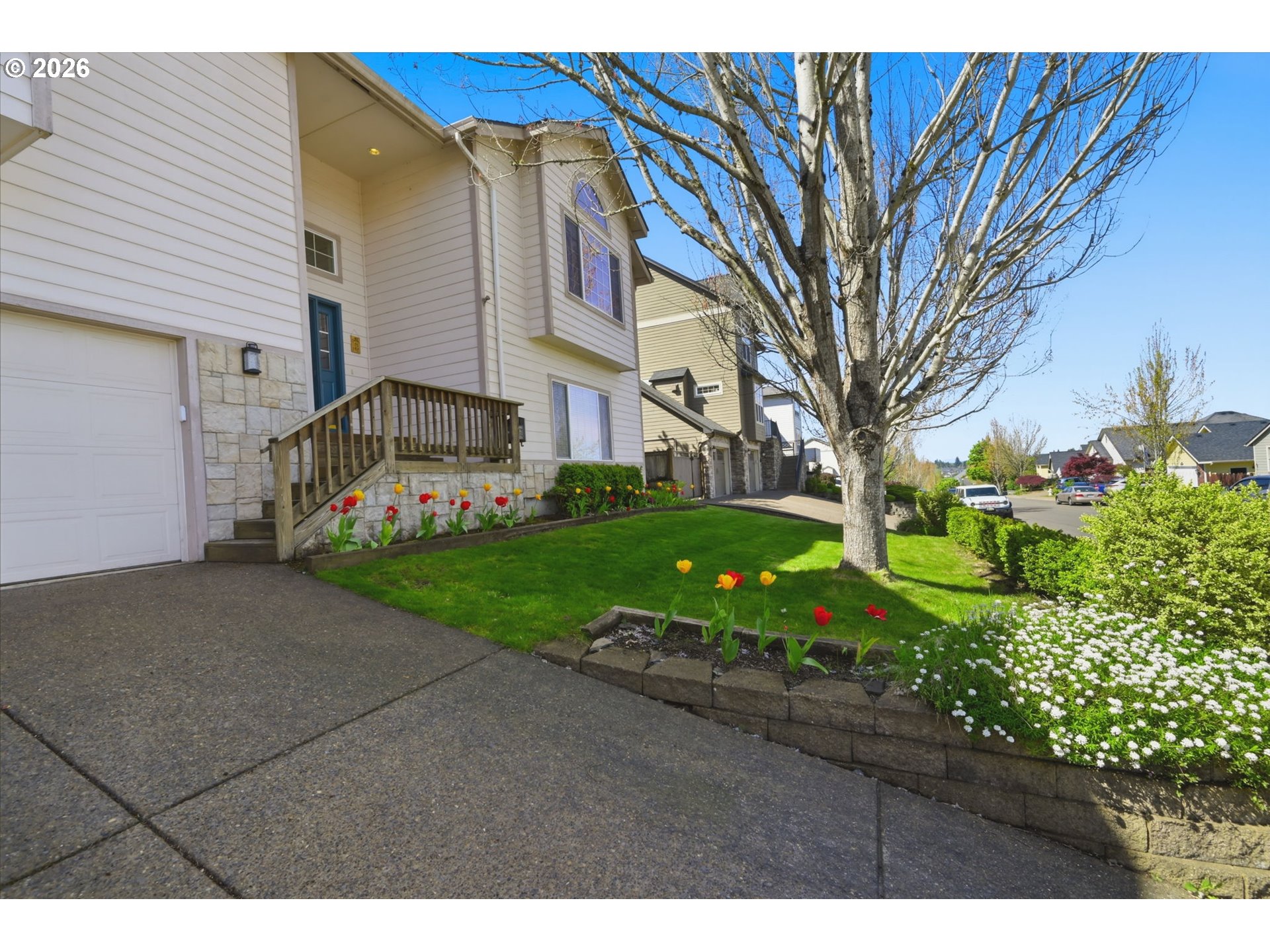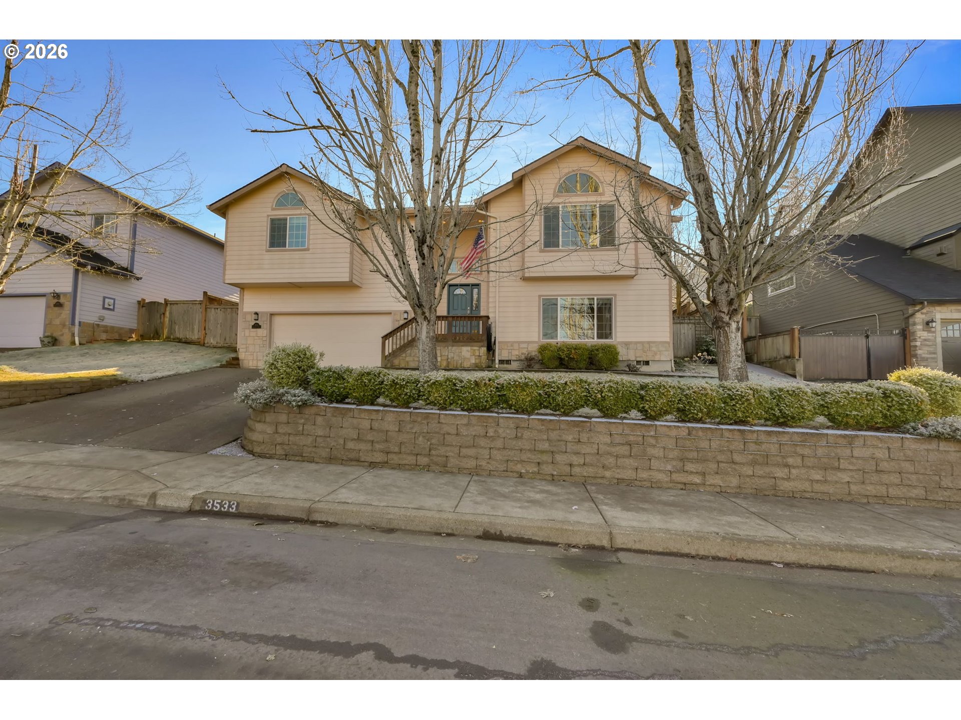 Beautifully maintained 4-bedroom, 3-bath home offering 2,724 sq ft of open, light-filled living. Vaulted ceilings and fans throughout enhance the spacious feel. Dream kitchen features breakfast bar, walk-in pantry, new dishwasher, and dining area with patio access. Living room offers inviting views and fireplace. Luxurious primary suite includes jetted tub. Enjoy a screened-in porch overlooking a private terraced yard with Cherry, Peach and nectarine trees, strawberries, marionberries and Raspberries. Lower level provides family room or office and fourth bedroom. HVAC installed 3 years ago. Oversized two-car garage.