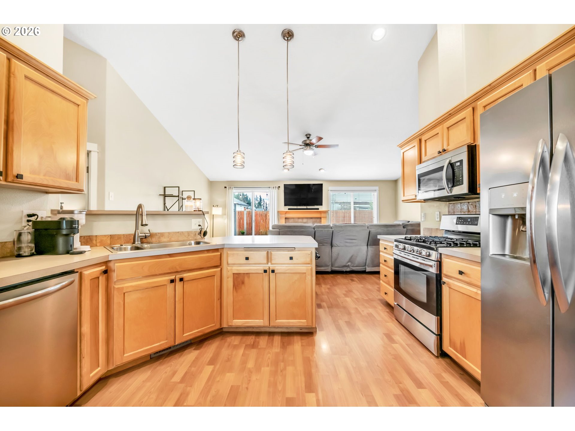This is a well-crafted single-level home built by Quality Sierra Homes and located in a quiet neighborhood. This 3-bedroom, 2-bath home offers an ideal open great room floor plan with vaulted ceilings that create a bright and spacious feel. The living room features a cozy gas fireplace and flows seamlessly into the kitchen, which is equipped with stainless steel appliances, a gas cook stove, and ample cabinet space for everyday functionality. The spacious primary suite provides comfort and privacy, while the efficient gas forced-air heating and cooling system ensures year-round comfort. A low-maintenance, fully fenced backyard, Extra-long RV parking provides ample room for an RV, boat, trailer, or additional vehicles. Conveniently located with easy access to local amenities, this move-in ready home offers comfort, practicality, and a peaceful setting.