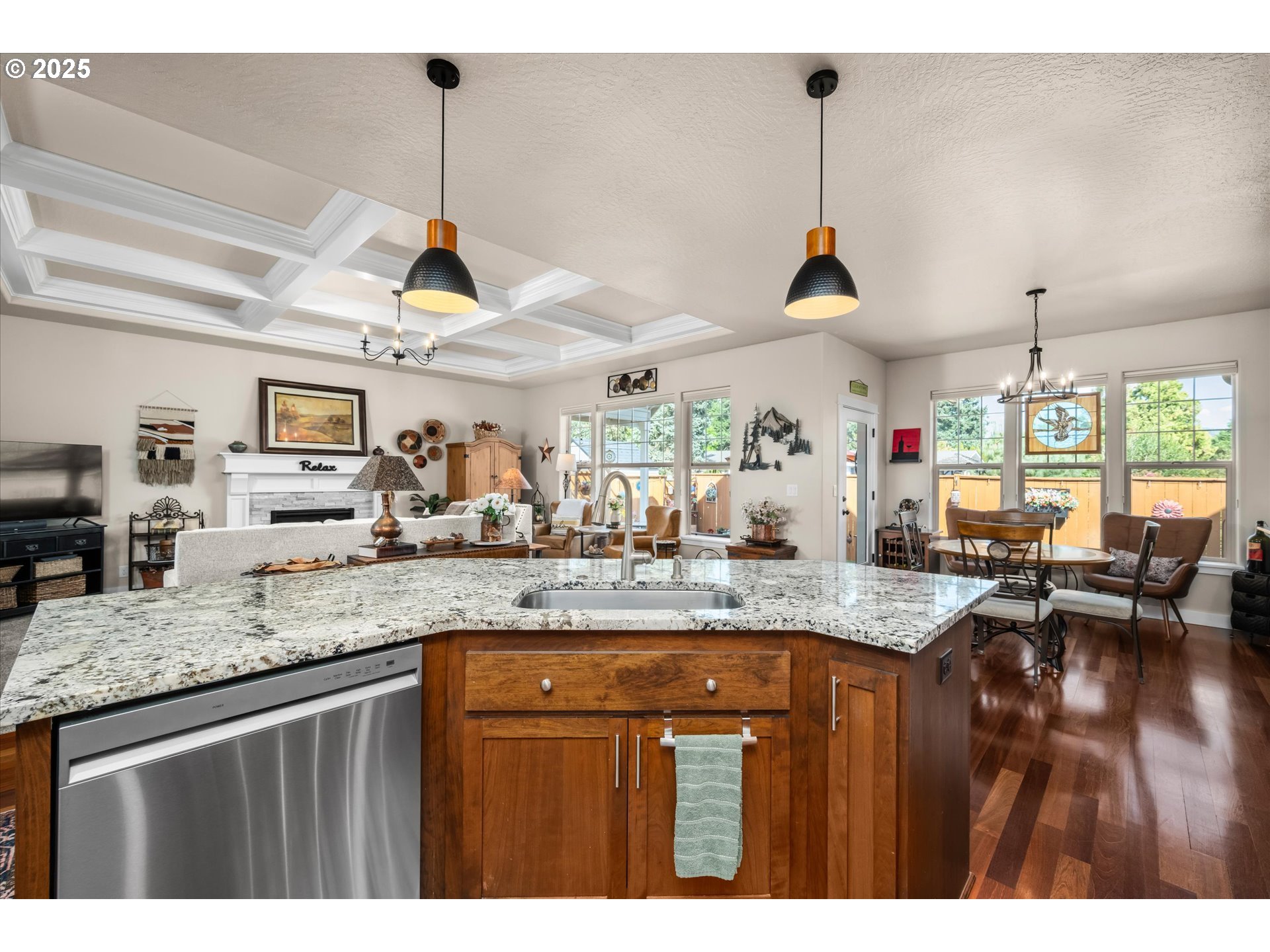 Welcome to this beautifully maintained single level home offering comfort, convenience, and thoughtful upgrades throughout. Step inside to a bright, open floor plan featuring a spacious living room with coffered ceilings and a cozy gas fireplace—perfect for relaxing or entertaining. The gourmet kitchen is a showstopper with granite countertops, rich wood cabinetry, stainless steel appliances, and a large island that flows seamlessly into the dining and living areas. Enjoy the privacy of a fully fenced backyard designed for low maintenance living with astroturf lawn, covered patio, and charming garden touches—ideal for year-round enjoyment. Additional features include RV parking on the side yard, updated finishes throughout, and a generous 2-car garage. Located in a desirable neighborhood, this single-level gem offers both style and functionality. Don’t miss your chance to make it yours!