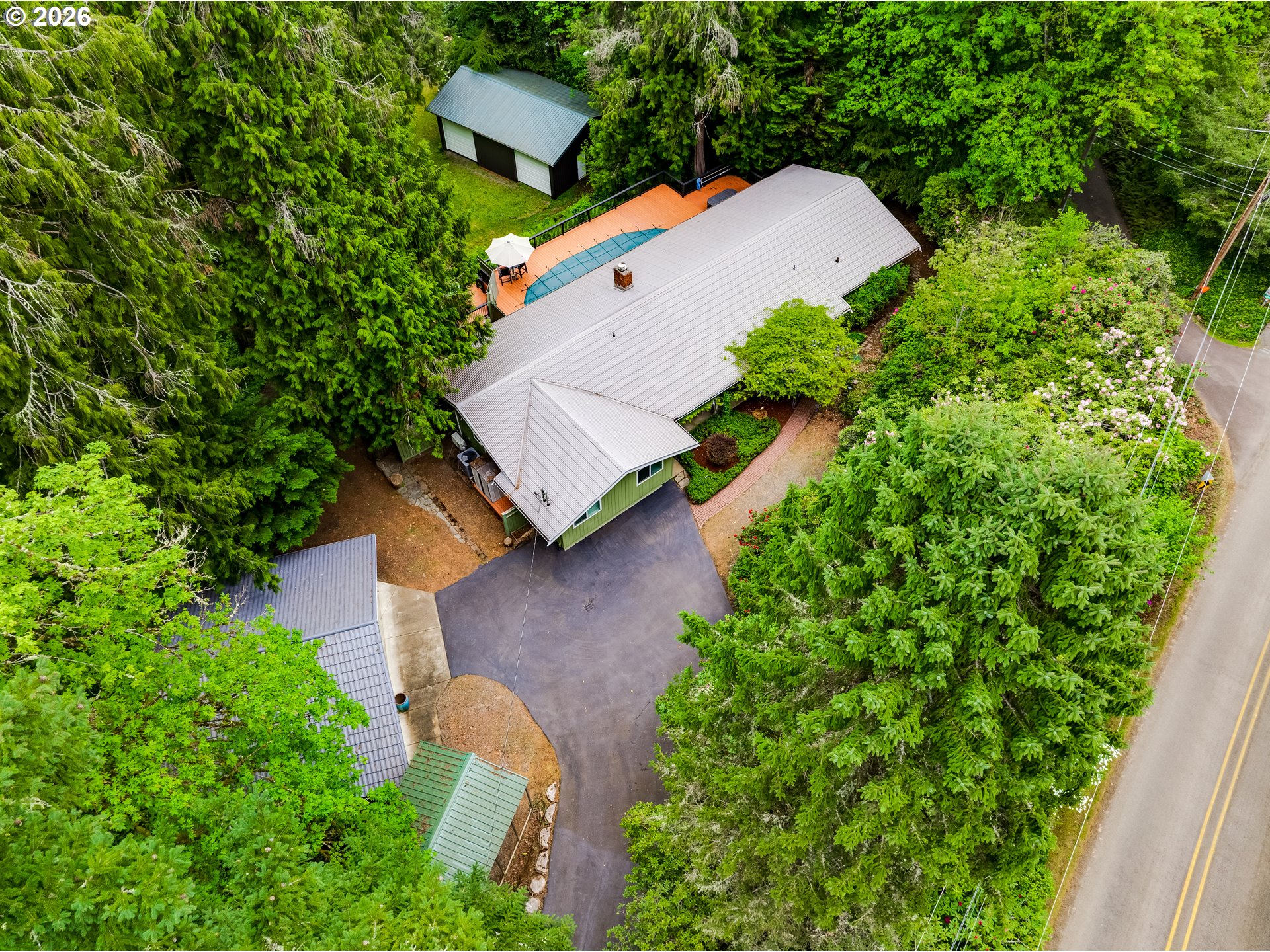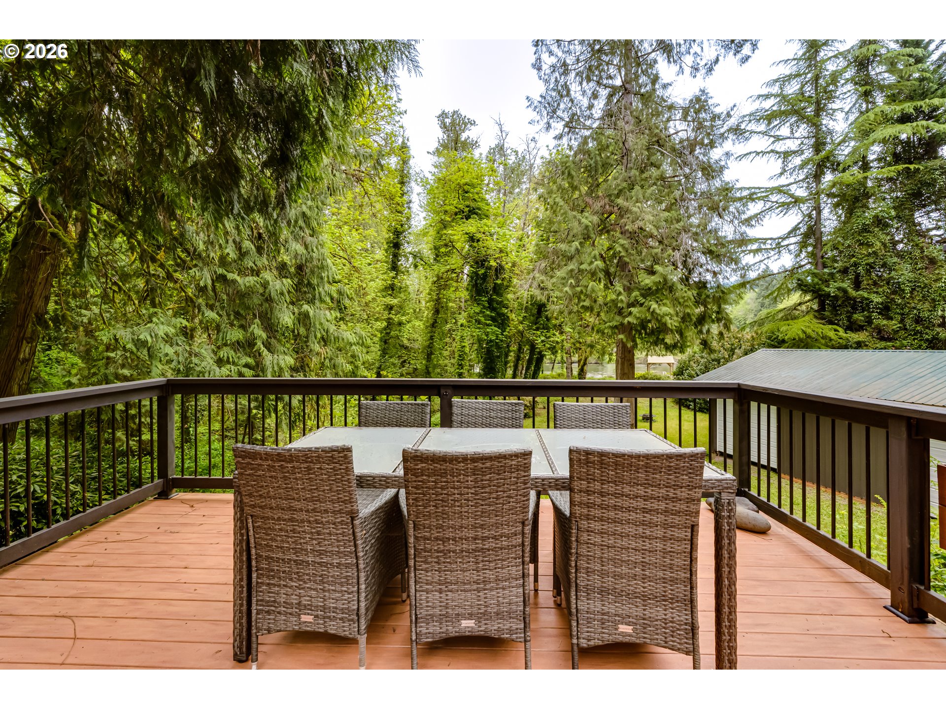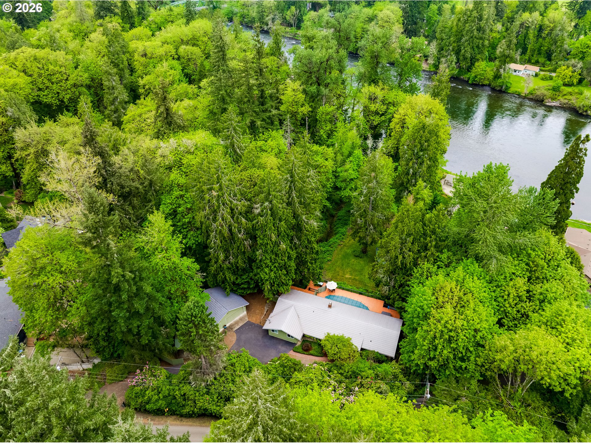 Set along the scenic McKenzie River and backing to a park, this property offers a peaceful setting just minutes from town. Enjoy beautiful river views from the living room, while the expansive deck with pool and hot tub creates the perfect space for relaxing or entertaining. The lower portion of the property provides additional outdoor space with potential for a fire pit or gathering area. The home is currently configured as a two-bedroom with an attached separate living unit, offering flexible living options, with potential to reconfigure to a three-bedroom layout in the main home. The attached unit, with its own entrance and full bathroom, adds versatility for guests or extended living. Additional features include a detached garage with shop space and a large enclosed pole barn with oversized doors, ideal for storage, hobbies, or recreational vehicles. Deerhorn park and boat ramp is literally just around the corner which includes a sport court for pickleball.