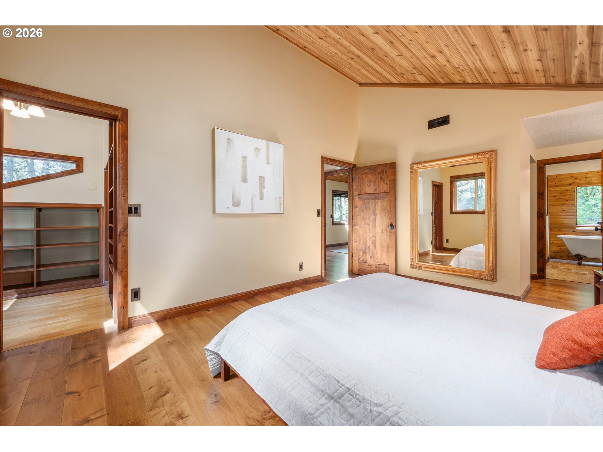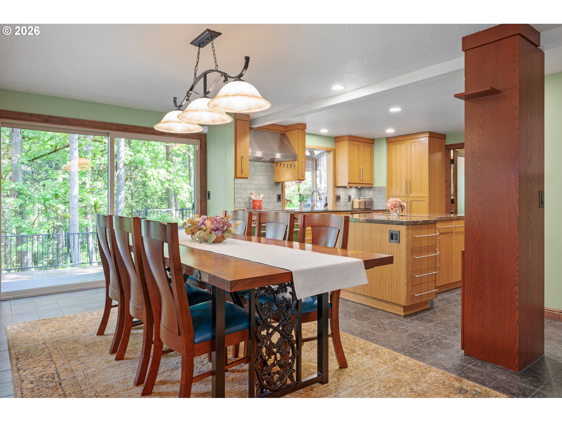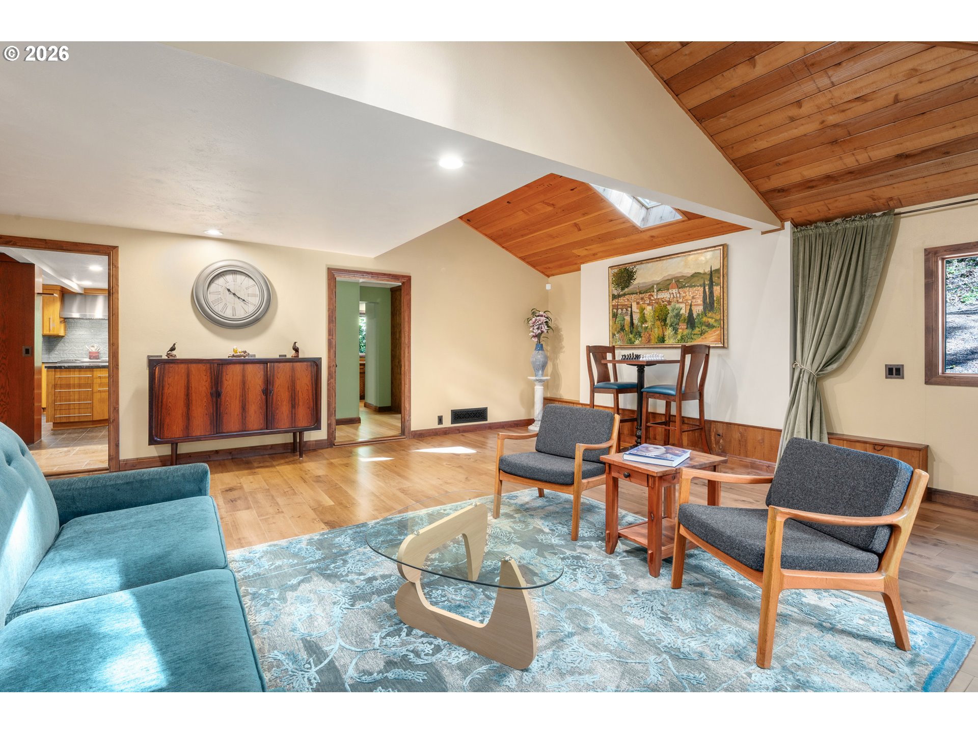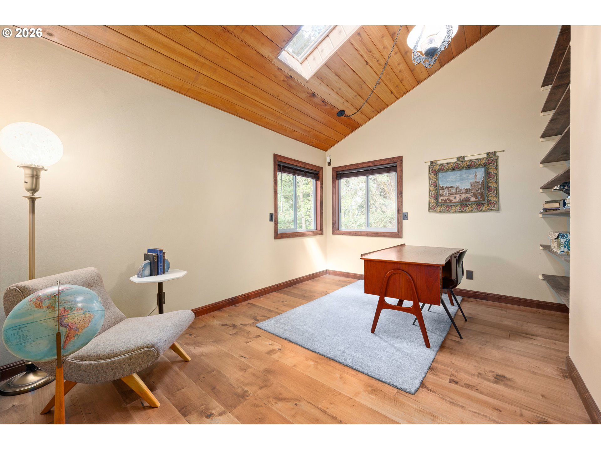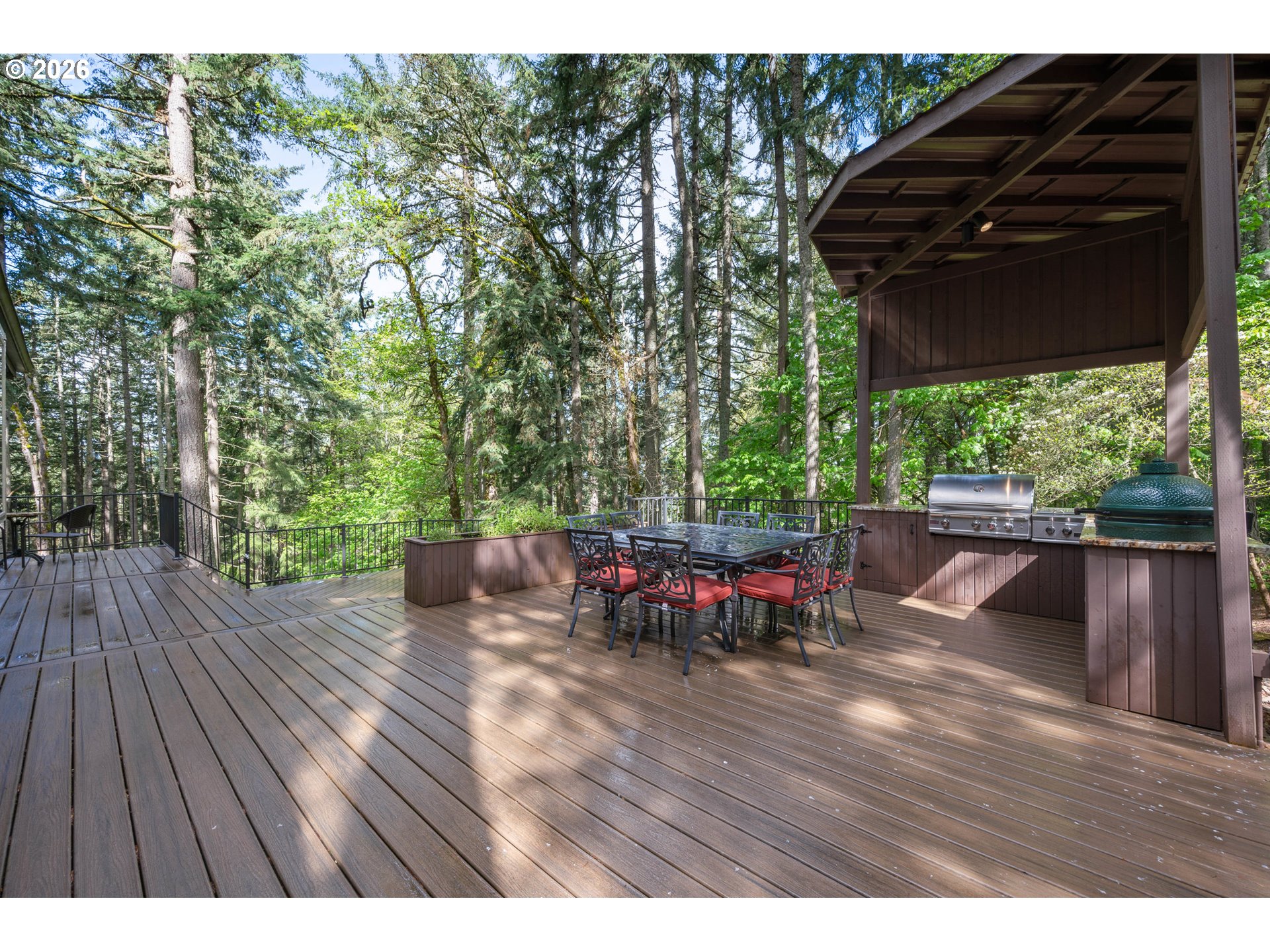 Set on a wooded acre off of Spring Blvd in southeast Eugene, this property immerses you in private wooded setting, and then surprises and delights with luxurious finishes and obvious care throughout every space. The entry sets the tone with Italian Luna travertine and wood-clad vaulted ceilings, opening naturally into the main living spaces, which is anchored by a Napoleon wood stove for heat, and a wood burning fireplace for ambiance. The kitchen balances function and presence with imported Italian porcelain tile, a commercial-grade BlueStar gas range, custom bamboo cabinetry, granite counters, and a large island. The primary suite is generous in scale, with double walk-in closets and vaulted wood ceilings adding warmth without excess. In addition it has a primary bathroom that reads more like a personal spa. An oversized travertine shower with marine varnished cedar ceiling and a cast iron clawfoot tub create a beautiful contrast in texture and tone. Solid travertine counters, paneled accent wall and double copper sinks continue that layered, high end material approach. Throughout the home: maple engineered hardwoods from South America, hand-stained knotty alder doors and trim, updated outlets and dimmers with polished brass covers, and fresh interior paint. Outdoor living is equally considered with expansive Trex decking with a designer metal railing and a covered outdoor kitchen featuring granite counters, a Blaze Professional natural gas BBQ and a built in Green Egg. A finished bonus room above the garage with its own ductless heat pump, new carpet, and built-in desk adds flexibility for work, guests, or separation of space when needed. Major updates include roof (2023), tankless water heater and HVAC (2021), vinyl windows (2021), exterior paint (2020), and new fencing (2025). Don't miss this property where setting, materials, and updates come together in a way that feels intentional and lasting.