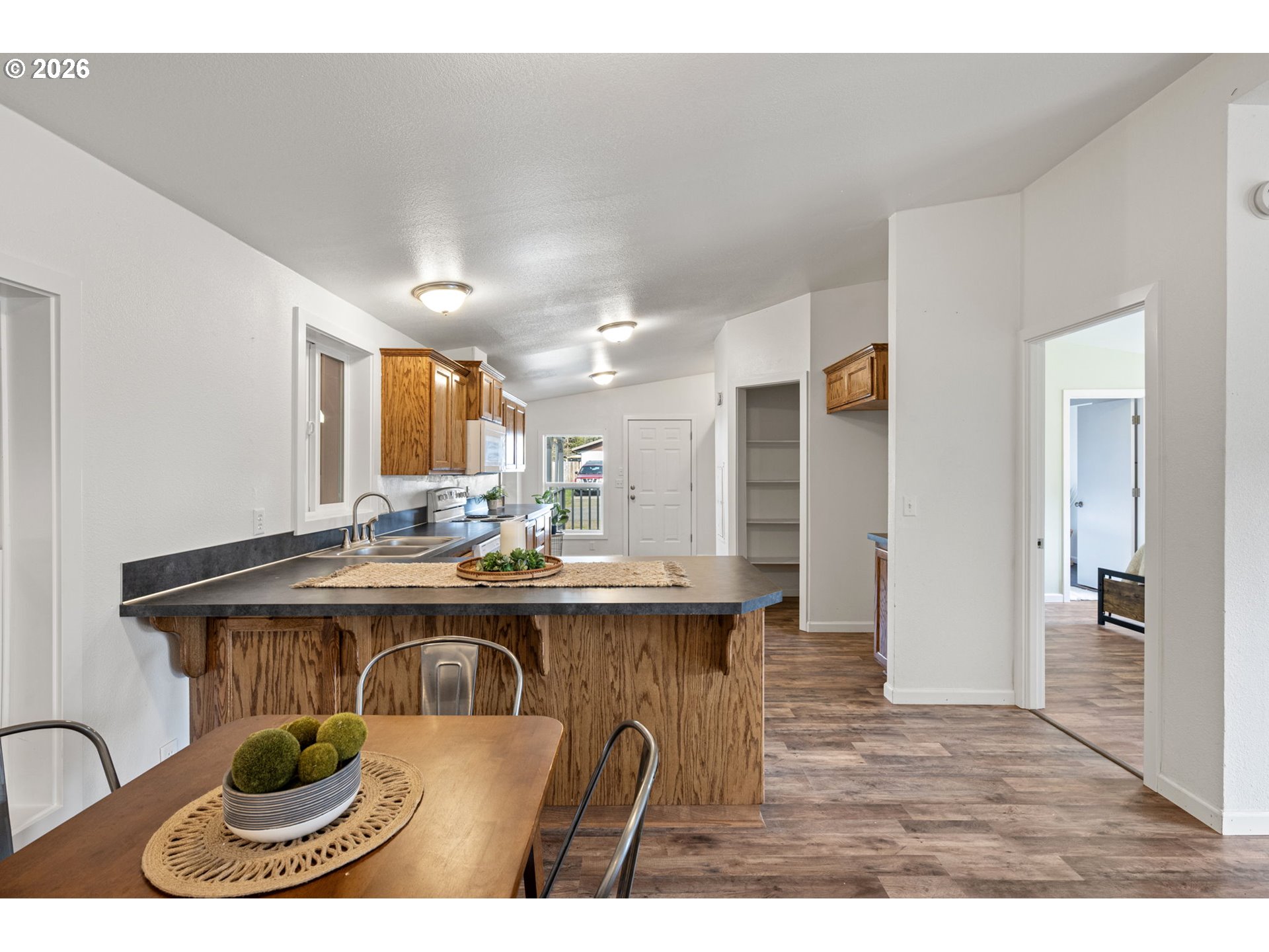 Move-in ready and updated, this 3-bedroom, 2-bath home sits on a spacious .22-acre corner lot in the heart of Oakridge’s outdoor paradise. Vaulted ceilings and a great-room layout create an open, light-filled living area that flows into the kitchen, featuring an eat bar, pantry, and generous counter space.The large primary suite offers a private bathroom and walk-in closet. Seperation of space between the primary suite and two additional rooms. Indoor laundry. Recent improvements — including newer windows, roof, LVP flooring, and fresh interior and exterior paint — provide peace of mind for years to come.An enclosed 18x47 attached shop with 220 electrical offers incredible flexibility and could easily be converted into a garage or hobby space. Possiblities for additional side parking or gated backyard access.Unwind on the covered patio with surrounding mountain valley views, all just blocks from the Willamette River and Osprey Park.