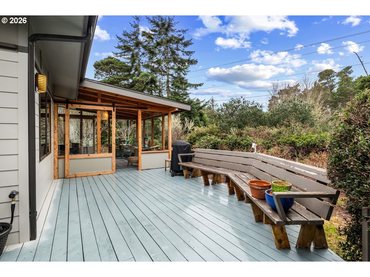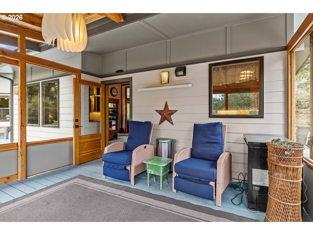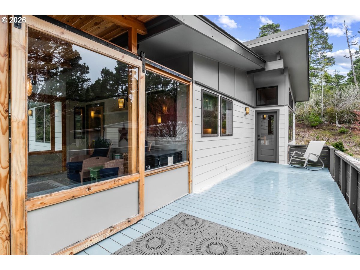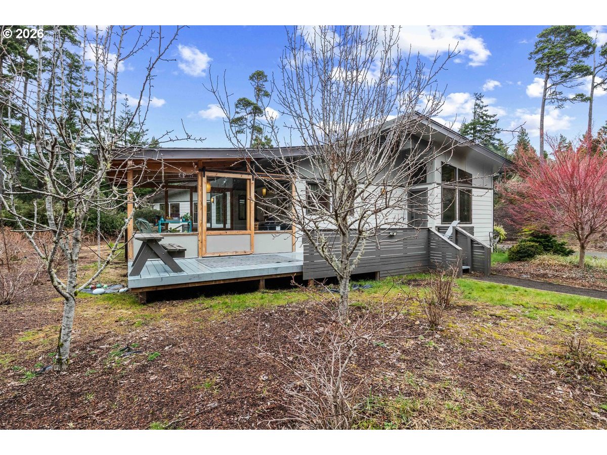 Charming coastal property on .93 acres. Custom built home features a 1 bed, 1 bath layout (896 sq ft) plus (480 sq ft) detached studio, home and studio both feature wood framed windows for views from every room, large wrap around deck and sunroom for enjoying the view at any time of the year. Both buildings were professionally repainted last summer with premium coastal-grade paint, including extensive prep work and new metal fascia on sun-exposed areas for added durability. The septic system (1500-gallon tank rated for 4 bedrooms) is on a Lane County service contract. Kitchen appliances include retro propane stove/range, refrigerator, dishwasher, washer and dryer (all included); dishwasher and disposal recently replaced and stove/fridge recently serviced. Property features full RV hookups (water, sewer & 50-amp power), new gravel walkways, heated river rock bathroom floor, bidet, and updated lighting with ceiling fan. Beautifully landscaped grounds include 12+ blueberry bushes, 3 pear trees, irrigation system, and greenhouse water hookup. Additional 12'x10' storage shed behind garage. and only 1 mile to the beach!