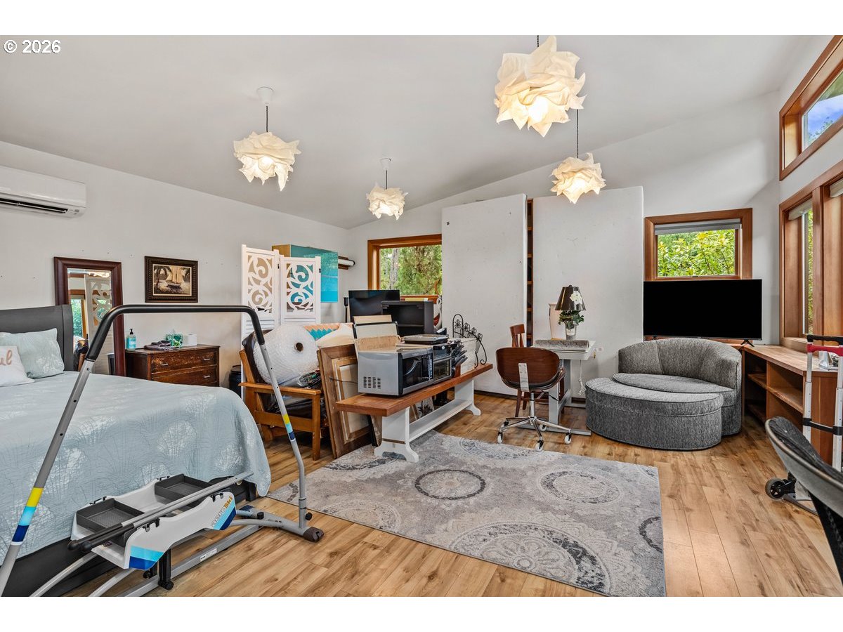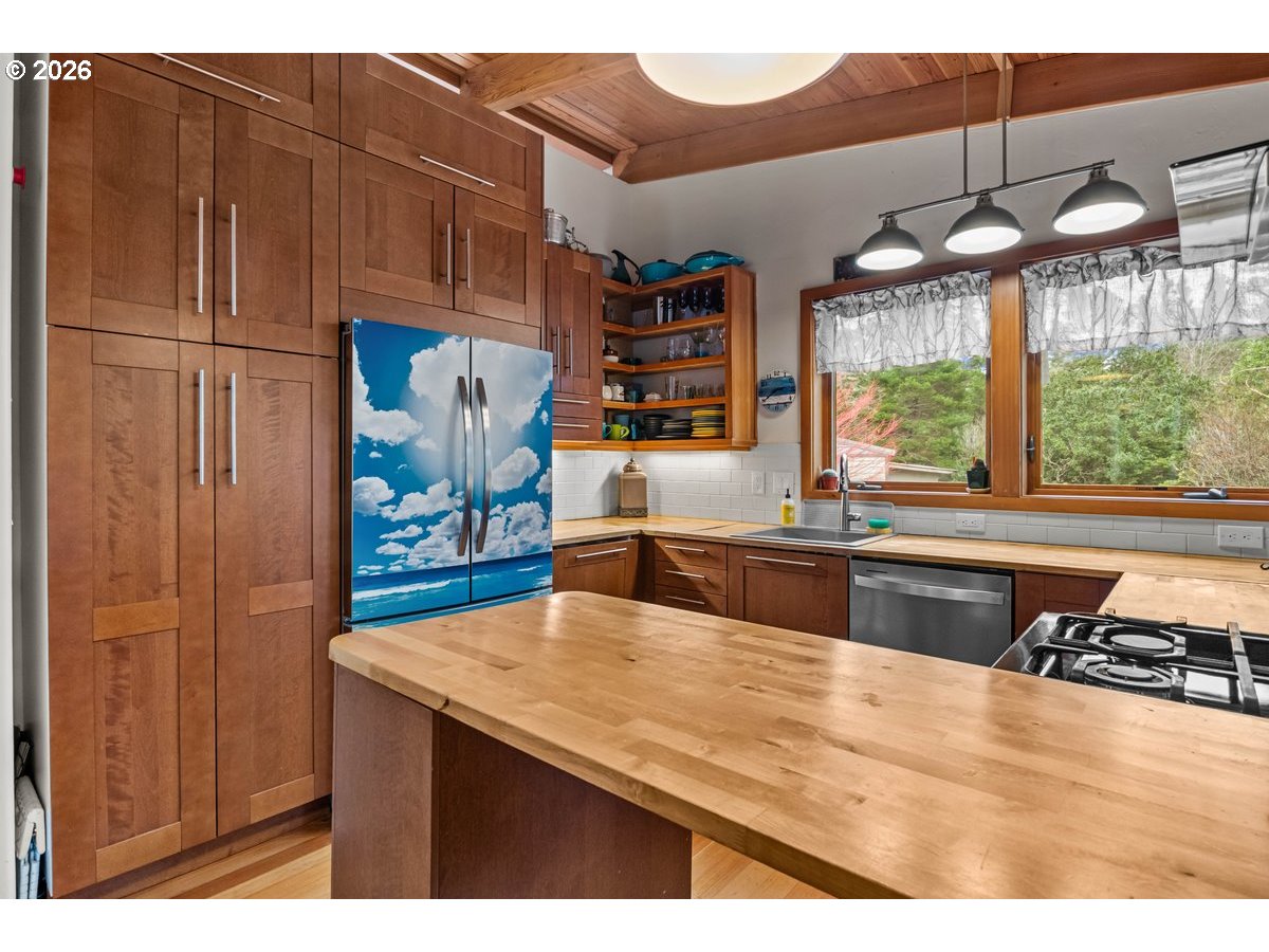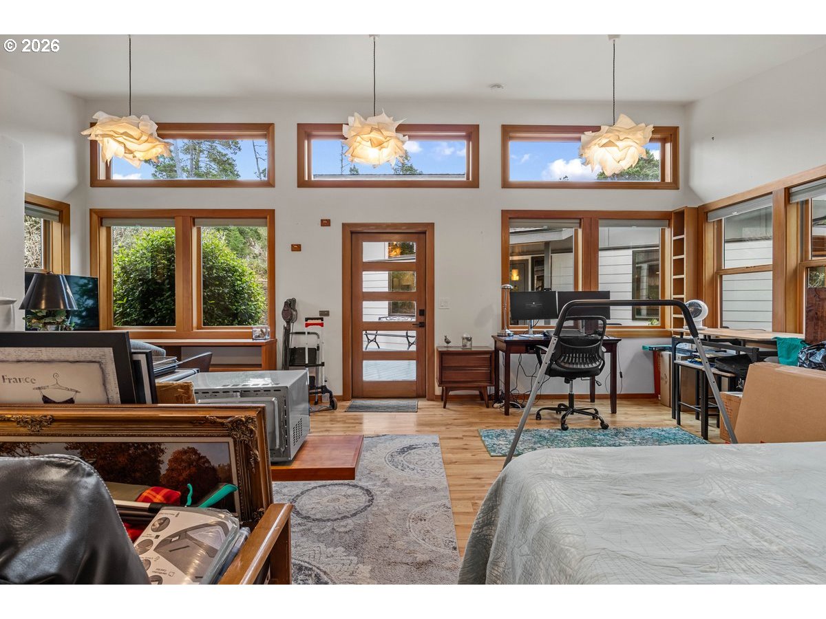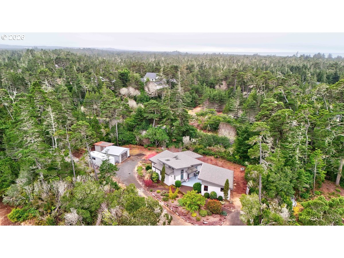 Charming coastal property on .93 acres. Custom built home features a 1 bed, 1 bath layout (896 sq ft) plus (480 sq ft) detached studio, home and studio both feature wood framed windows for views from every room, large wrap around deck and sunroom for enjoying the view at any time of the year. Both buildings were professionally repainted last summer with premium coastal-grade paint, including extensive prep work and new metal fascia on sun-exposed areas for added durability. The septic system (1500-gallon tank rated for 4 bedrooms) is on a Lane County service contract. Kitchen appliances include retro propane stove/range, refrigerator, dishwasher, washer and dryer (all included); dishwasher and disposal recently replaced and stove/fridge recently serviced. Property features full RV hookups (water, sewer & 50-amp power), new gravel walkways, heated river rock bathroom floor, bidet, and updated lighting with ceiling fan. Beautifully landscaped grounds include 12+ blueberry bushes, 3 pear trees, irrigation system, and greenhouse water hookup. Additional 12'x10' storage shed behind garage. and only 1 mile to the beach!