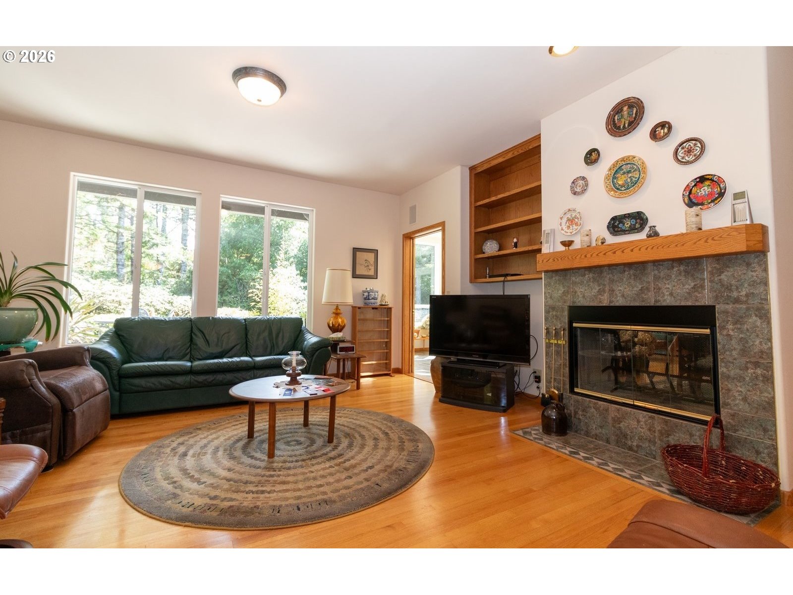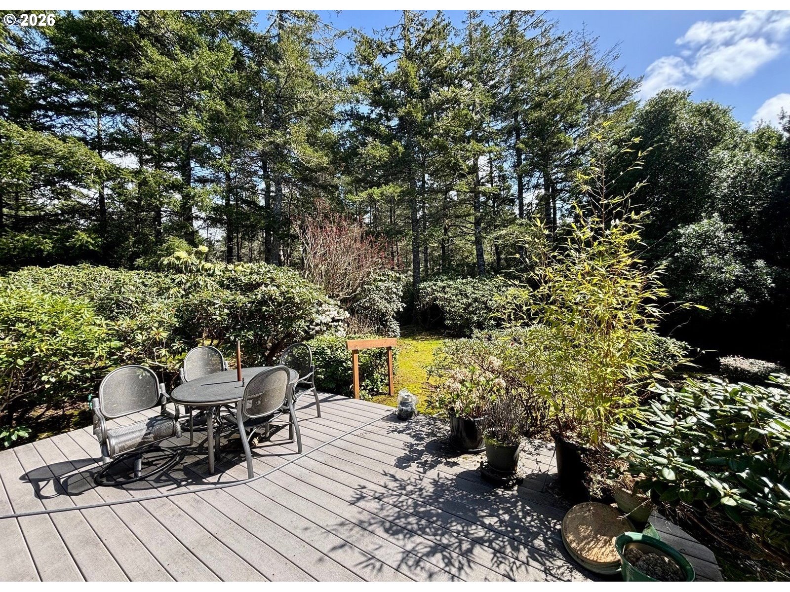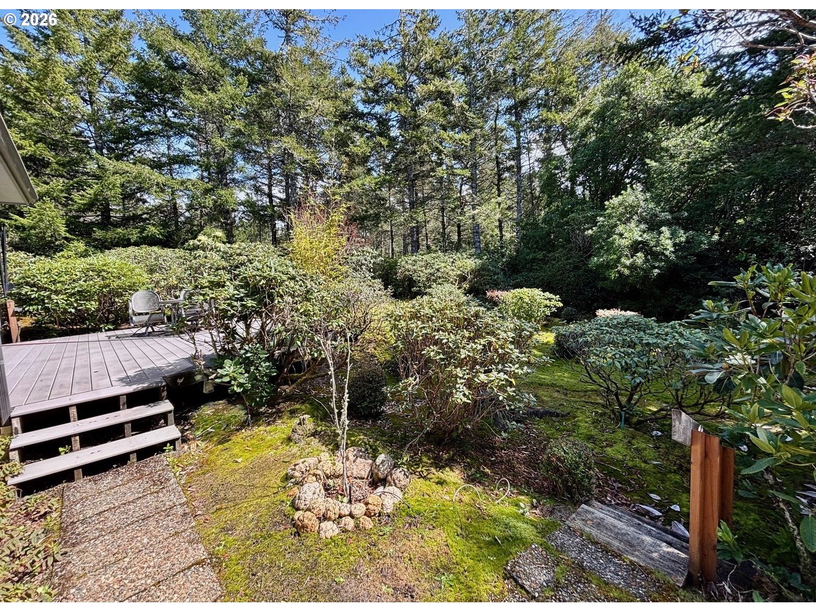 Nestled at the end of a quiet cul-de-sac in desirable Heceta South, this 2,787 sq. ft. custom home offers unmatchedprivacy and charm on two lots totaling one full acre. The beautifully landscaped backyard is a true sanctuary, featuring over 110 unique rhododendrons, mature plantings, drip irrigation, and peaceful rear decks perfect for relaxing or entertaining. Inside, you’ll and real hardwood floors, high ceilings, and a see-through replace adding warmth and character. The chef's kitchen boasts solid surface countertops, hickory cabinets and a skylight. There is a sunlit solarium for year-round enjoyment. A separate office with built-in bookshelves, shoji pocket doors, and a custom movable desk creates the perfect work-from-home space. The attached guest quarters feature soaring 10-foot ceilings, a private bath, and sliding doors leading directly to the lush backyard — ideal for guests, multi-generational living, or a home studio. Additional features include: 3 bedrooms, 3 bathrooms. Tile roof for durability and style. Central vacuum, heat pump, and a full sound system. Skylight for added natural light. solarium for year-round sun enjoyment. Attached 2-car garage. Office with built-ins & custom desk. This home is the perfect blend of function, beauty, and tranquility. Don't miss the chance to own a piece of the Pacific Northwest’s nest living!
