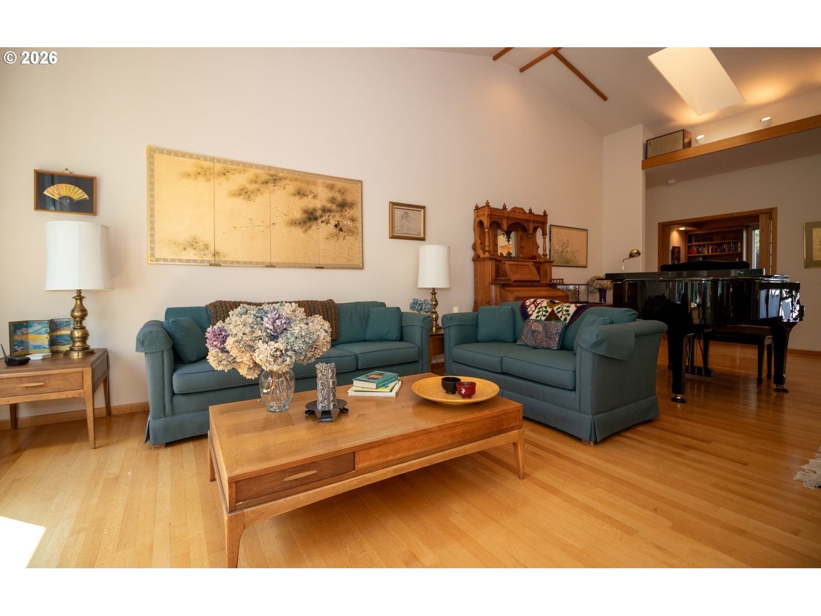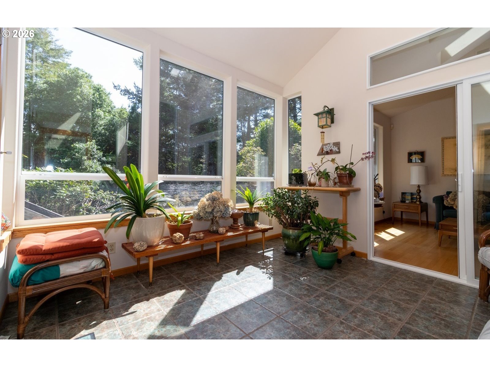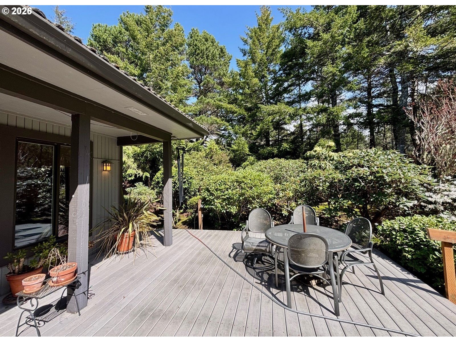 Nestled at the end of a quiet cul-de-sac in desirable Heceta South, this 2,787 sq. ft. custom home offers unmatchedprivacy and charm on two lots totaling one full acre. The beautifully landscaped backyard is a true sanctuary, featuring over 110 unique rhododendrons, mature plantings, drip irrigation, and peaceful rear decks perfect for relaxing or entertaining. Inside, you’ll and real hardwood floors, high ceilings, and a see-through replace adding warmth and character. The chef's kitchen boasts solid surface countertops, hickory cabinets and a skylight. There is a sunlit solarium for year-round enjoyment. A separate office with built-in bookshelves, shoji pocket doors, and a custom movable desk creates the perfect work-from-home space. The attached guest quarters feature soaring 10-foot ceilings, a private bath, and sliding doors leading directly to the lush backyard — ideal for guests, multi-generational living, or a home studio. Additional features include: 3 bedrooms, 3 bathrooms. Tile roof for durability and style. Central vacuum, heat pump, and a full sound system. Skylight for added natural light. solarium for year-round sun enjoyment. Attached 2-car garage. Office with built-ins & custom desk. This home is the perfect blend of function, beauty, and tranquility. Don't miss the chance to own a piece of the Pacific Northwest’s nest living!