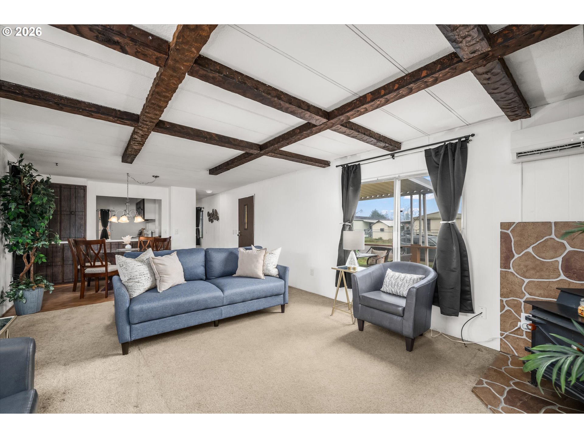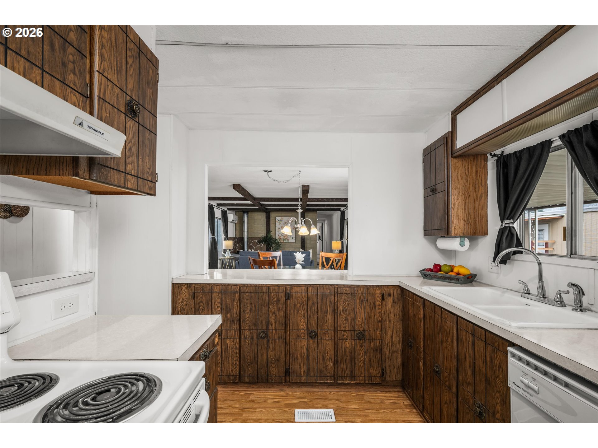 Solid 2 bedroom, 1 bathroom home with a large fenced yard in Thurston. Home features high ceilings with timber beams, a fireplace, a large living room with a proper dining room. All kitchen appliances stay with the home. This is an all-ages park. Space rent is $970 per month.