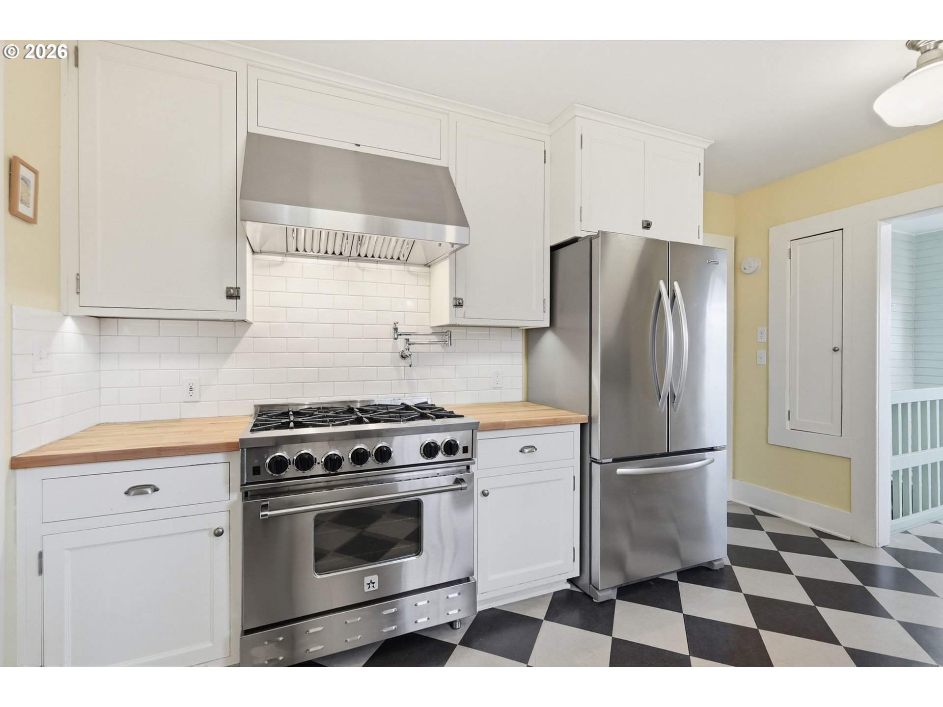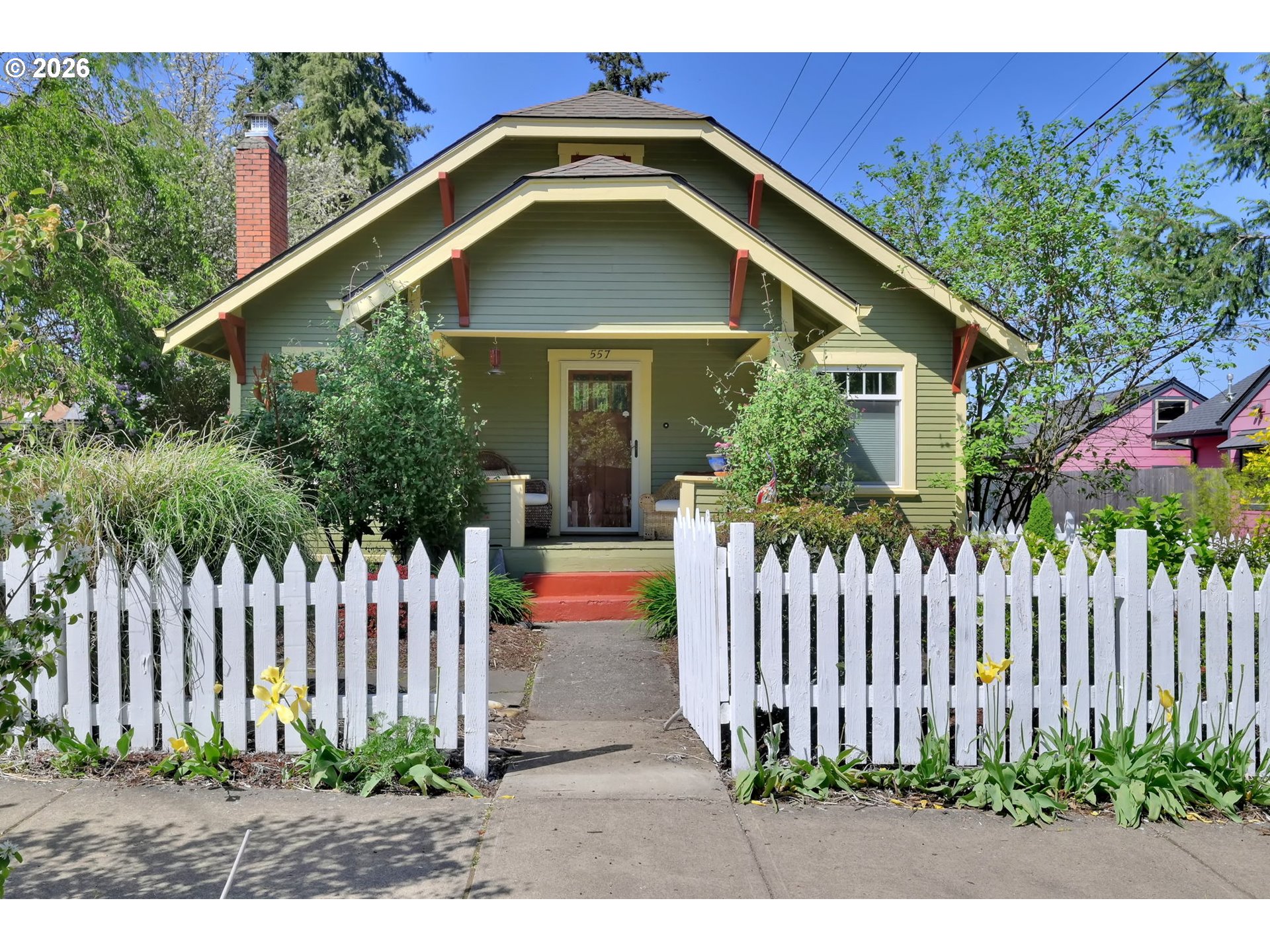 Sit under the covered front porch of this College Hill Bungalow and watch Spring unfold. Within the white picket fenced yard, the mature landscaping and perennial plants and shrubs are graced by paths. Step inside to newly refinished hardwood floors, the living room highlighted by the gas fireplace, tile surround and built-in bookshelves, and a dining area with a built-in hutch for entertaining. This home retains its charm and boasts a classically updated kitchen with butcher block countertops, subway tile backsplash, and apron front sink. A chefs delight with 6 burner gas range, pot filler, stainless vent hood, Kitchenaid refrigerator and Bosch dishwasher. A nook off the kitchen provides a casual eating space or work area and access to the lower level for laundry and storage. The main level has 2 bedrooms and 1 bath including a soaking tub and tile surround. Retreat upstairs to the generous primary bedroom which includes a sitting area, skylight, and closets with additional built- in cabinetry for storage. Home has Forced Air/Central Air for comfort year-round. Head outside to the backyard and enjoy the patio, raised garden beds, shed, space ready to go with wiring for a hot tub, covered parking space behind a gated fence off the alley. Schools: Adams, Roosevelt, South Eugene. Half a block to Washington Park and eateries.