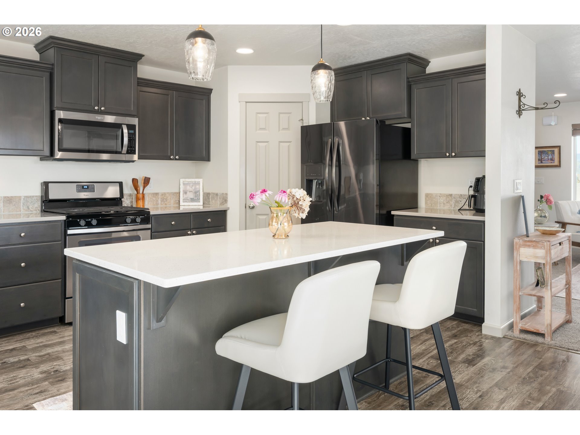Dishwasher, Disposal, FreeStandingGasRange, FreeStandingRefrigerator, Island, Microwave, Pantry, Quartz, Sol