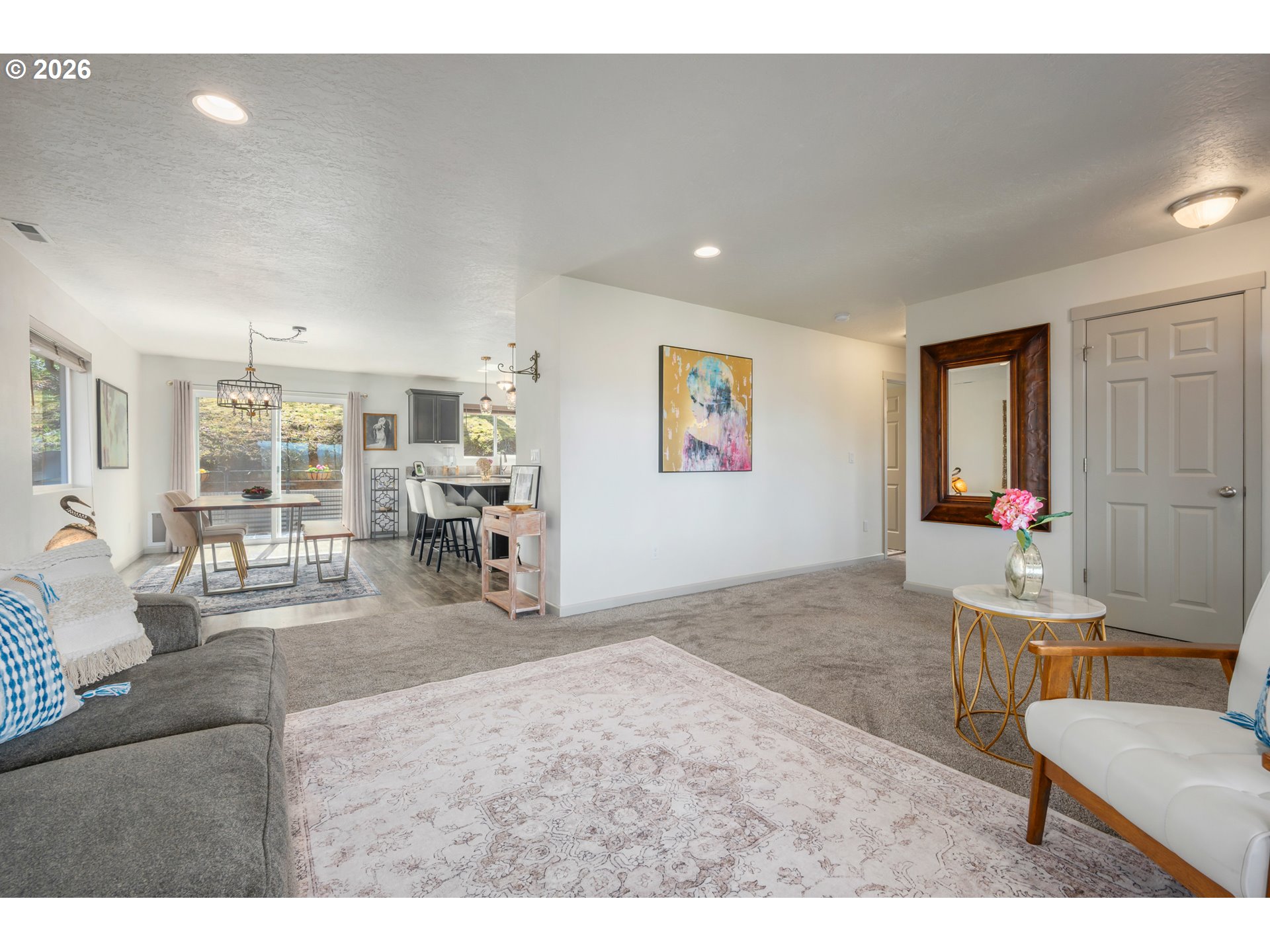Open House Sat 4/11 & Sun 4/12 from 1-3pm! Your New Favorite Spot to Watch the Sunset! This 4-bed, 2.5-bath home in the coveted Mountaingate neighborhood sits up high with jaw-dropping, panoramic views of the valley and Coburg Hills. Although the wraparound covered deck is where you'll spend most of your time enjoying the view, inside on the main level has everything you need day-to-day. The kitchen is sunny and spacious with quartz counters, a huge island, gas range, and a pantry. The dining room opens right up to the outdoors through a slider, so indoor-outdoor living is a breeze. The living room gives you plenty of room to stretch out, and the primary bedroom suite is conveniently located on this level w/ a walk-in closet, dual vanity & walk-in shower. Head upstairs and you've got three more bedrooms, a big family room with those same incredible views and the laundry room. You'll love the beautiful yet natural landscaping around the house featuring boulders, trees, blooming flowers, grassy areas, a dog run, an untouched backyard with hammock vibes, and full irrigation where it counts. Gas furnace, AC, two-car garage & flat area w/ plenty of parking up top. Come see this one before someone else claims this unbeatable view.